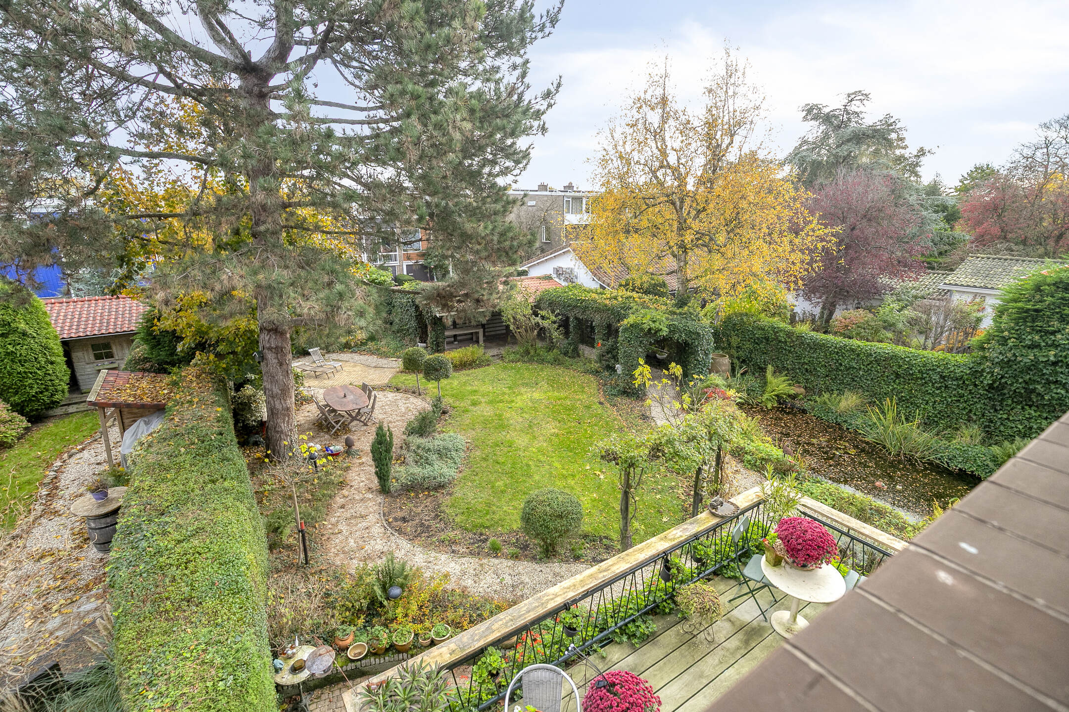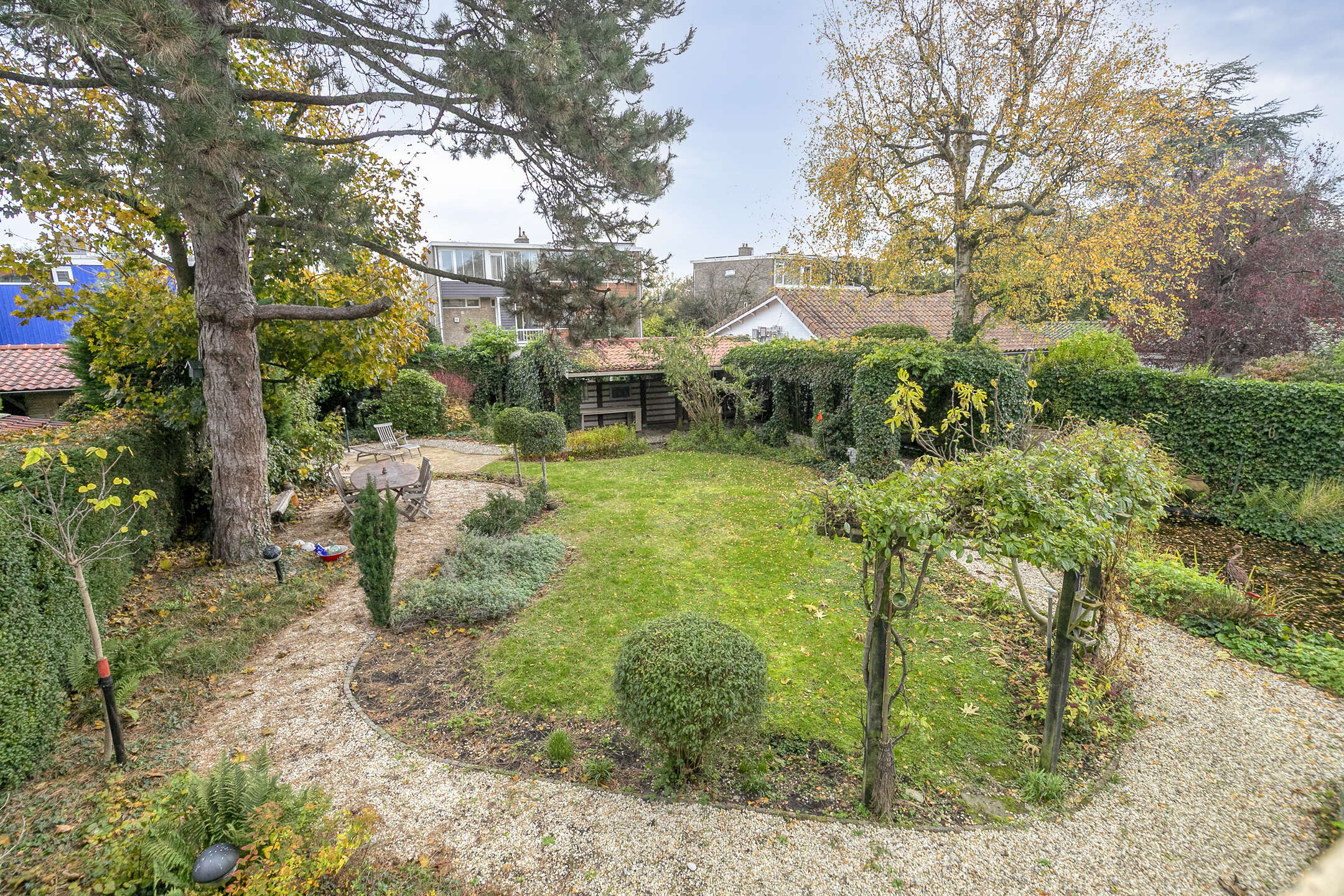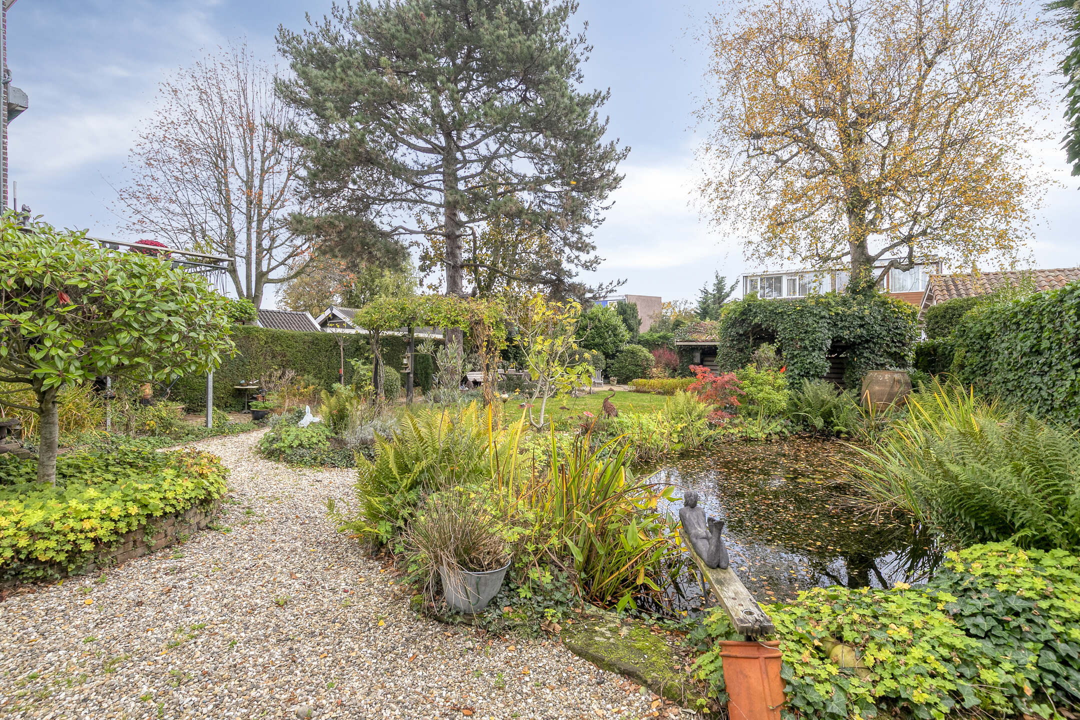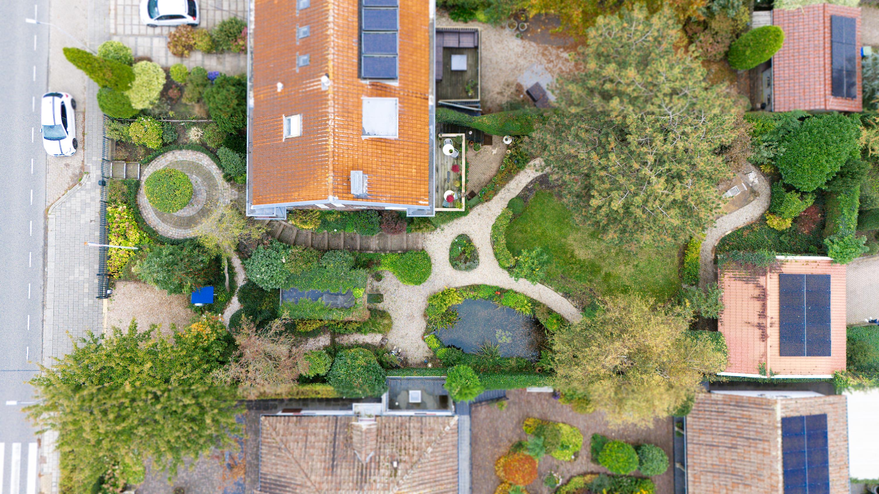 De tuin is groen, verzorgd en biedt veel privacy. Dankzij meerdere terrassen kun je op elk moment van de dag genieten van zon of schaduw. De vijver zorgt voor een ontspannen sfeer.