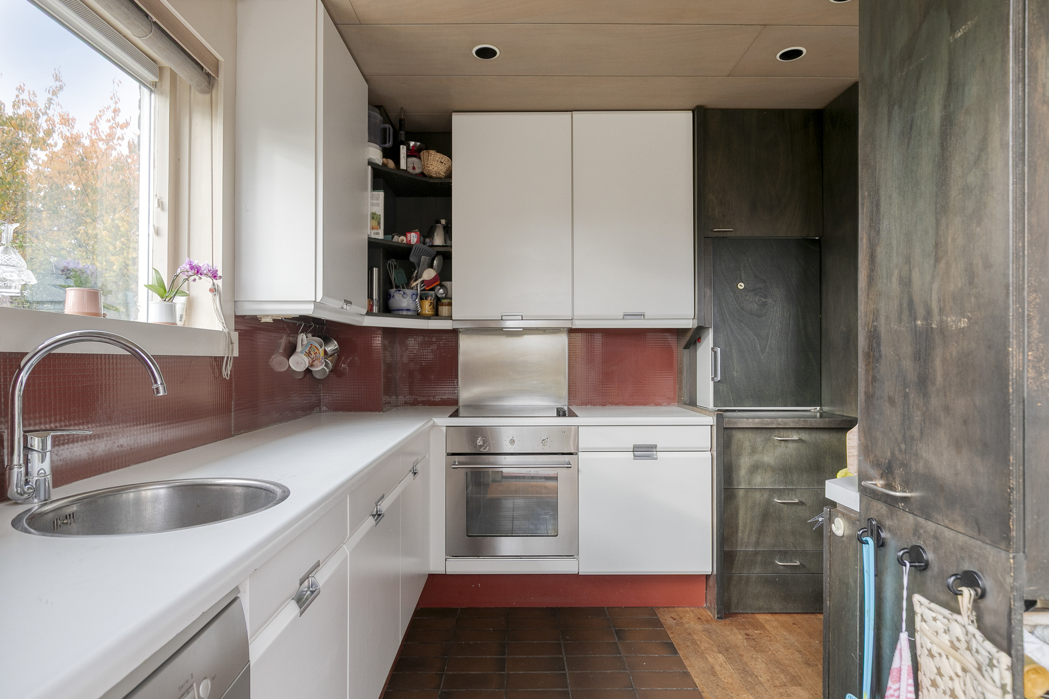 Aan de achterzijde ligt de keuken, uitgerust met een koelkast, vaatwasser, oven en inductiekookplaat. Ook is er een elektrisch zonnescherm over de volledige breedte van de woning aanwezig.
