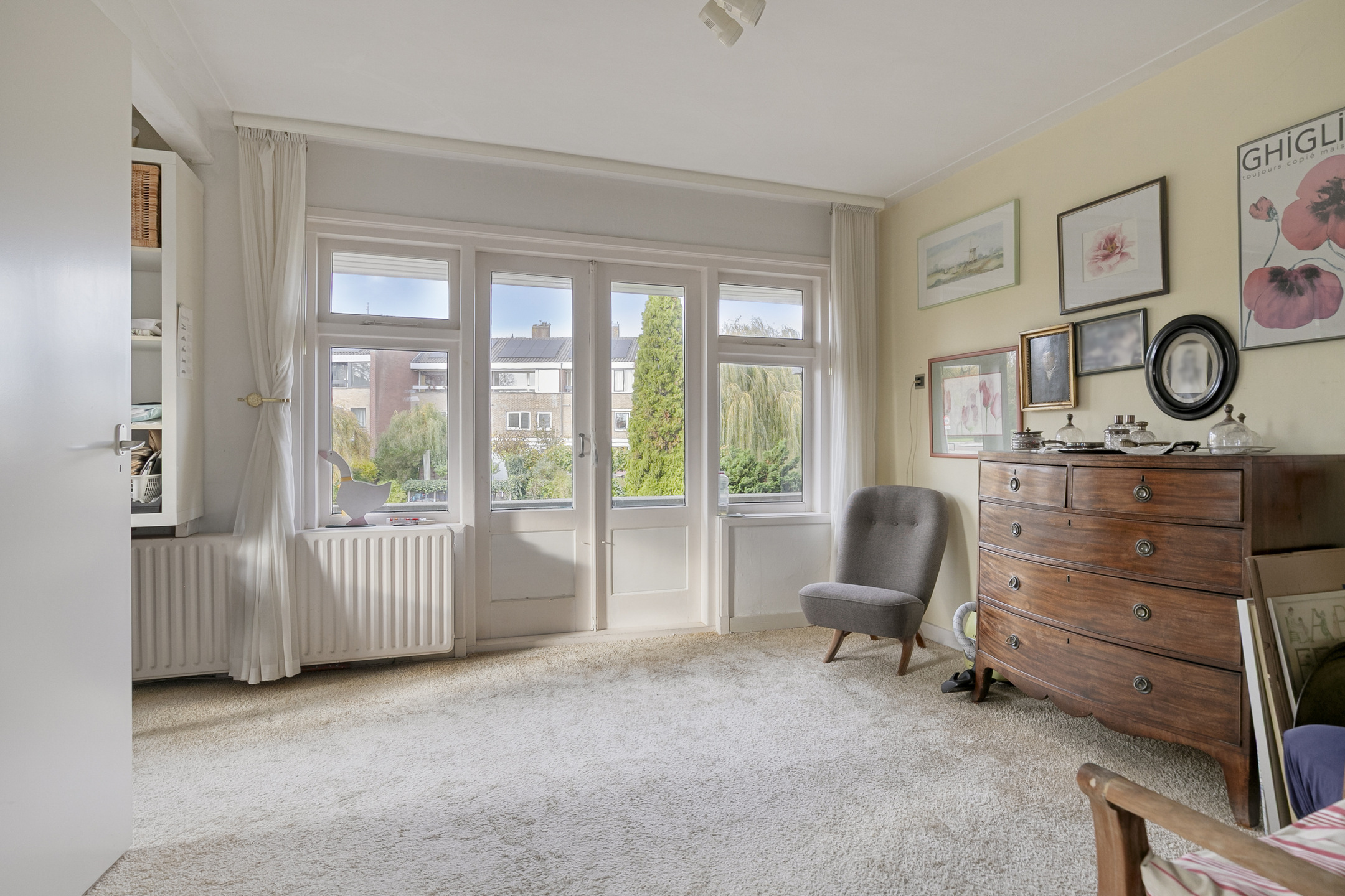 De ruime slaapkamer heeft toegang tot balkons aan zowel de voor- als achterzijde en is voorzien van airconditioning. Voorheen waren dit twee slaapkamers, wat eenvoudig weer te realiseren is.