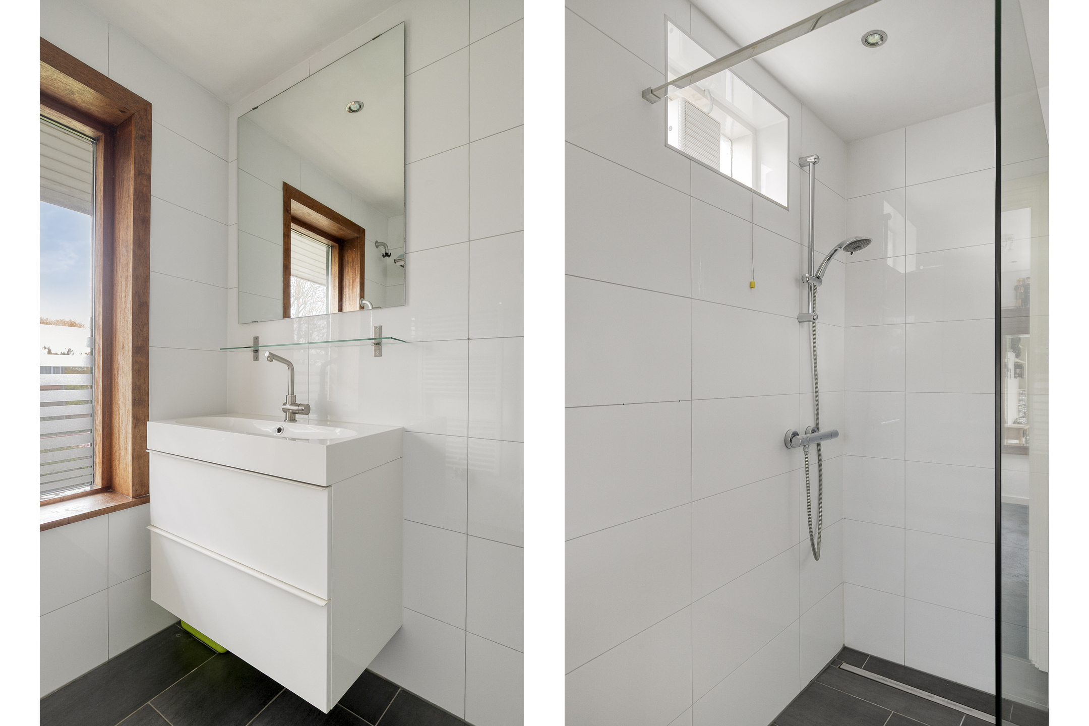 De nette badkamer beschikt over een douche, wastafel en handdoekradiator.