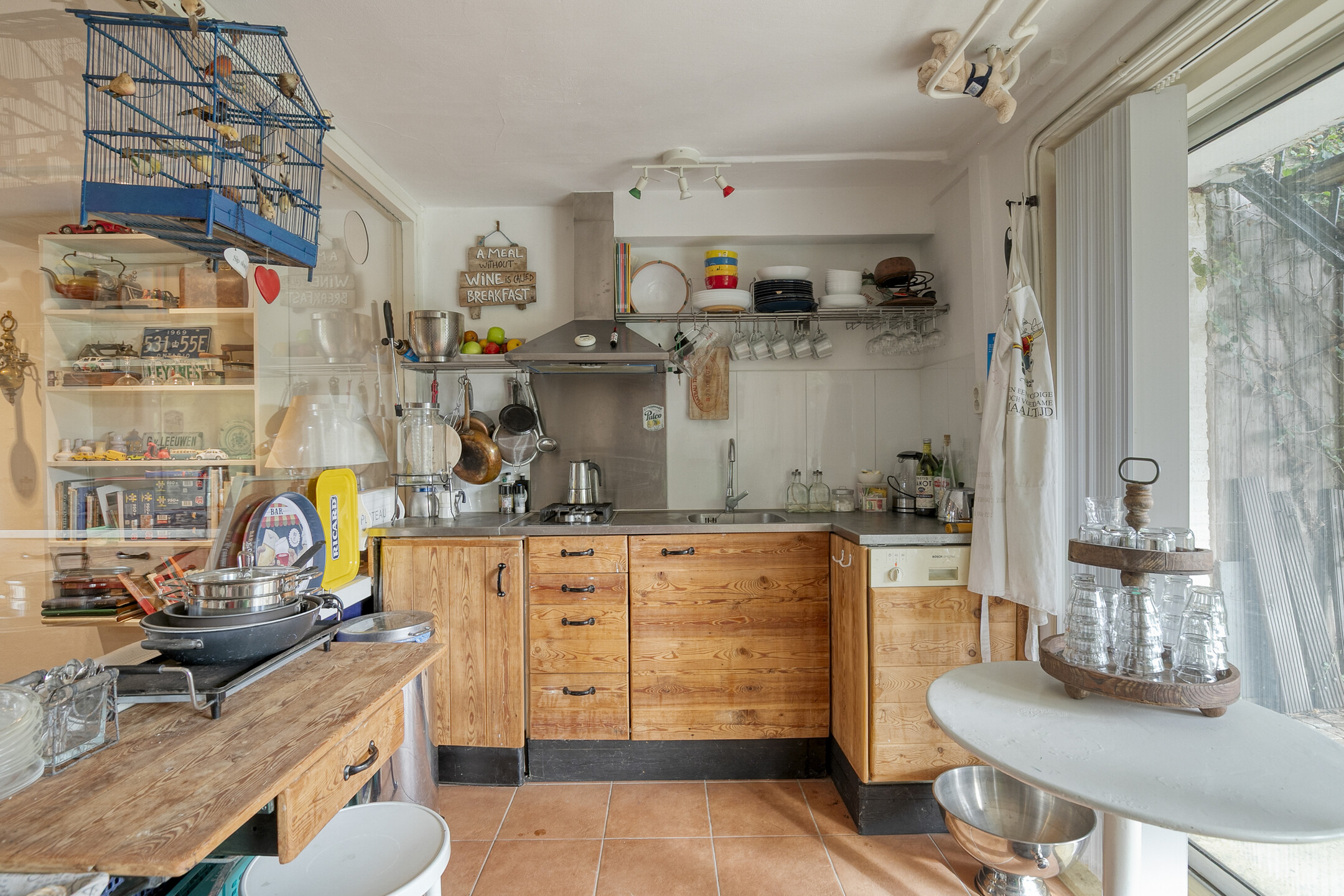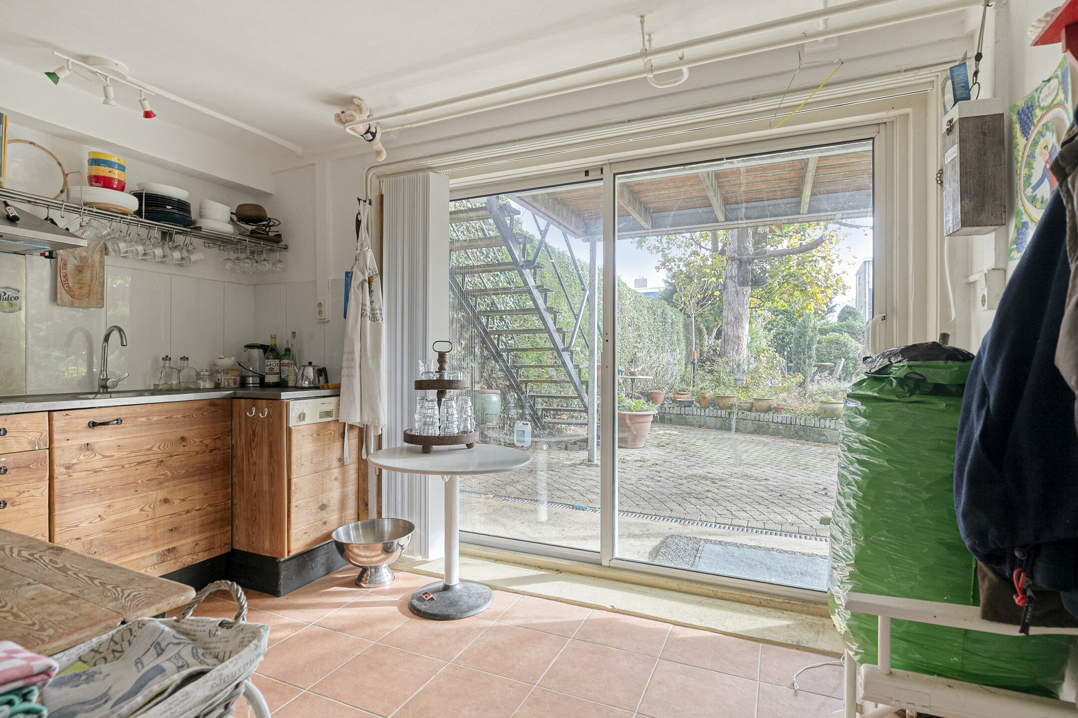 Vanuit zowel de keuken als de eethoek heb je toegang tot het terras, dat uitkijkt op de groene, fraai aangelegde achtertuin.