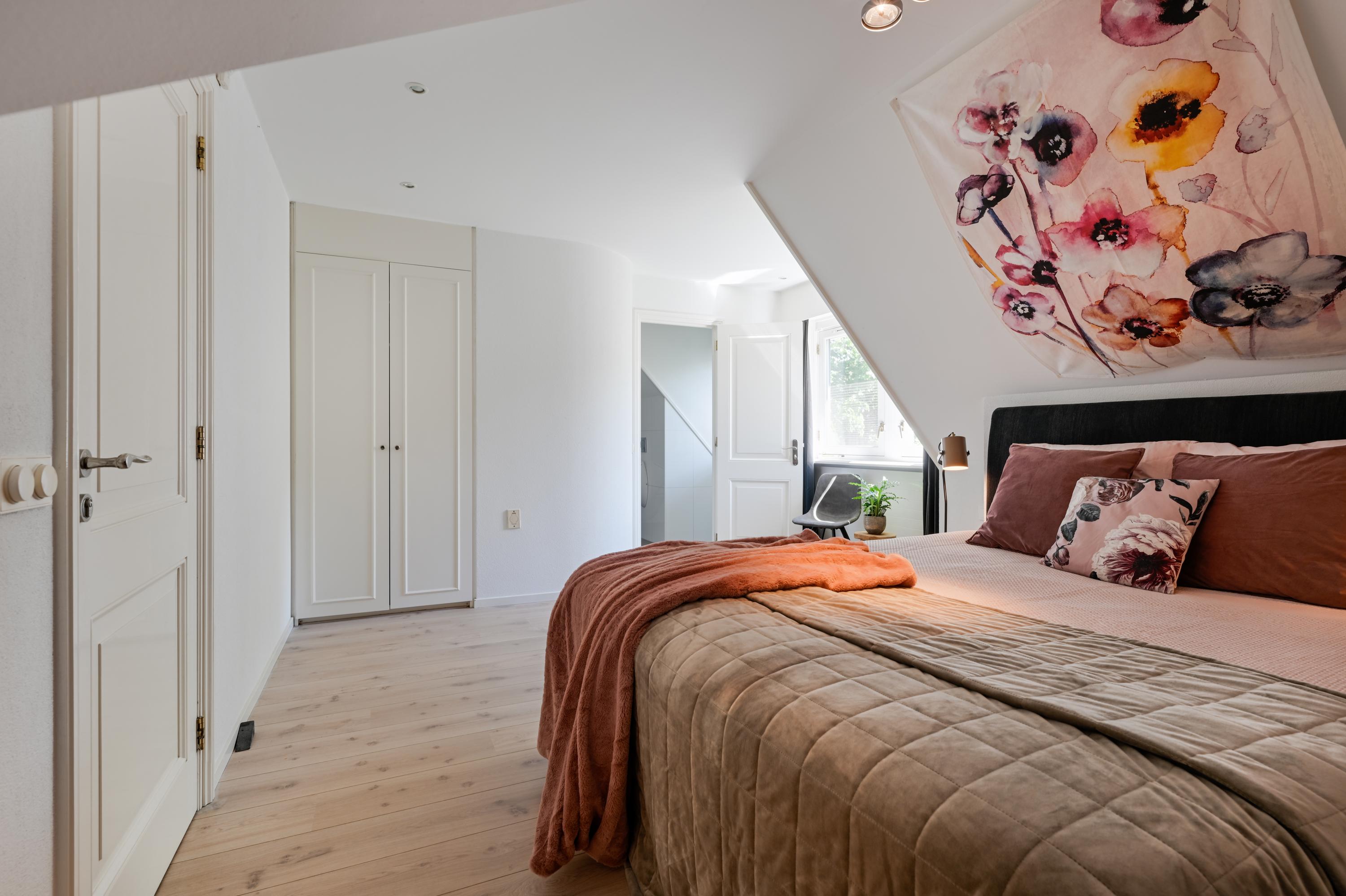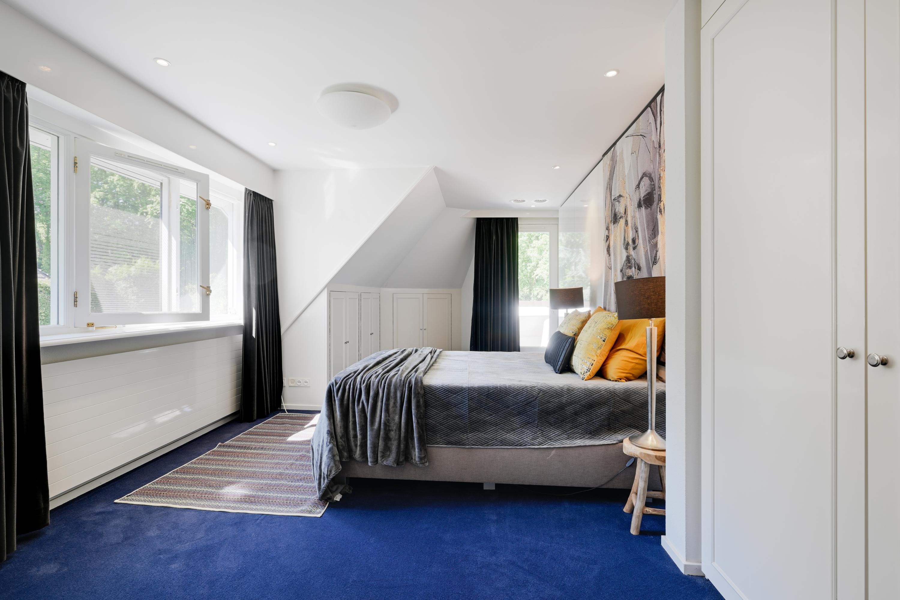 Hal met bordestrap en lift, werkkamer met ronde erker met prachtig uitzicht, ruime slaapkamer met toegang tot balkon, tweede grote (ouder-)slaapkamer met beschut balkon met fraai uitzicht over de tuin, gang naar kleedkamer en eigen badkamer met ligbad, douche, dubbele wastafel in meubel, urinoir en toilet, vloerverwarming. Derde slaapkamer en vierde slaapkamer beide met dakkapel en beide met toegang naar badkamer met bad, douche, toilet, urinoir, wastafelmeubel en vloerverwarming.