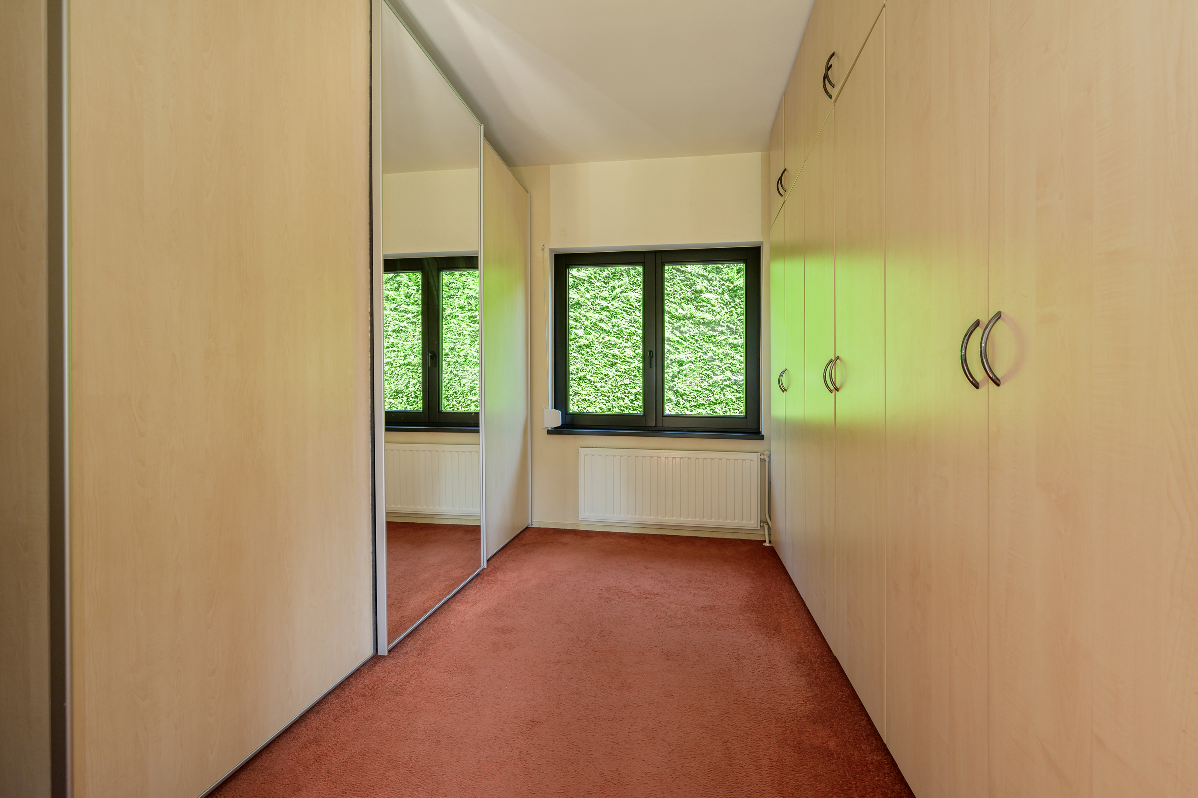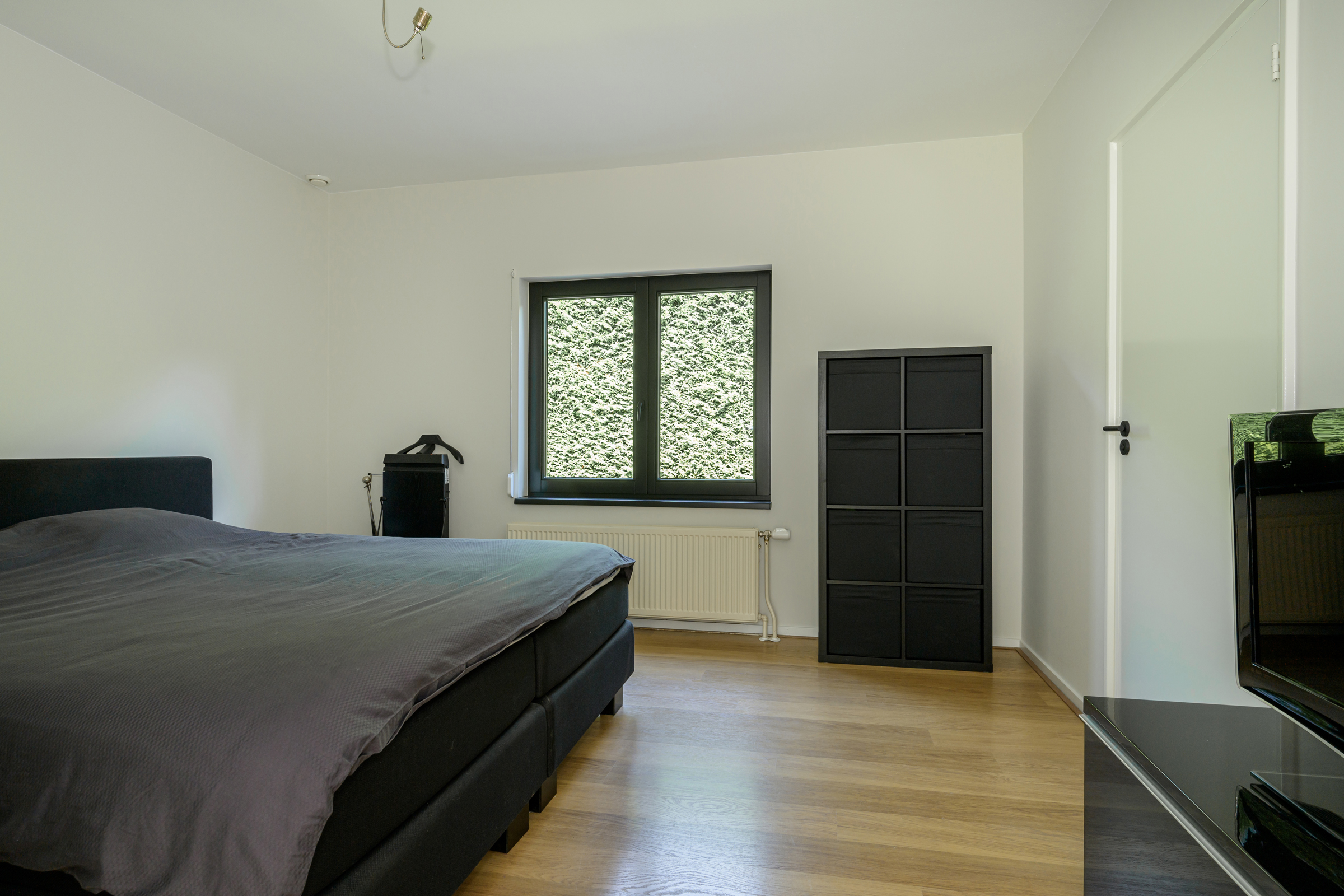 Slaapkamer met twee inbouwkasten en toegang tot aangrenzende badkamer. Deze slaapkamer is aan de zijkant van de woning gesitueerd.