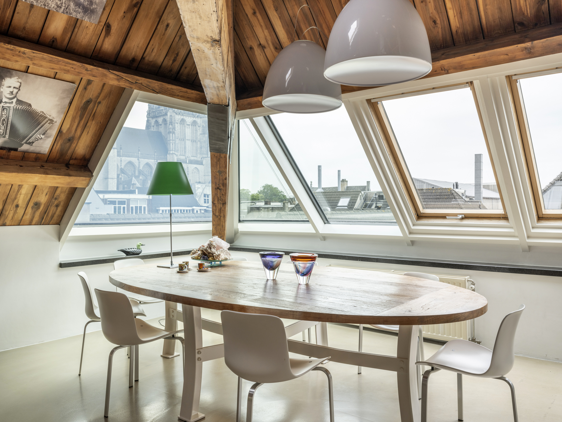 Bijzonder riante living (ca. 60m²) met open keuken. De ruimtelijke beleving is uniek, door de in het zicht gebleven hoge kapconstructie én de grote glaspartij aan de achterzijde, een raampartij die onder andere fantastisch uitzicht op de Grote kerk van Breda biedt.