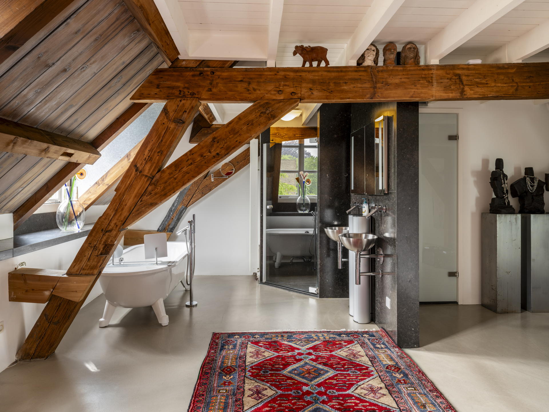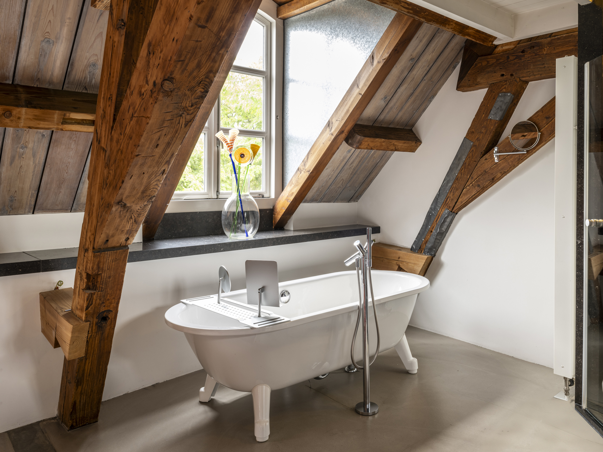 De slaap- en badkamer treft u aan de andere zijde van de eerdergenoemde hal. Het riante slaapgedeelte (totaal ca. 55 m²) is gelegen aan de kant van het Kasteelplein. Ook in de slaapkamer heeft u volledig zicht op de intact gehouden monumentale kap. In deze kamer zijn twee zeer ruime inloopkasten aanwezig.
