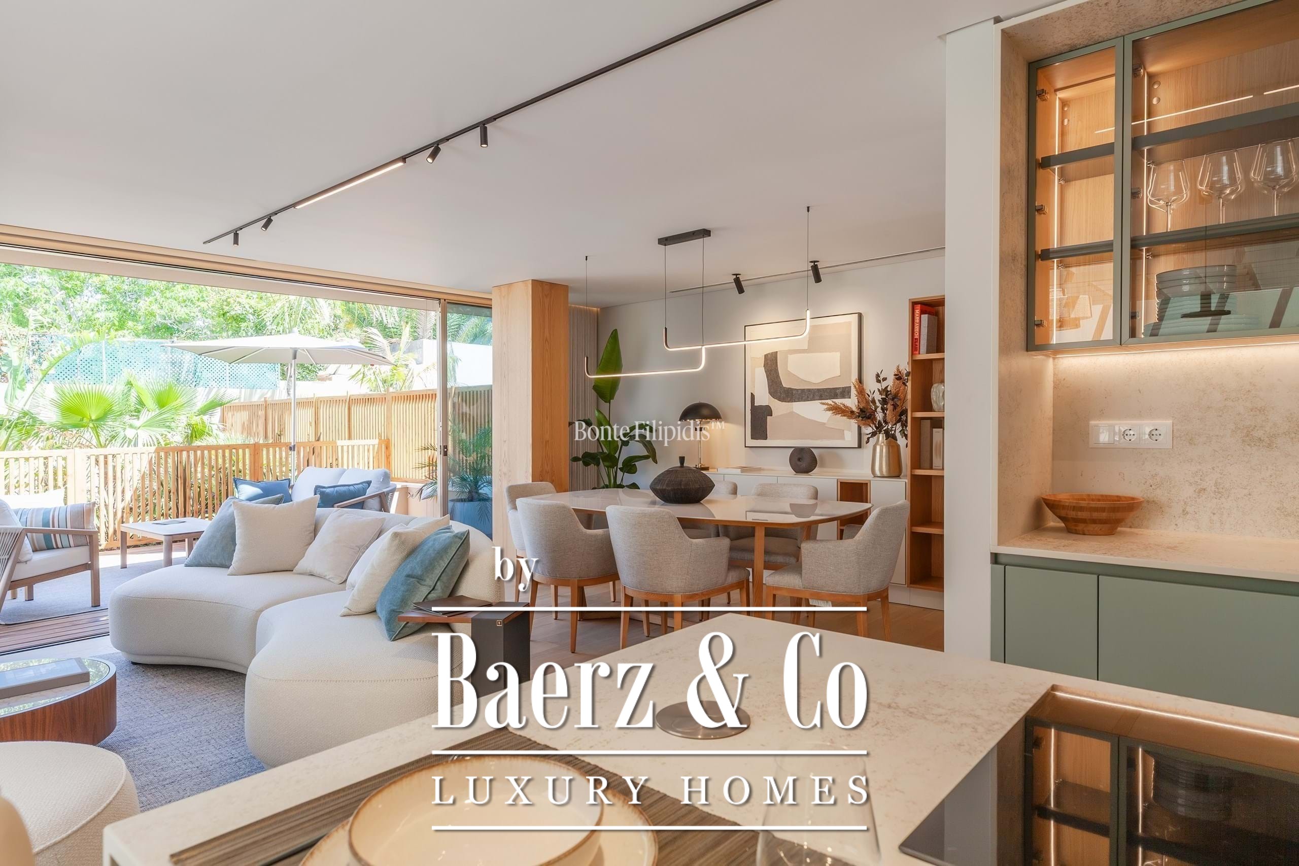 De woning beschikt over vier slaapkamers en vijf badkamers. De suite op de begane grond verwelkomt gasten of leent zich uitstekend als werkruimte. De hoofdsuite op de eerste verdieping is voorzien van een inloopkast; verder zijn er twee extra slaapkamers en een badkamer. Licht valt rijkelijk binnen in de royale, open leefruimte waar wonen, dineren en koken naadloos in elkaar overlopen. Miele apparatuur, een BORA kookplaat, een wijnkoelkast en een vrijstaande wasruimte zorgen voor verfijning in het dagelijks ritme.