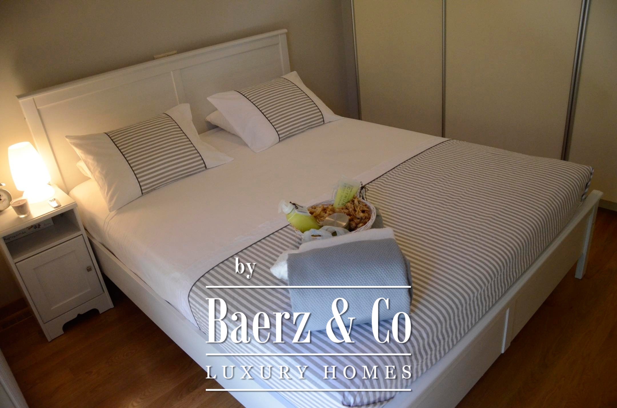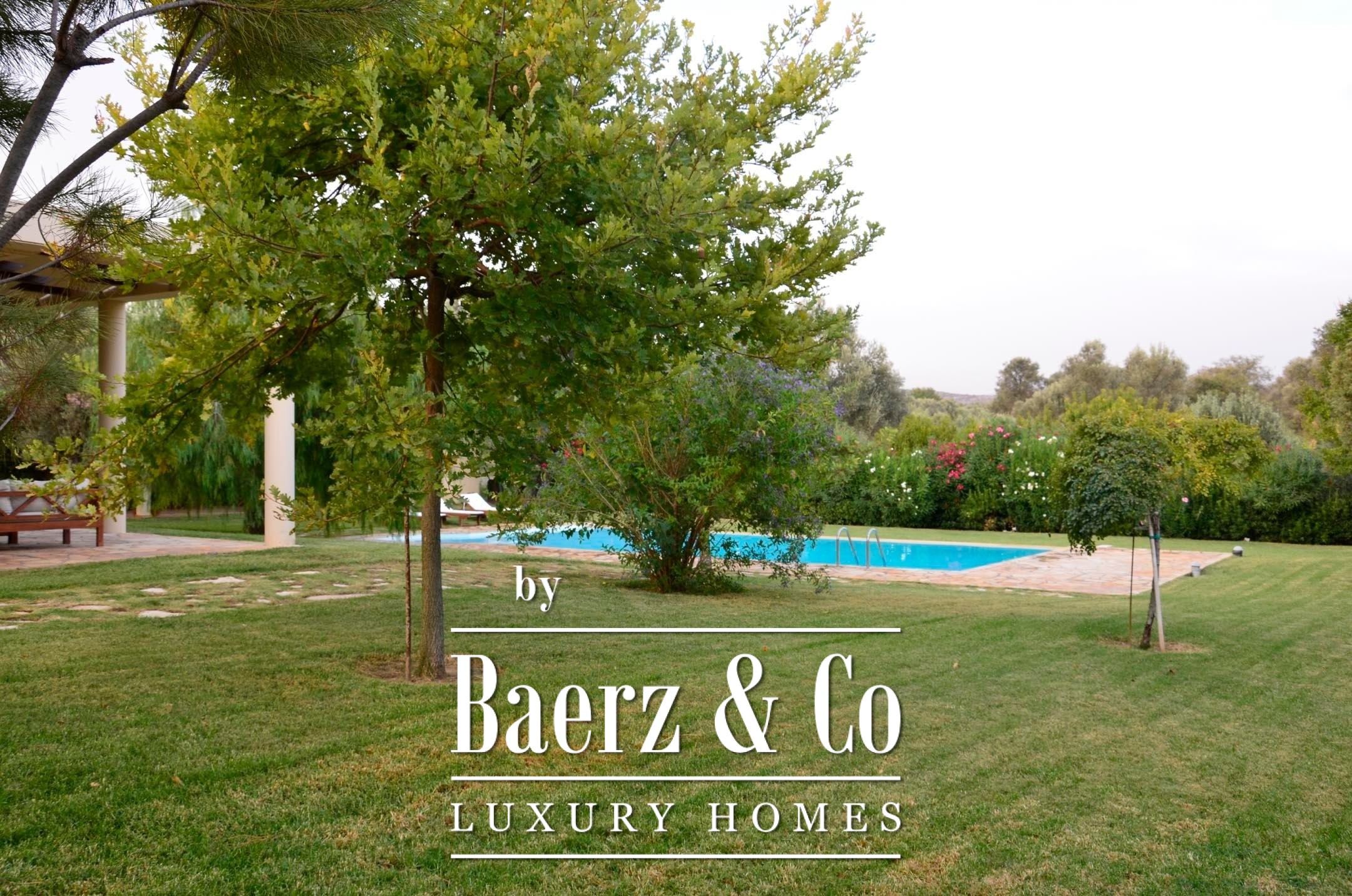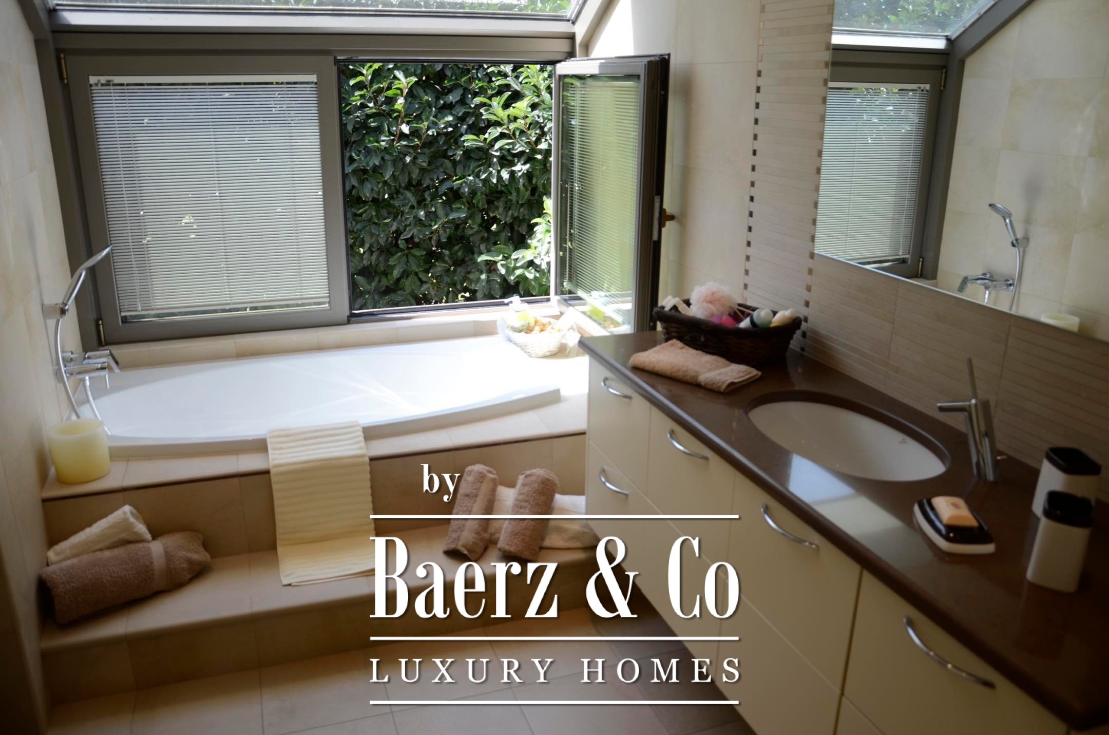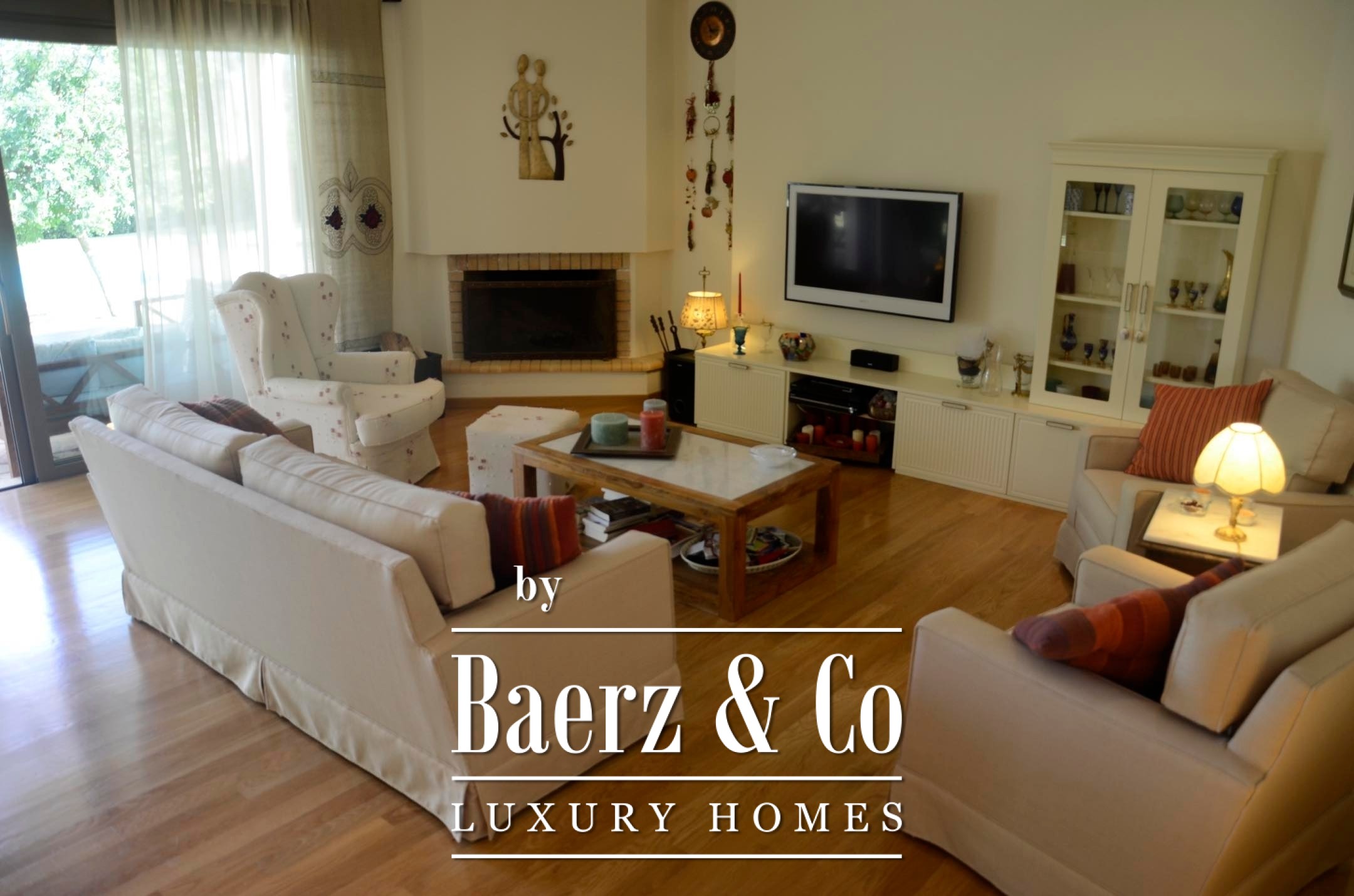 Outdoors, the property reveals a serene private environment with a 72 sq.m. swimming pool, landscaped gardens, and open spaces ideal for relaxation and entertaining. The setting offers unobstructed views and a strong sense of calm, enhanced by the surrounding greenery and the low-density character of the neighborhood. Additional features include a basement garage, storage areas, boiler room, playroom, perimeter fencing, and a full range of modern comforts such as autonomous oil heating, air conditioning, solar water heater, alarm system, security door, double glazing, insect screens, awnings, and built-in wardrobes.
