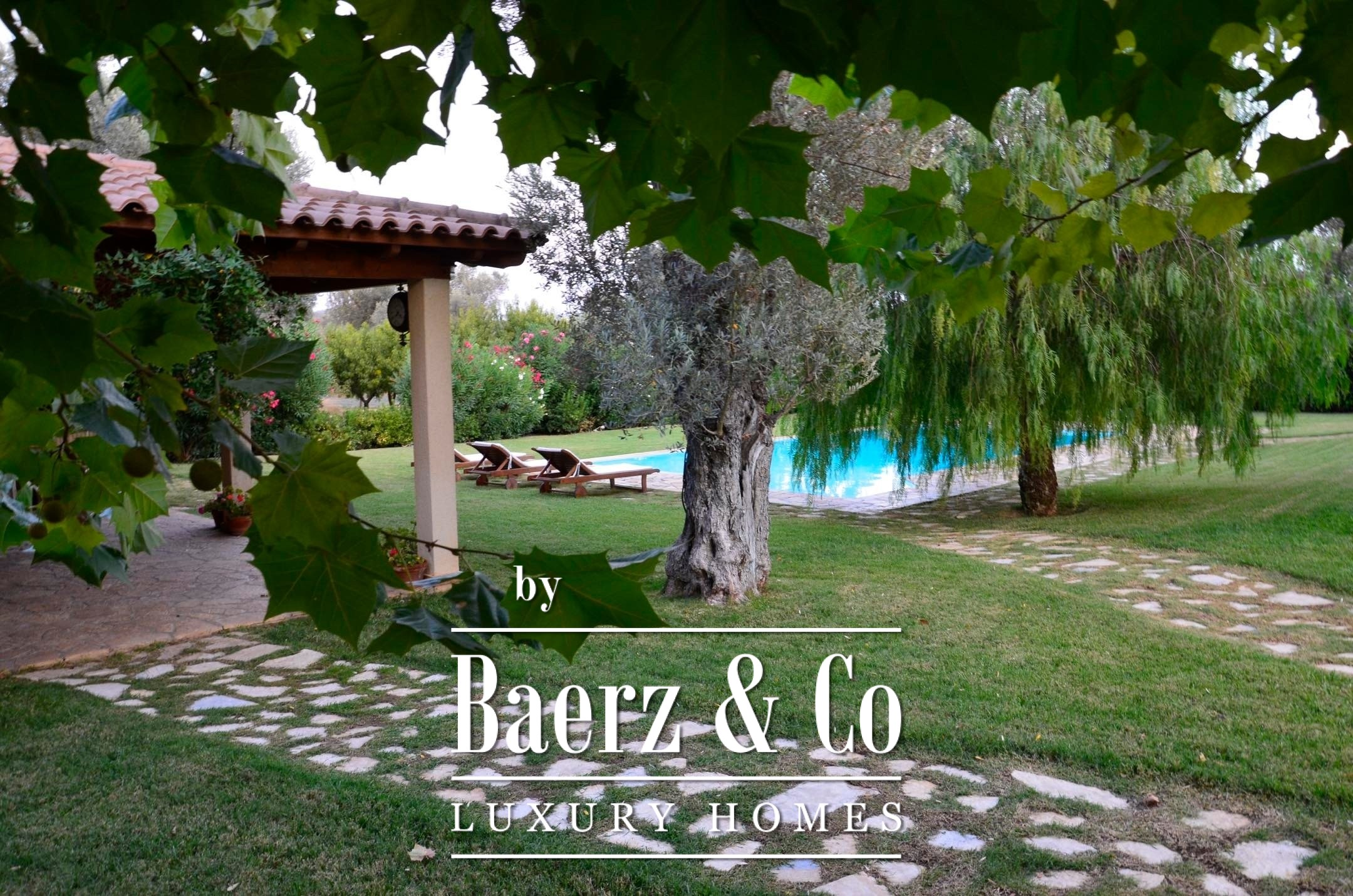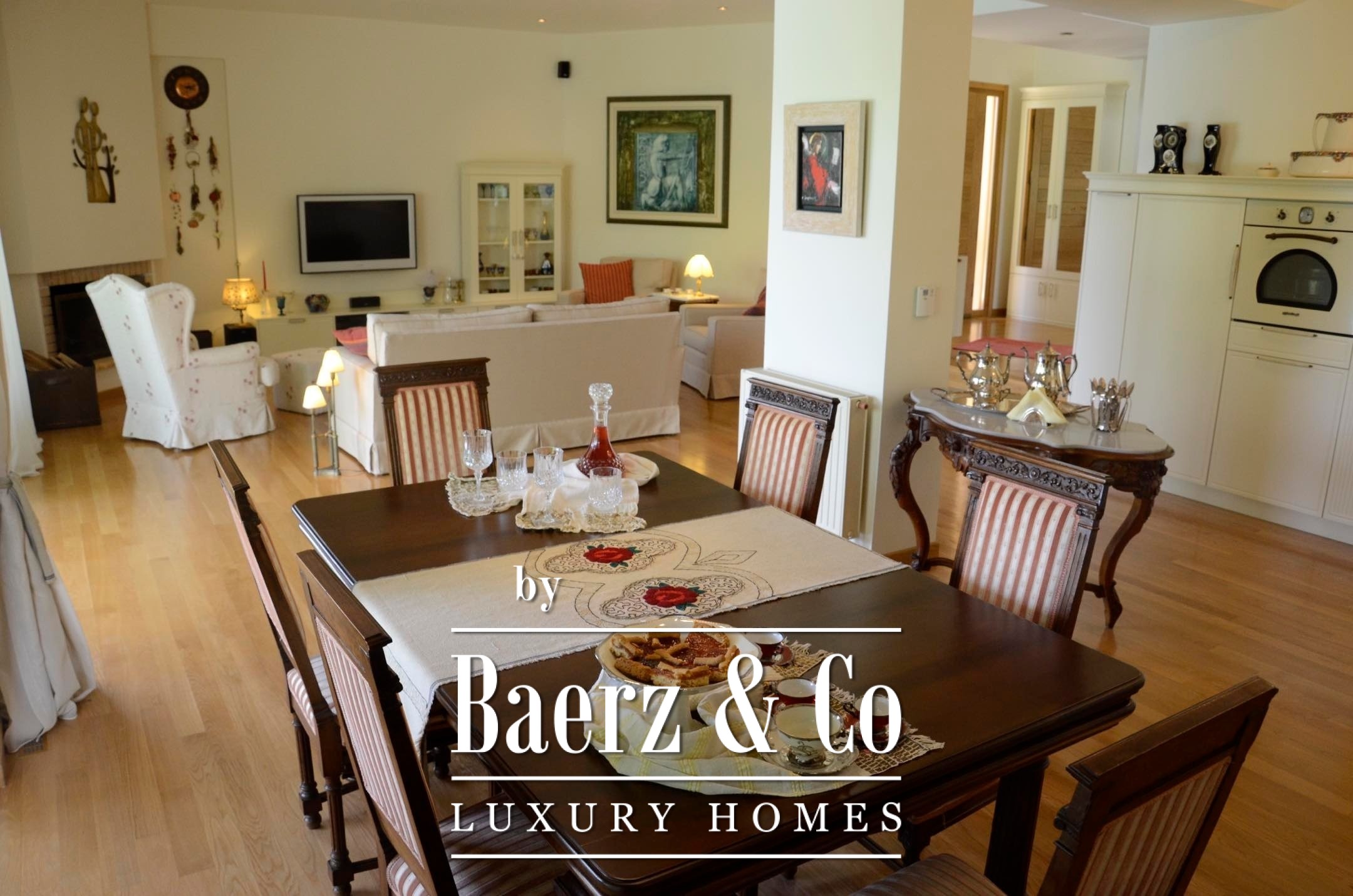 The residence unfolds across three levels with a total surface of 400 sq.m., set on an expansive 4,010 sq.m. plot. Designed with elegance and functionality in mind, it features six bedrooms, two fully equipped kitchens, two generous living rooms with fireplaces, four bathrooms, and an attic, all connected by a beautifully crafted internal wooden staircase. Natural light floods the interiors, while the layout offers flexibility, privacy, and comfort for both family living and hosting guests.