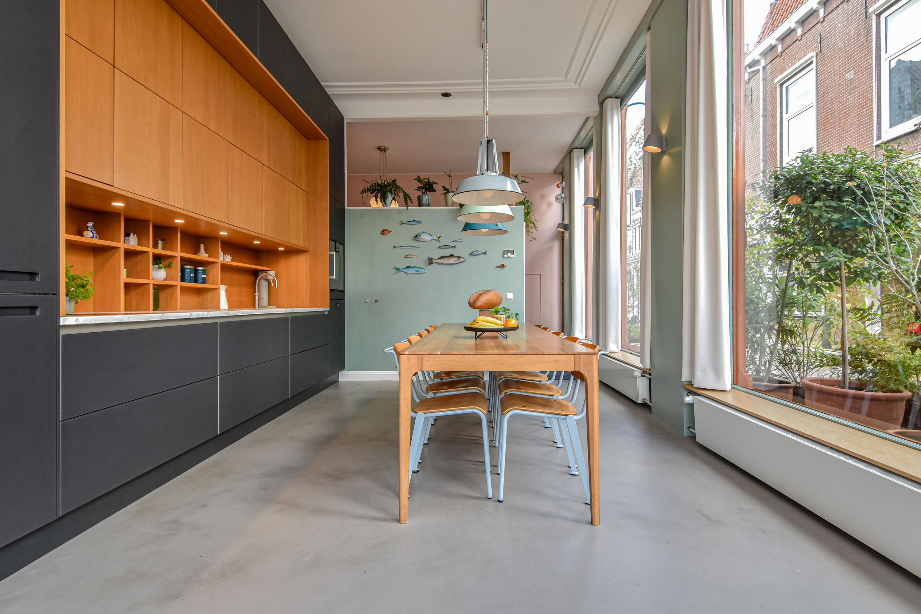 Bij binnenkomst word je direct verrast door de prachtige woonkeuken met haar indrukwekkende hoge glazen puien en een plafondhoogte van maar liefst 3,55 meter. In het plafond zit de originele gestucte sierlijst. De ruimte baadt in het licht en biedt volop plek voor een royale eettafel. De stijlvol afgewerkte keuken vormt het hart van de woning: een fijne ruimte met luxe inbouwapparatuur, waar je met plezier kookt en gasten ontvangt.
