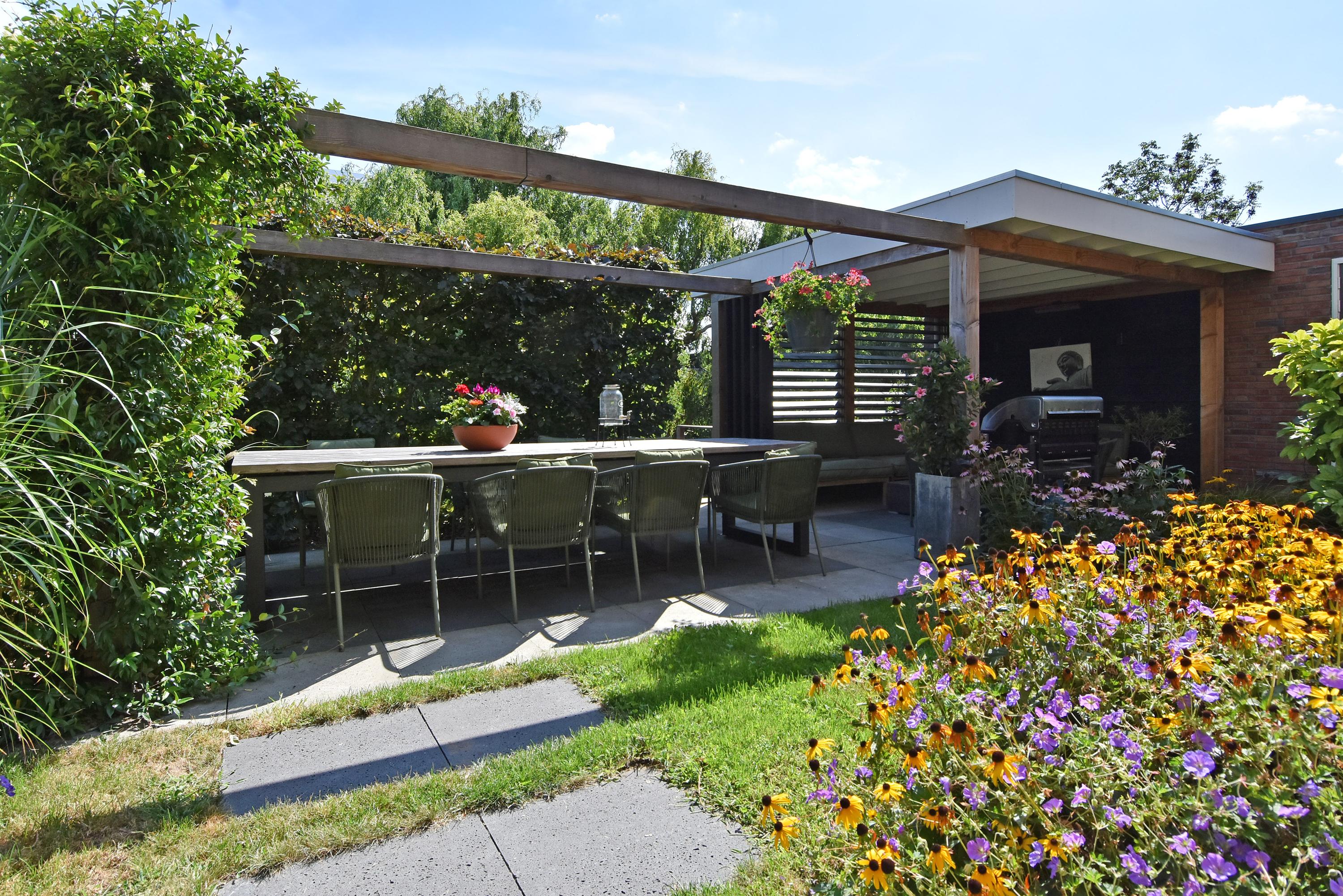 Vanuit de ruime hal kom je de sfeervolle, lichte living binnen. Deze vormt door de grote schuifpui een prachtige verbinding met de zonnige tuin. De tuin is recent fraai aangelegd en voorzien van veel groen, een gazon een zonnig terras, een veranda en overkapping: een heerlijke plek om het hele jaar door te genieten en relaxen. De tuin grenst aan het water.