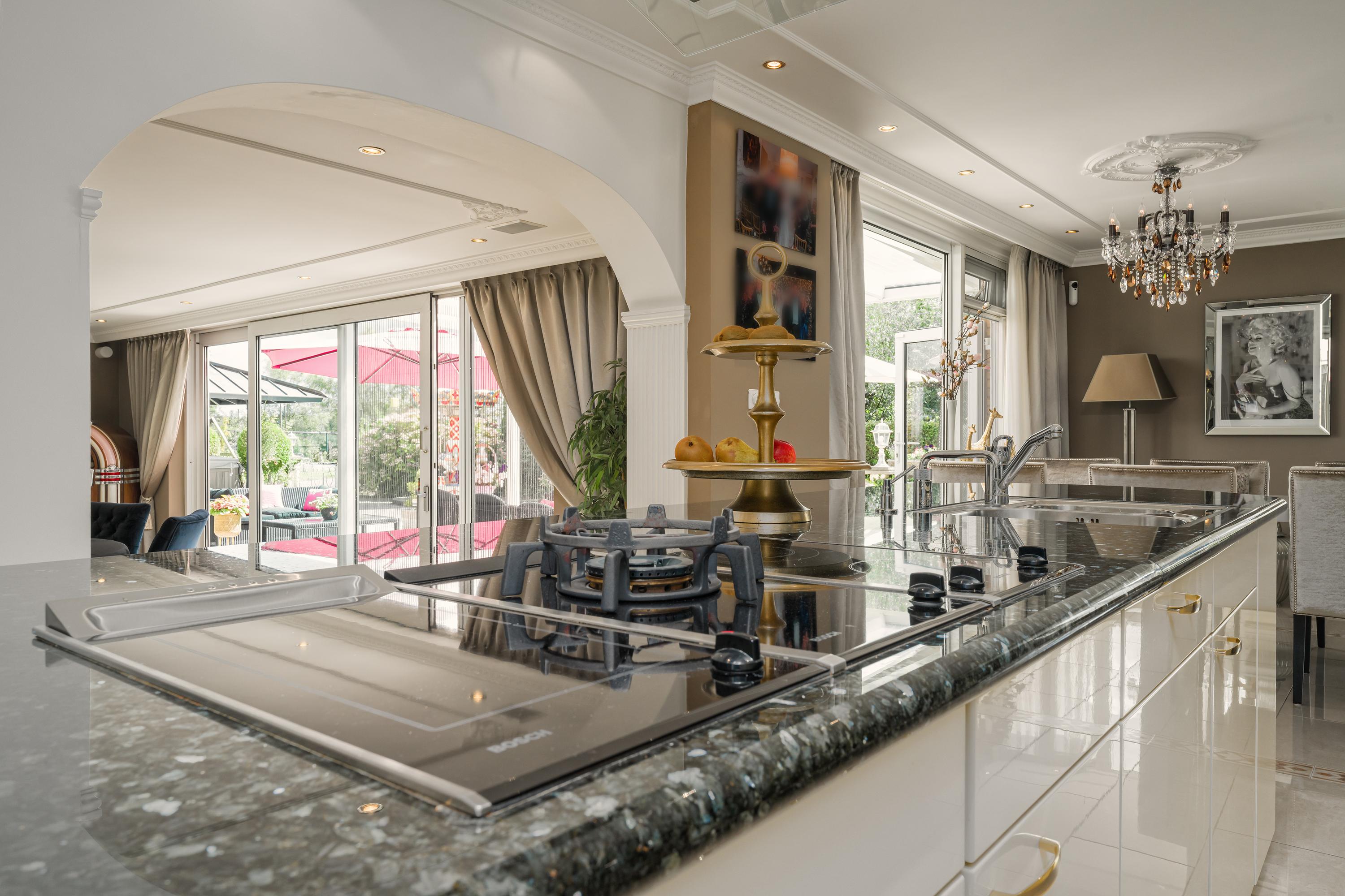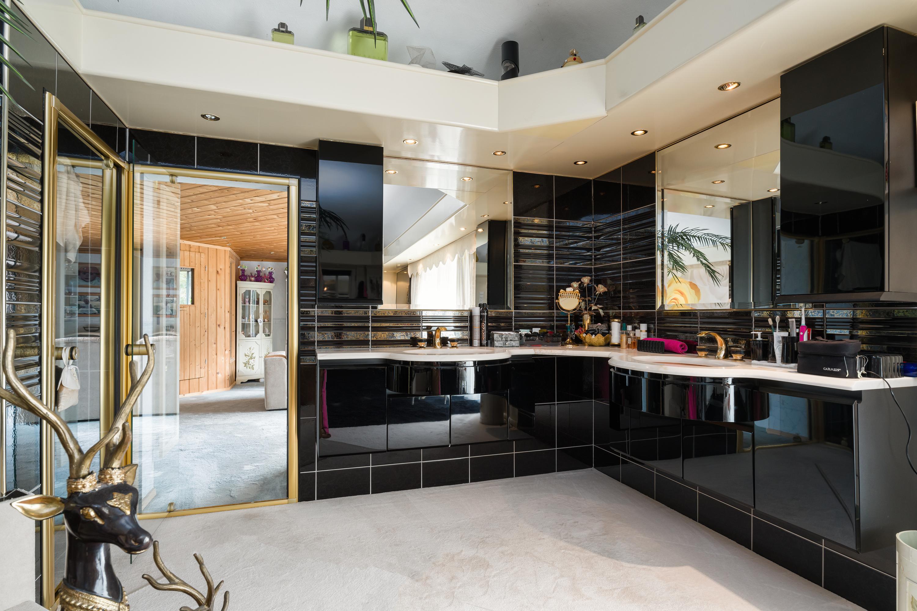 Zij-entree, hal, eetkamer, grenzend aan de tuin / het terras, open keuken met eiland, living met erker en open haard, bijkeuken, badkamer 1, trapopgang naar de verdieping. Masterbedroom met open 2e badkamer, doorgang naar de ruime wellness ruimte met sauna en kledingkasten. Ook vanuit de masterbedroom en de wellness ruimte heb je toegang tot de tuin via de ruime puien.