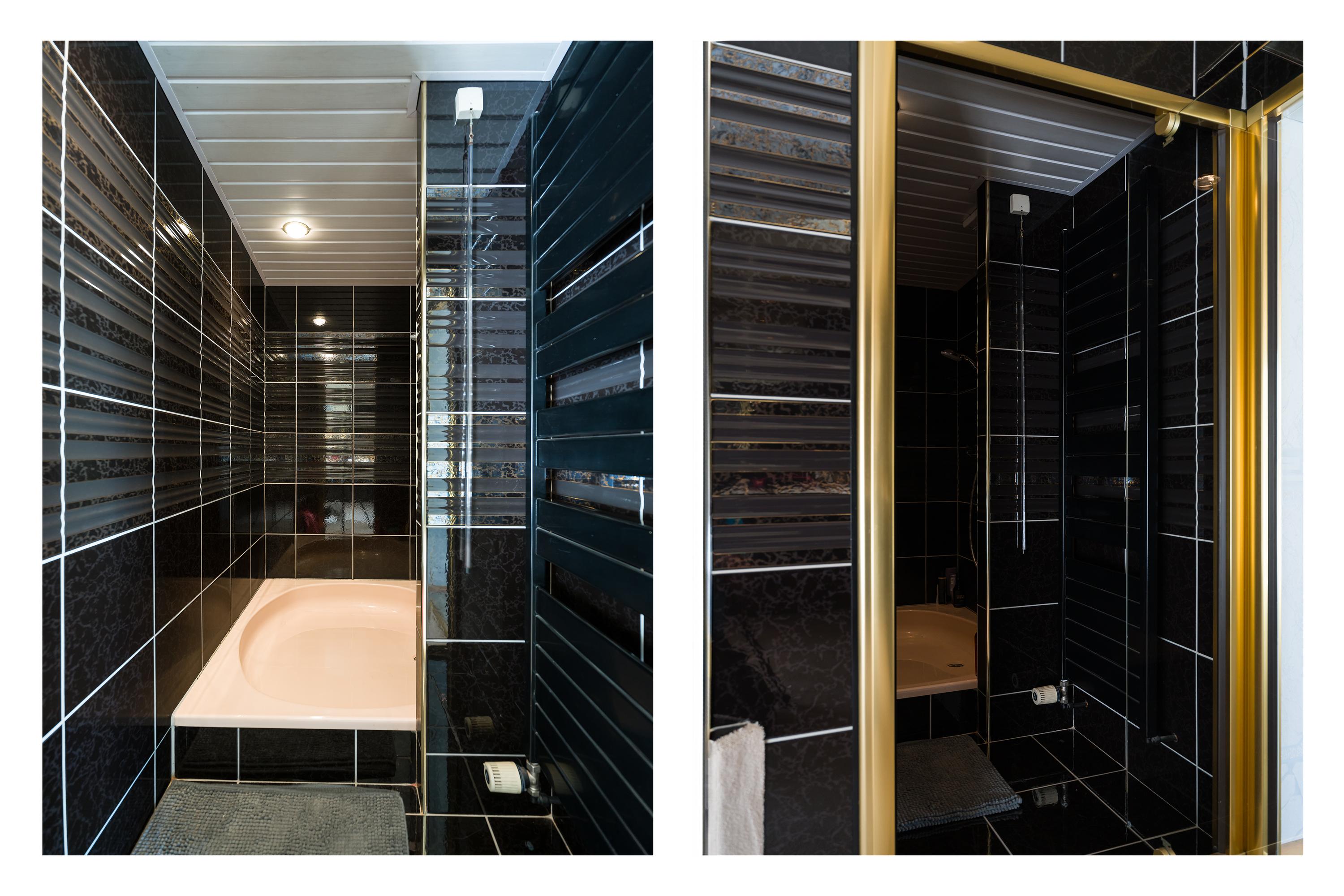 Zij entree, onder de dubbele carport, open keuken, douche, living, slaapkamer.