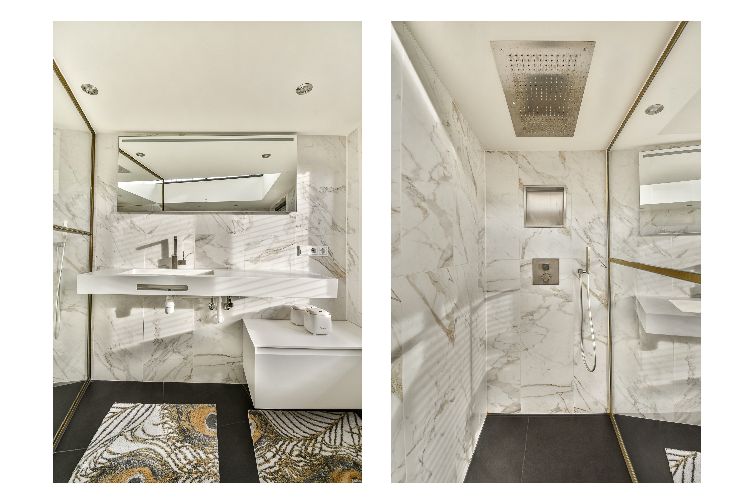 De badkamer is luxe afgewerkt met een fraaie lichtinval, een ligbad, een inloopdouche en een wastafelmeubel. Een vaste kast met opstelplaats CV-combiketel.