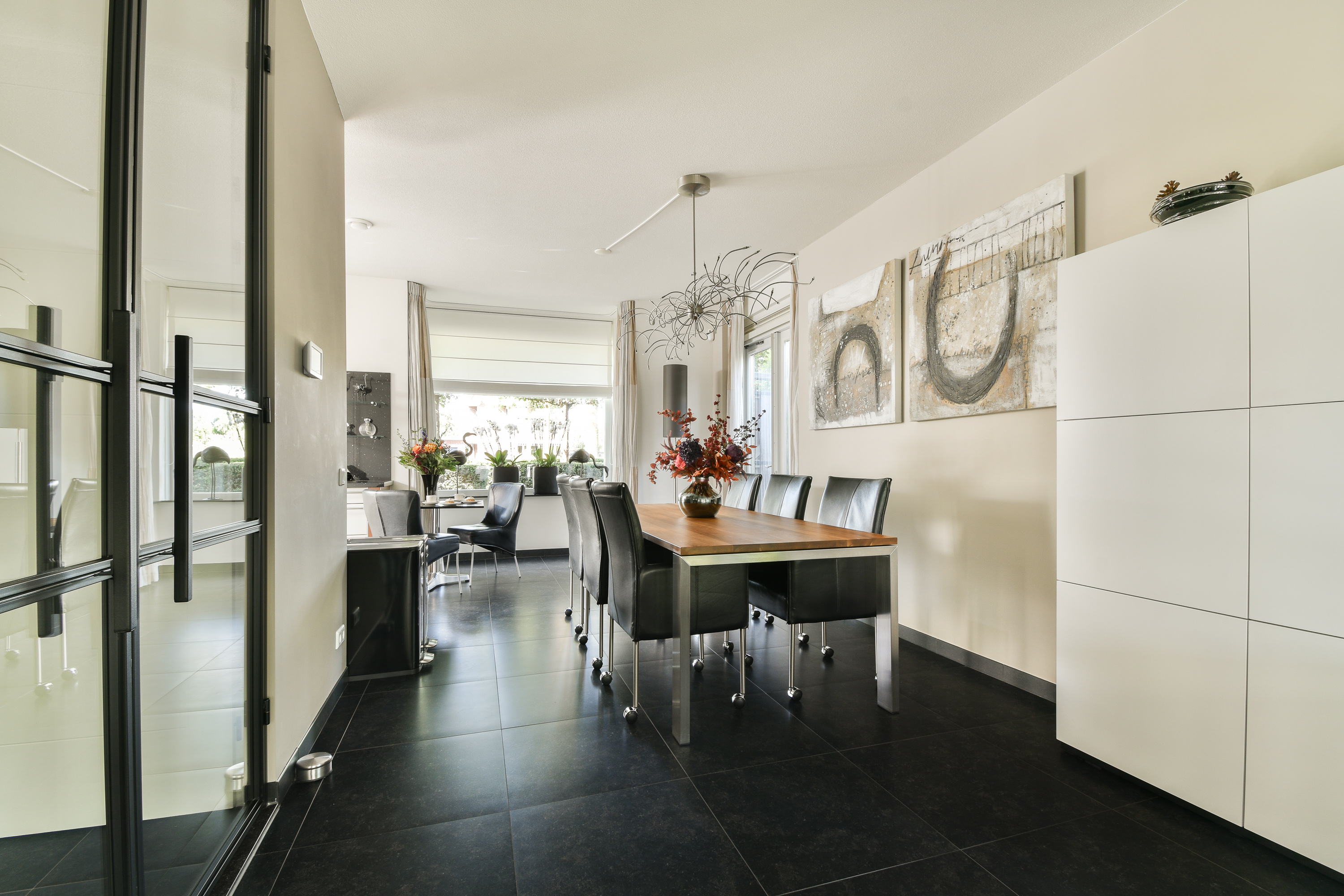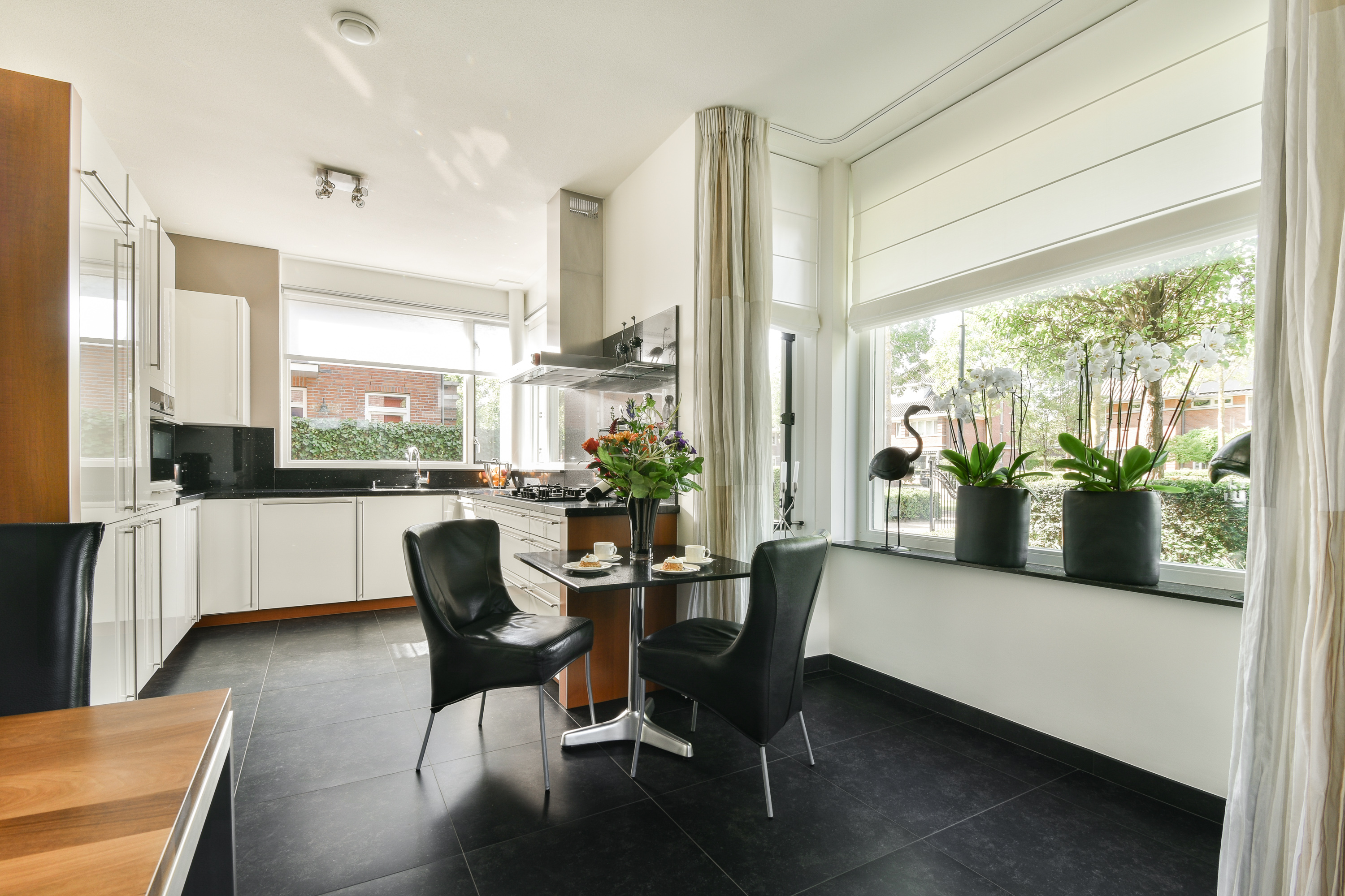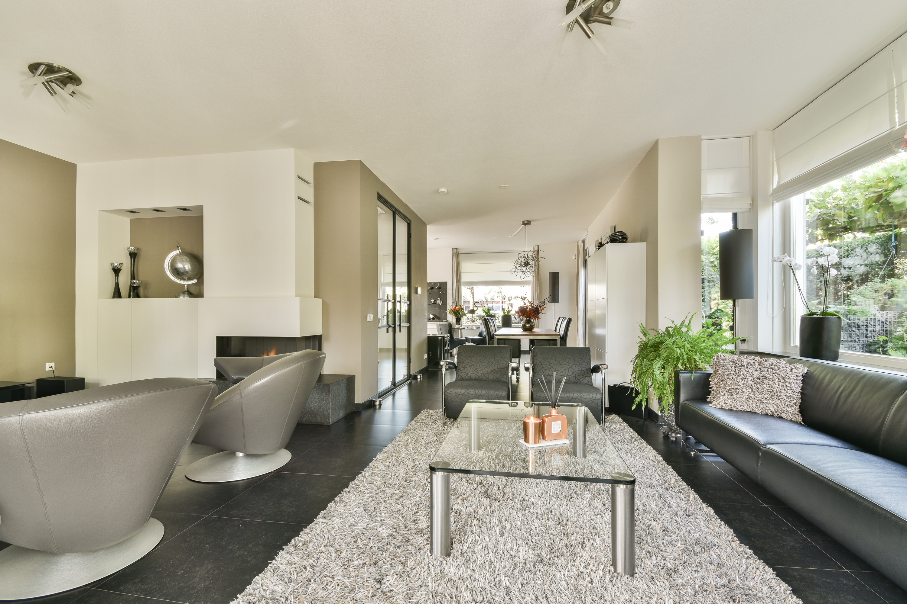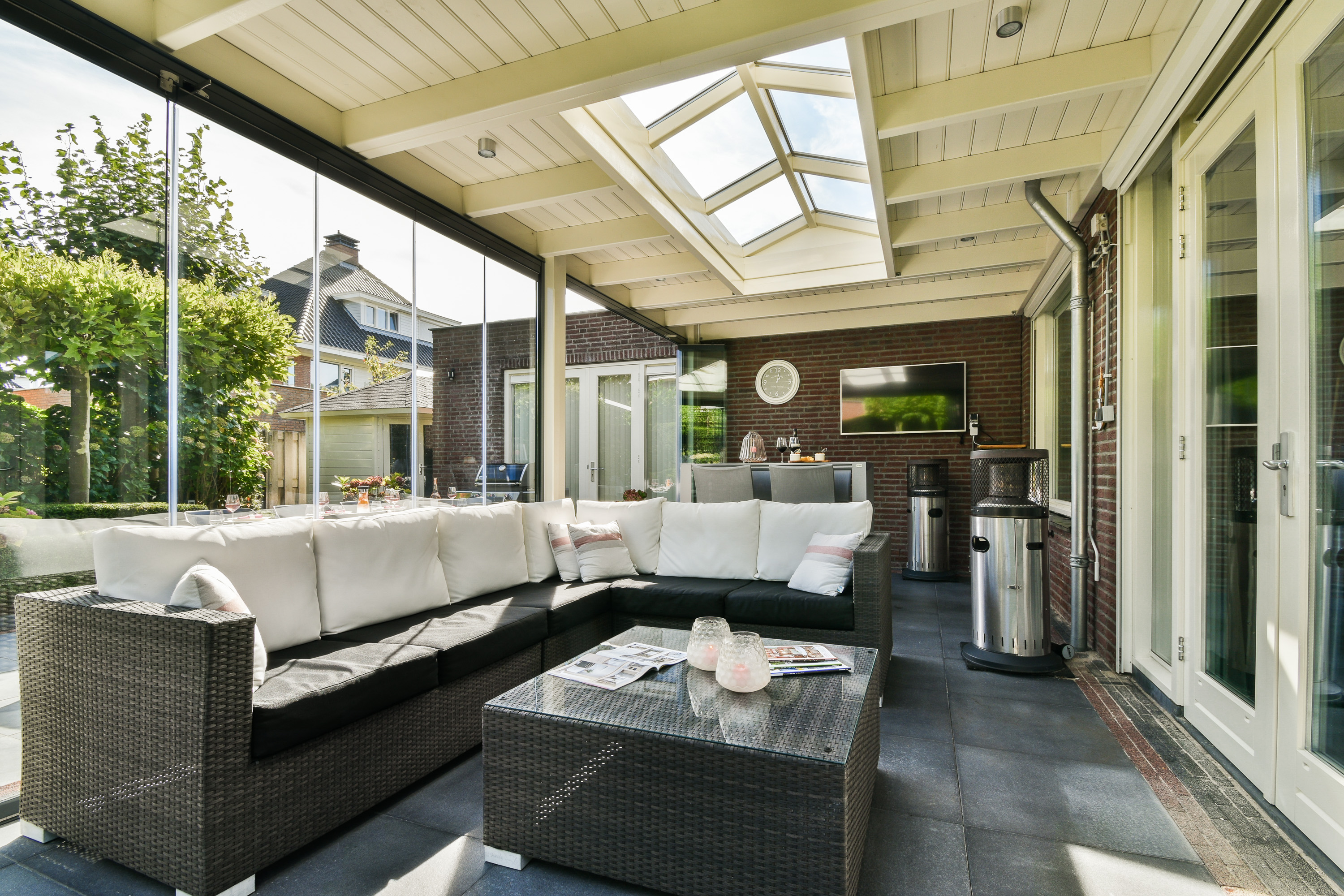 Via dubbele zwart stalen deuren komt u in de living, waar ruimte en sfeer naadloos samenkomen. De woonkamer is verdeeld in een eetgedeelte dat keuken met woonkamer verbindt en een zitgedeelte aan de achterzijde met sfeervolle haard, toegang tot de aanbouw en via dubbele deuren toegang tot de serre (ca. 3,41 x 6,25 m.) en tuin.