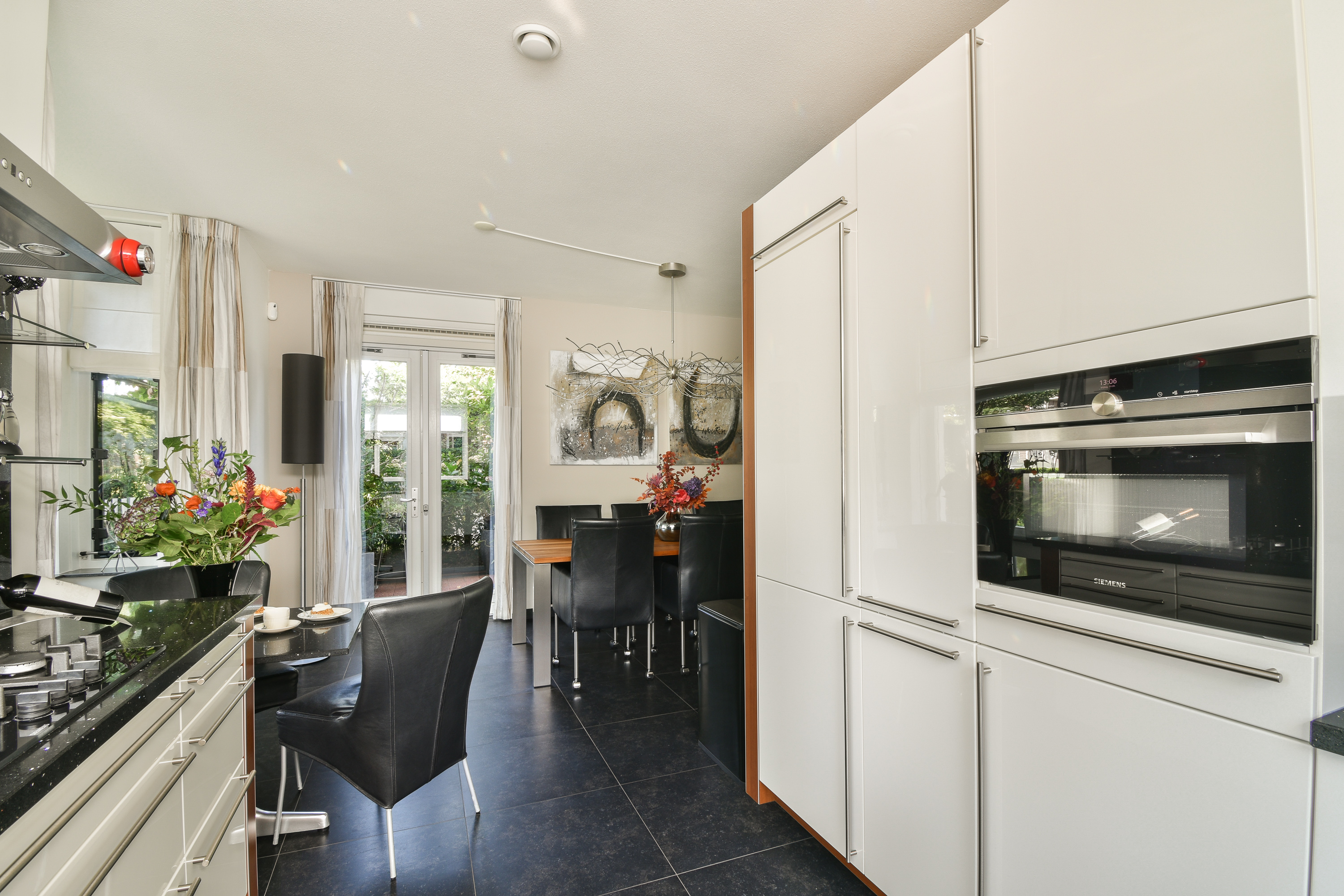 De open keuken aan de voorzijde is in U-vorm opgesteld met een composiet blad en luxe inbouwapparatuur, te weten: een 5-pits gaskookplaat met rvs afzuigschouw (Siemens), een combi-oven (Siemens), een koel-/vriescombinatie (Bosch) en een vaatwasmachine (Bosch). Aan de zijkant betreedt u via dubbele deuren de zijtuin.