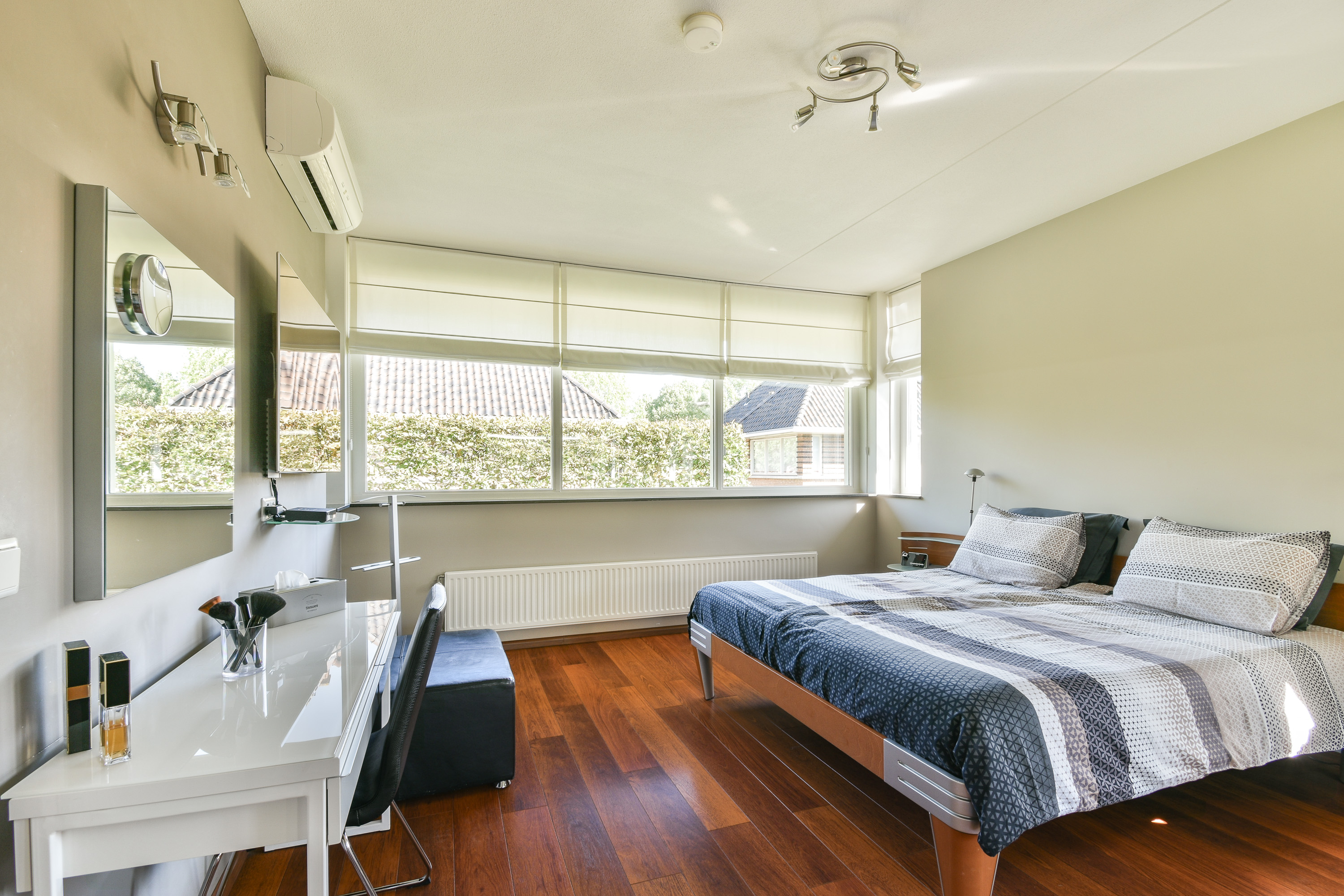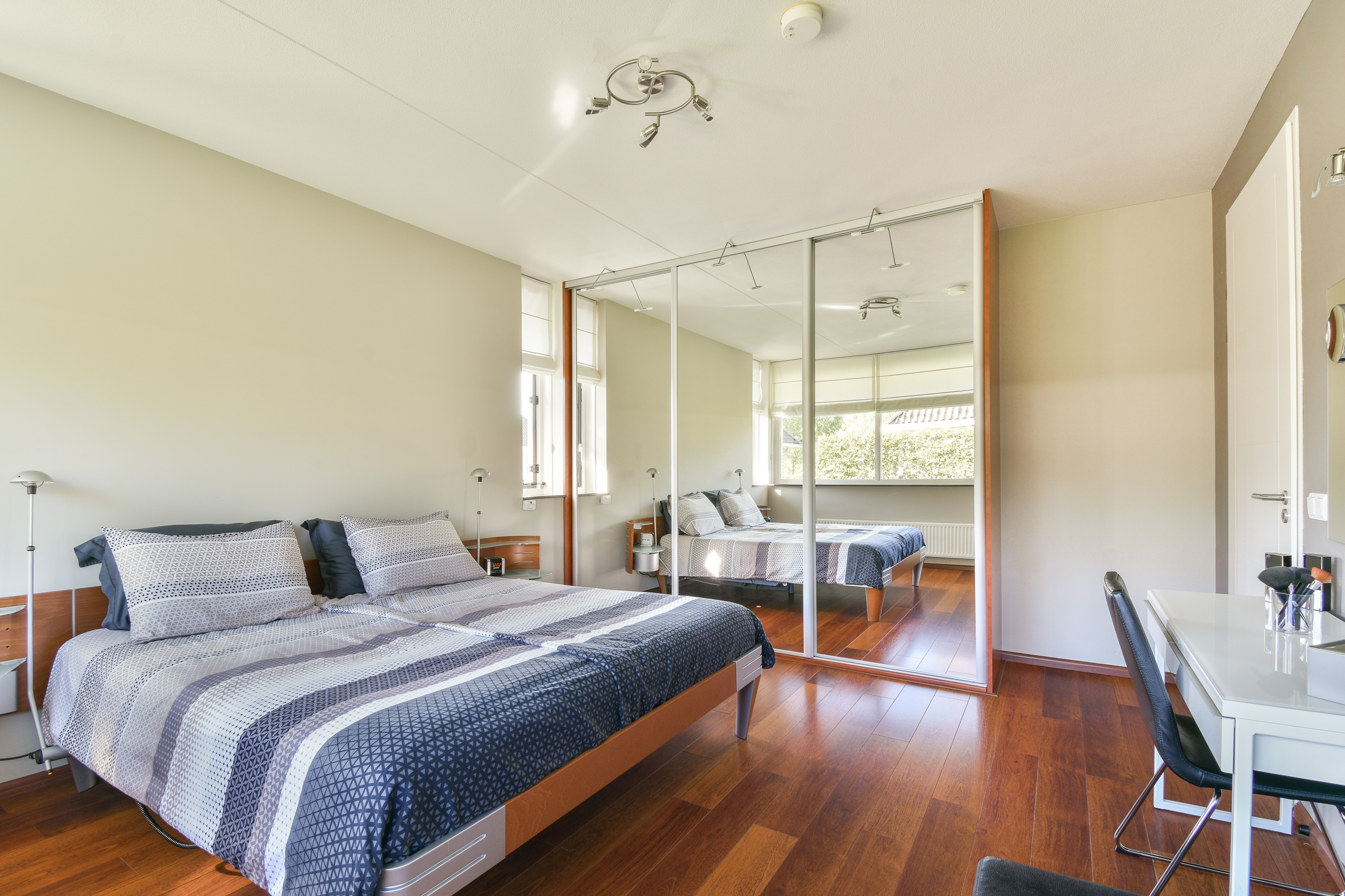 Slaapkamer aan de achterzijde met schuifkastenwand en airconditioning.