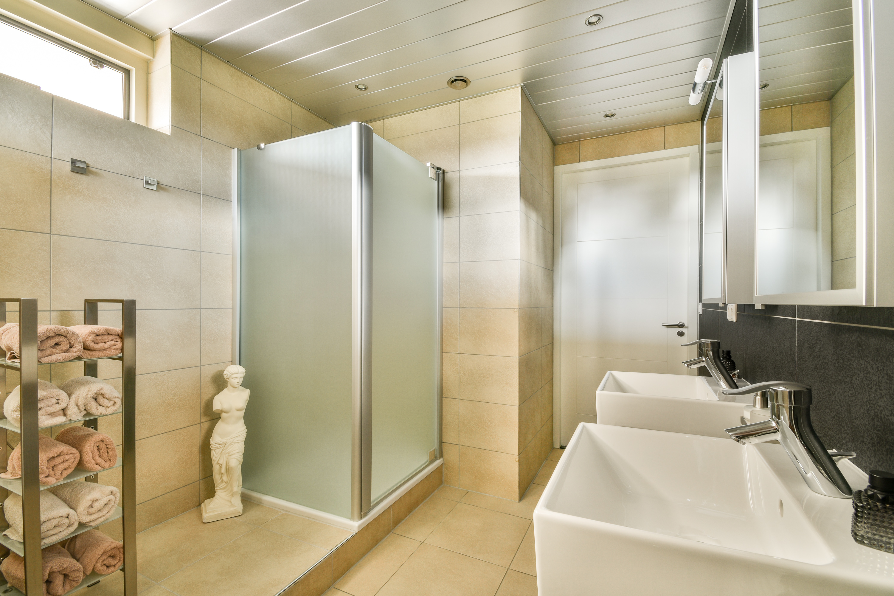 De badkamer is luxe uitgevoerd met fraai tegelwerk, te openen raam en kwalitatief hoogstaand sanitair (Villeroy & Boch), zoals een ligbad, een dubbele wastafel, een douchegelegenheid en een designradiator.