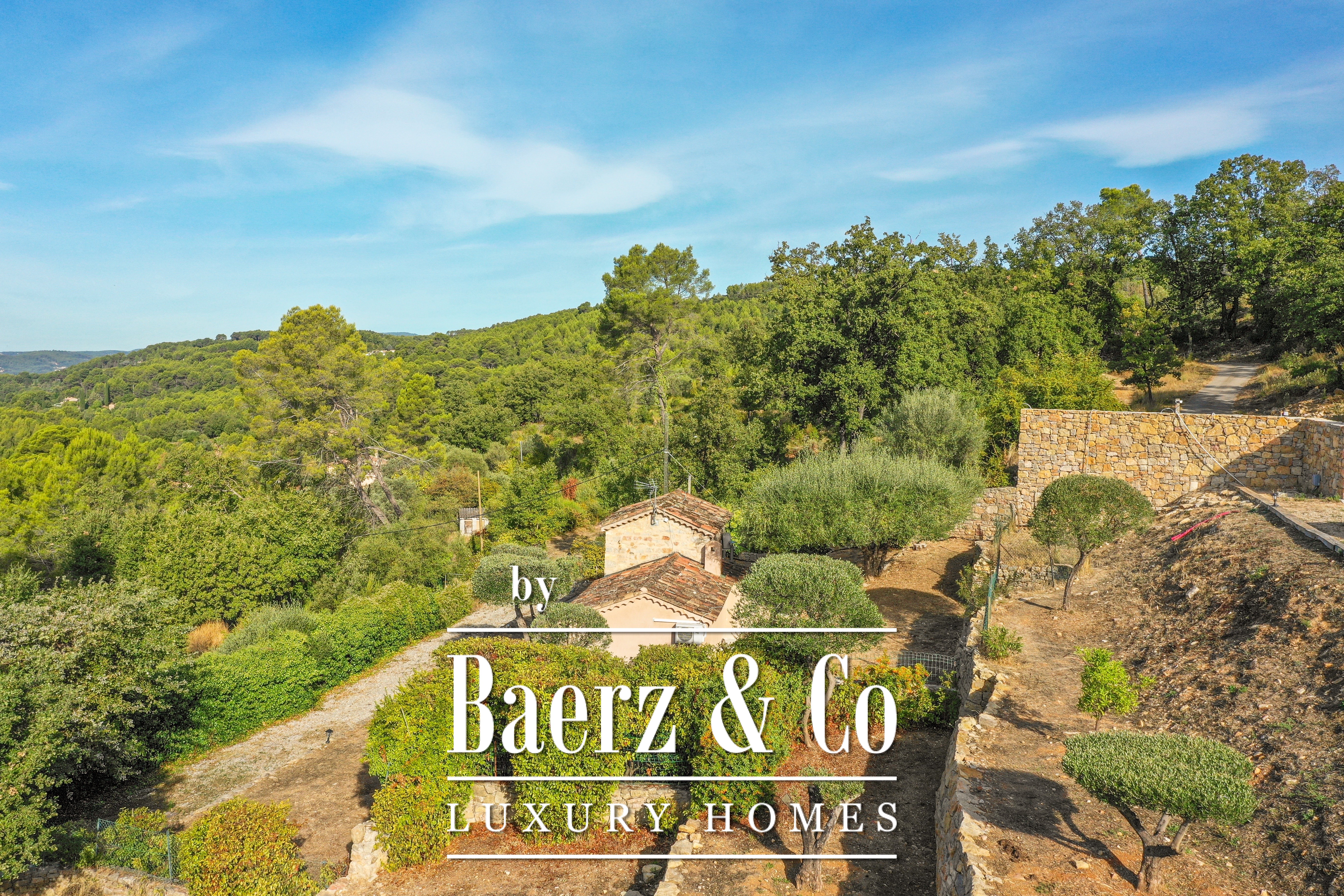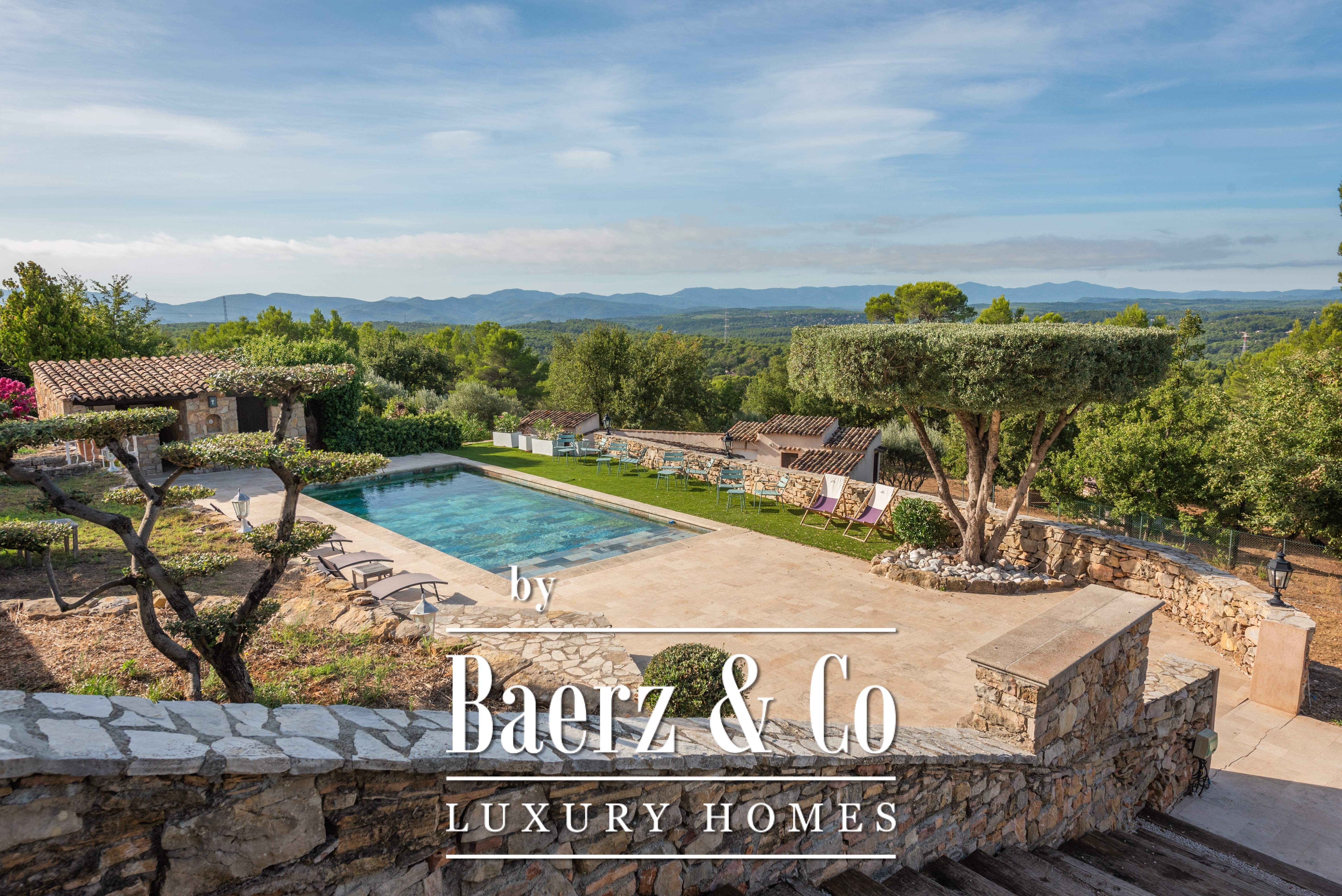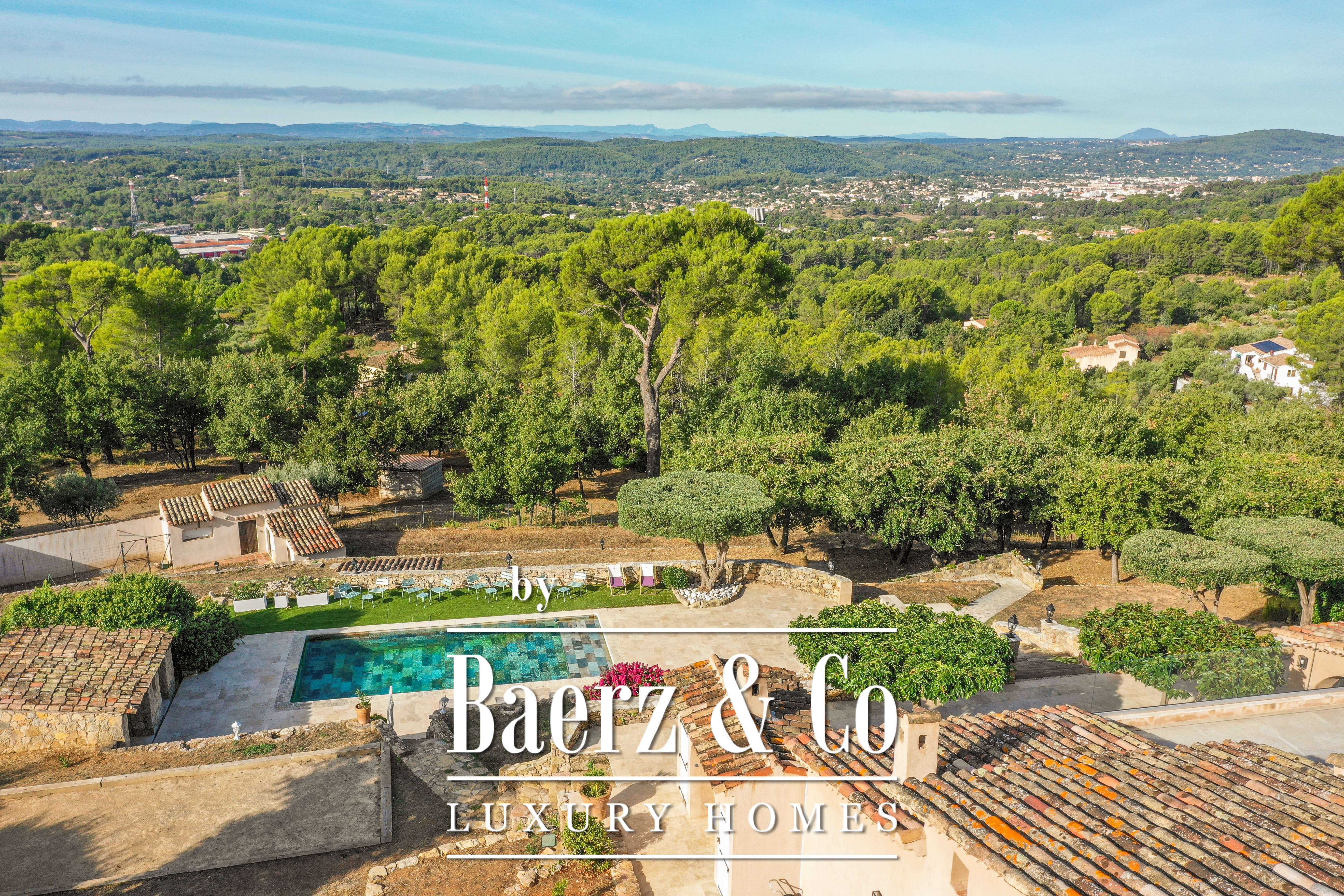 Villa Draguignan met panoramisch uitzicht op de bergen ligt boven de stad in een rustige heuvelomgeving, waar natuur en privacy de toon zetten. Het landgoed strekt zich uit over bijna 12.000 m² aan vredig terrein, met een wijds 180° vergezicht aan de horizon. De architectuur van de villa is ruim en weloverwogen; de hoofdwoning van 222 m² is doordrenkt van natuurlijk licht, terwijl het onafhankelijke gastenverblijf van 41 m² lager ligt en over een eigen entree beschikt.