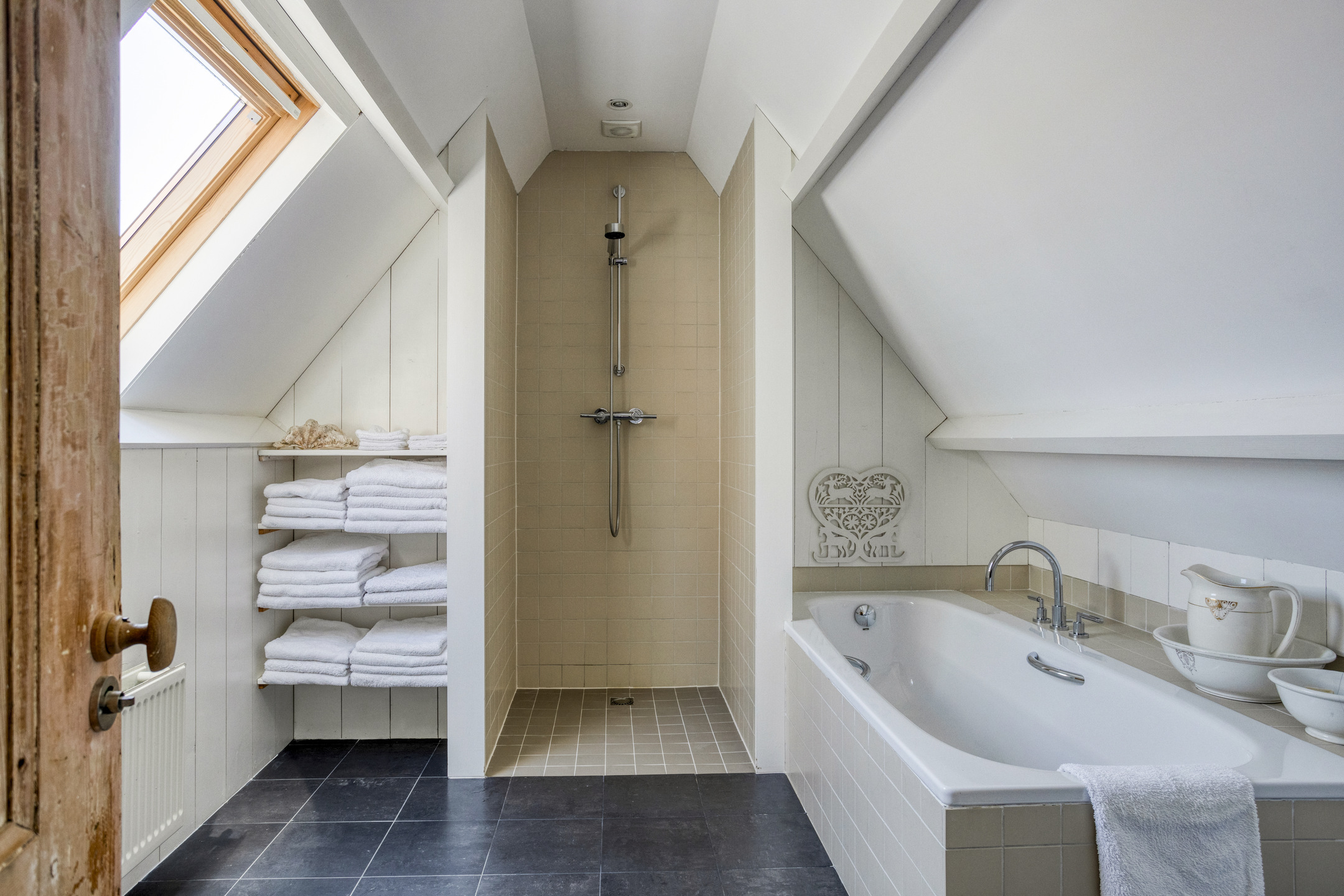 De overgang naar het achterhuis wordt gevormd door een ruime hal, die niet alleen een praktische verbindingsruimte is, maar ook beschikt over een douche en een toilet met fontein.