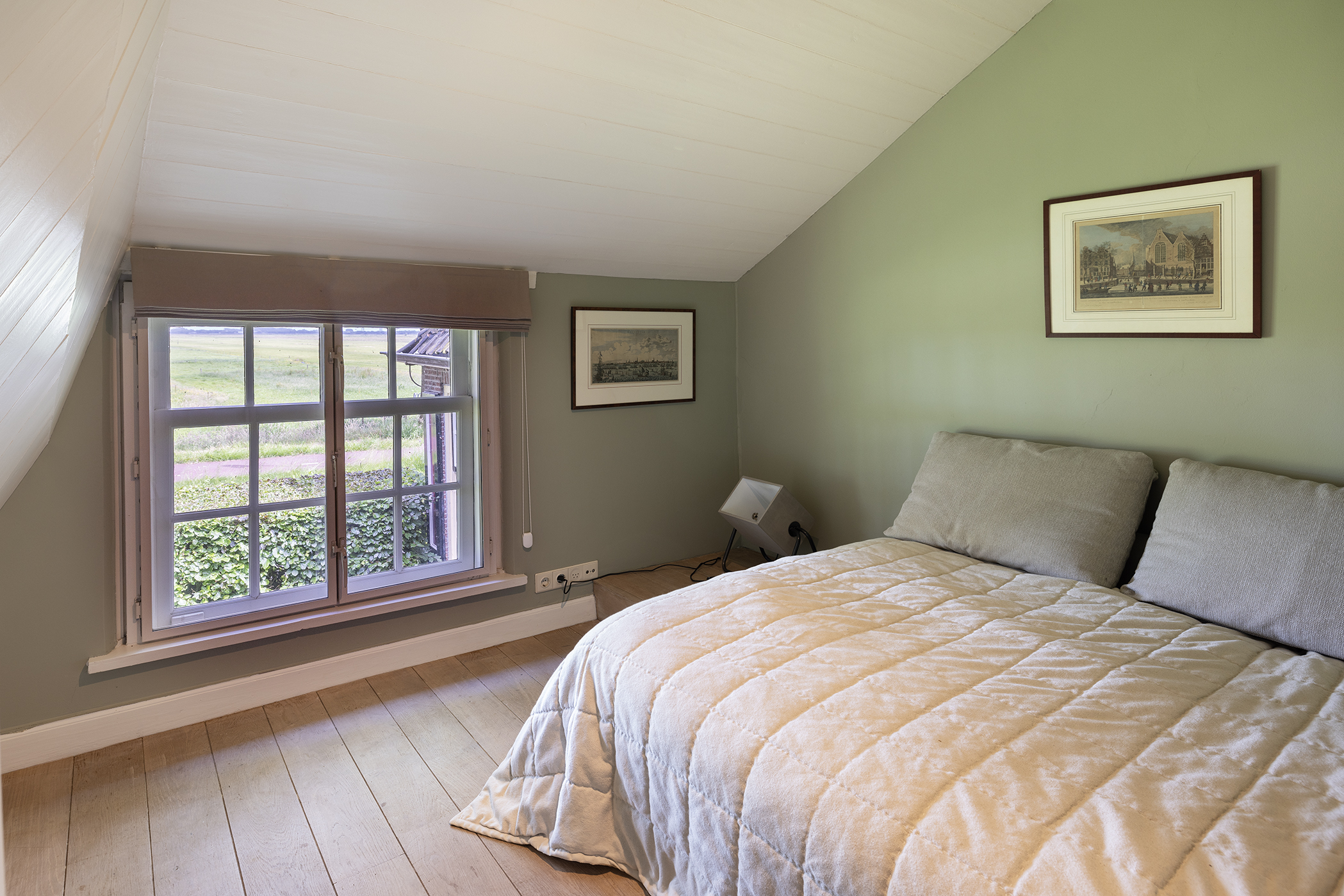 De opkamer met uitzicht op de polder is een geweldige werkkamer, voorzien van een grote schouw en een eigen entree. Onder deze kamer bevindt zich één van de twee kelders, nu in gebruik als royale wasruimte. De verdieping biedt nog meer ruimte: 4 slaapkamers, een moderne badkamer, apart toilet en zelfs een bedstee voor wie het knus wil houden.