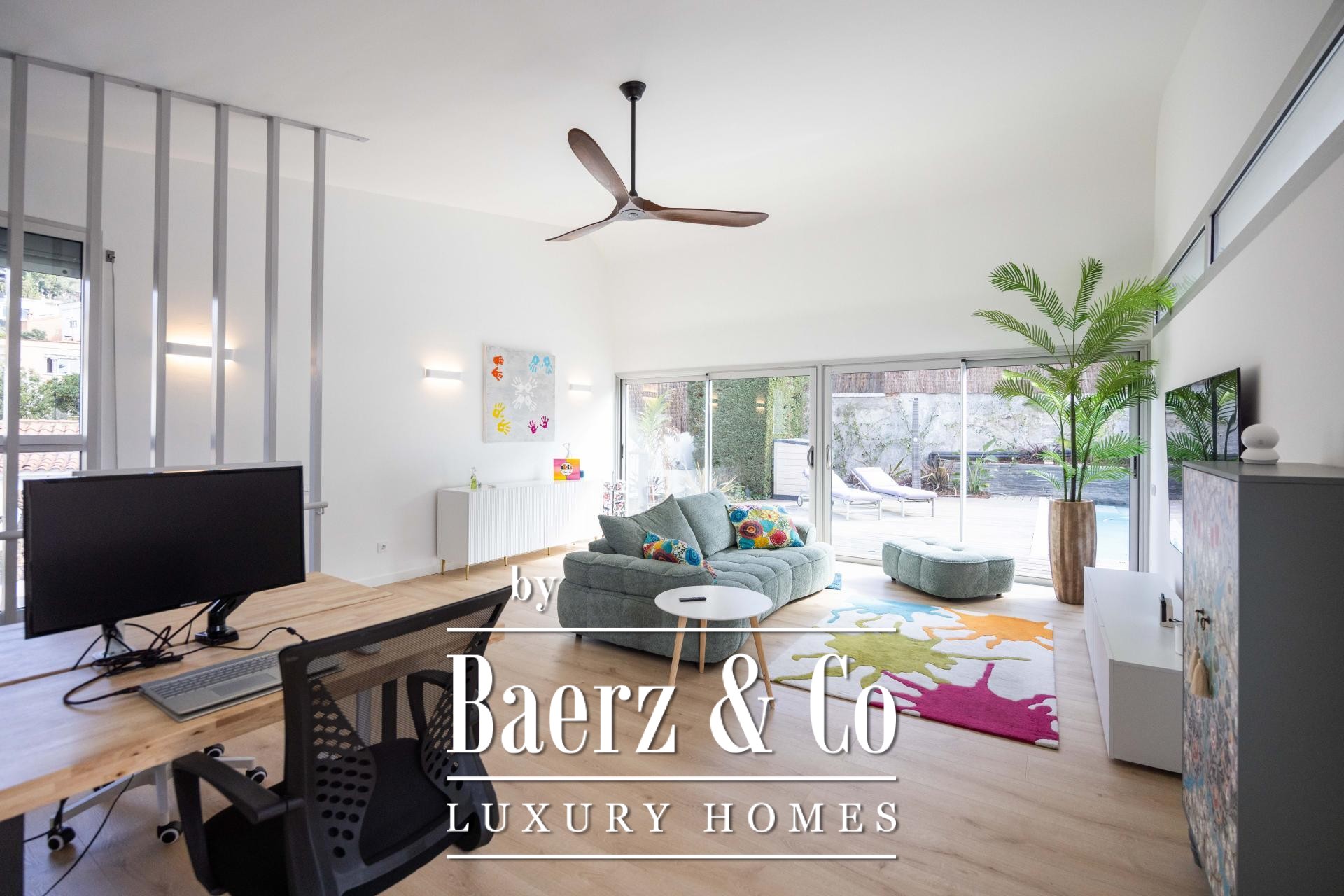 Vier aangelegde terrassen, omgeven door palmen en bananenbomen, vormen een oase in de open lucht. Het zwembad van 7 x 5 m, omringd door een zonnig houten terras, biedt volop privacy en ontspanning. De pergola en buitenkeuken staan in het teken van mediterraanse gastvrijheid. Zes slaapkamers zijn aanwezig, waaronder een master suite met inloopkast, eigen houten terras en een badkamer in spa-stijl die uitkijkt op rustige vergezichten, zoals een privé toevluchtsoord. Twee extra tweepersoonsslaapkamers delen een stijlvol afgewerkte badkamer. Op de bovenste verdieping bieden de kantoren inspirerende ruimtes met zicht op de stad.