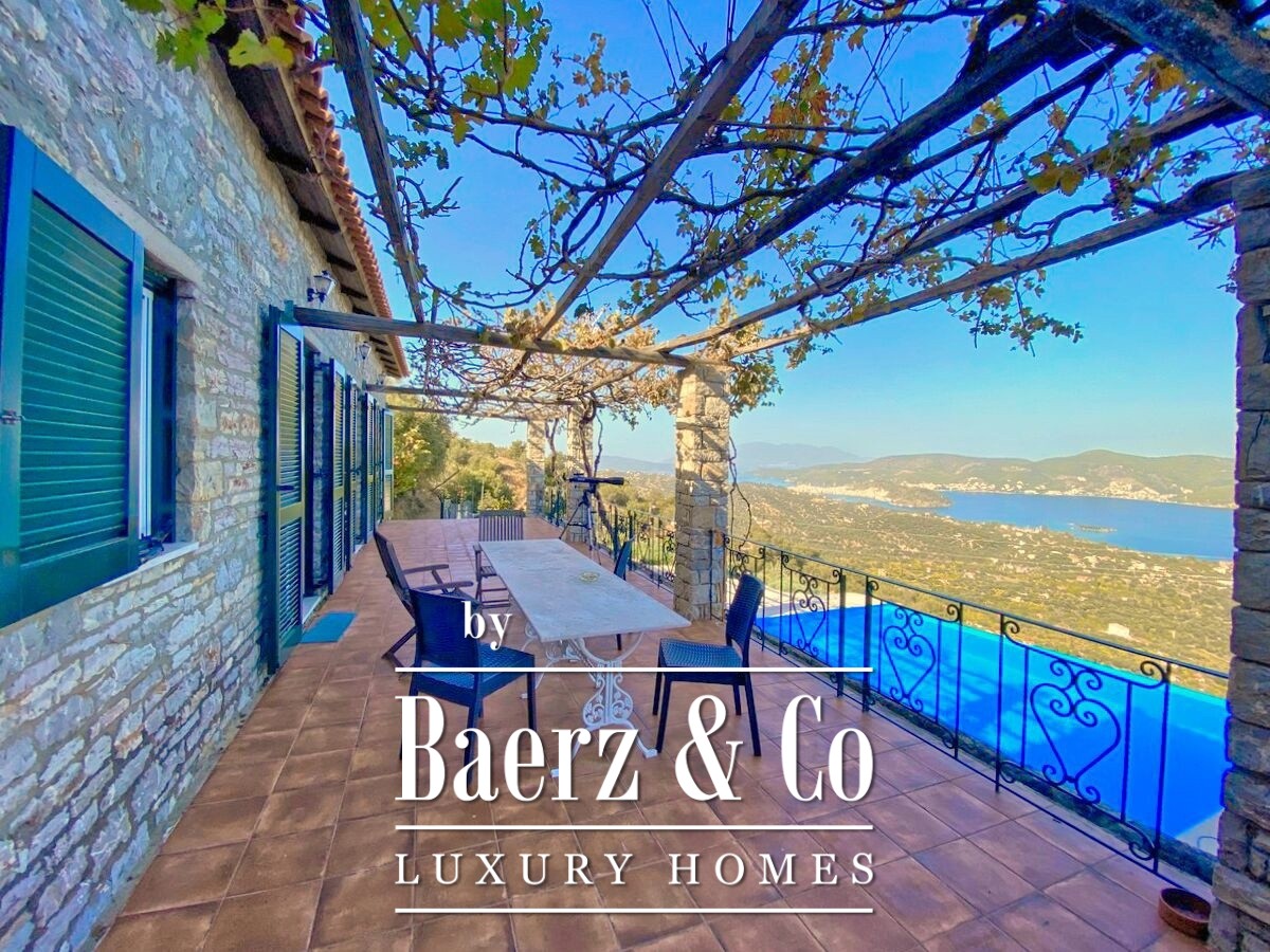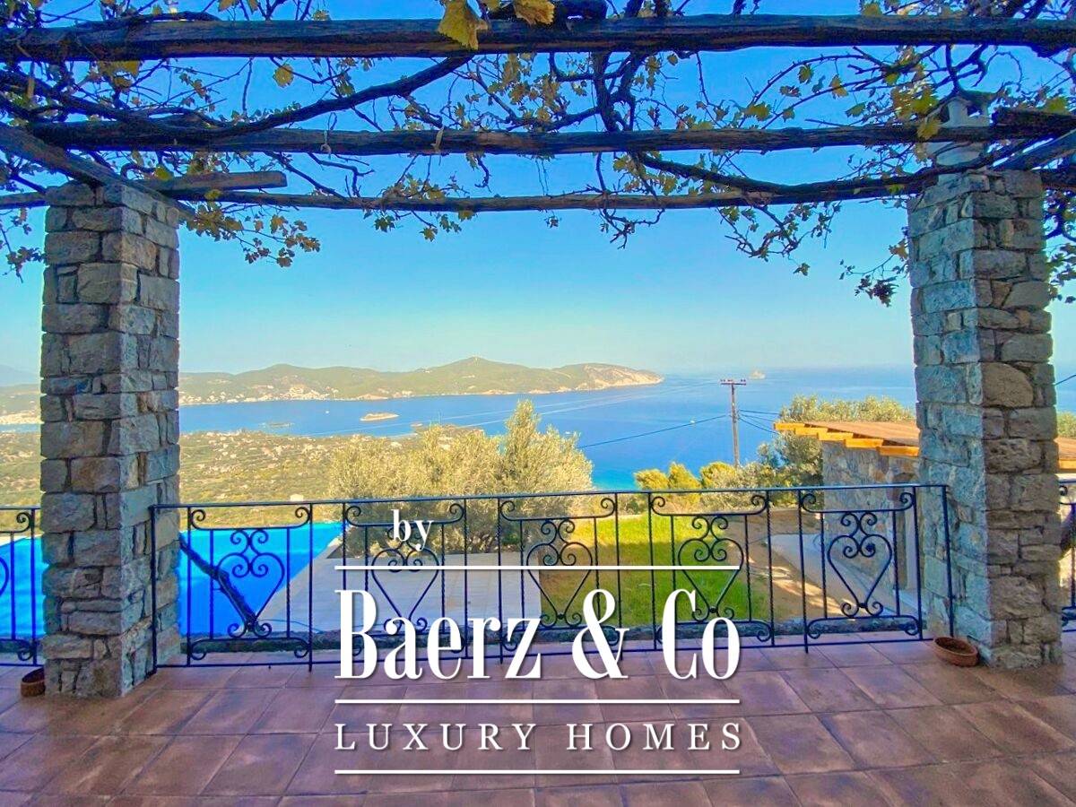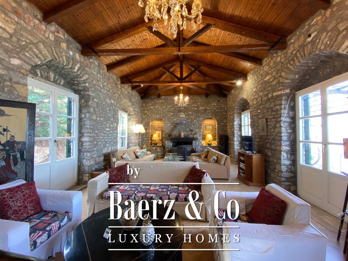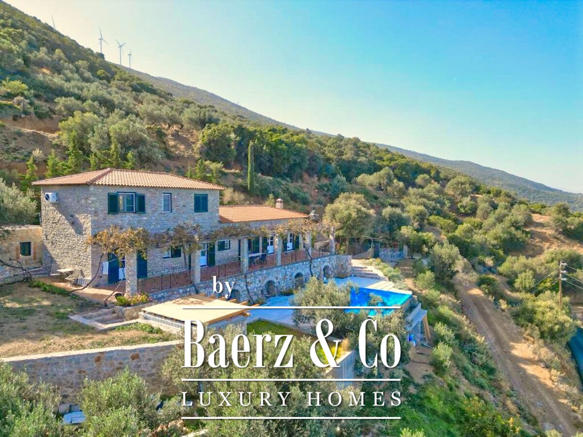 De stenen villa Galatas bevindt zich op een rustige heuvel en biedt panoramisch uitzicht over zee, waar traditionele Griekse architectuur samenkomt met subtiel modern comfort. De riante en lichte kamers in het 180 m² tellende interieur profiteren optimaal van het daglicht, met een centrale living die wordt gekenmerkt door een indrukwekkende stenen open haard. Elke ruimte, van de aparte keuken tot de drie slaapkamers en twee badkamers, is ontworpen met oog voor functionaliteit en ingetogen luxe.