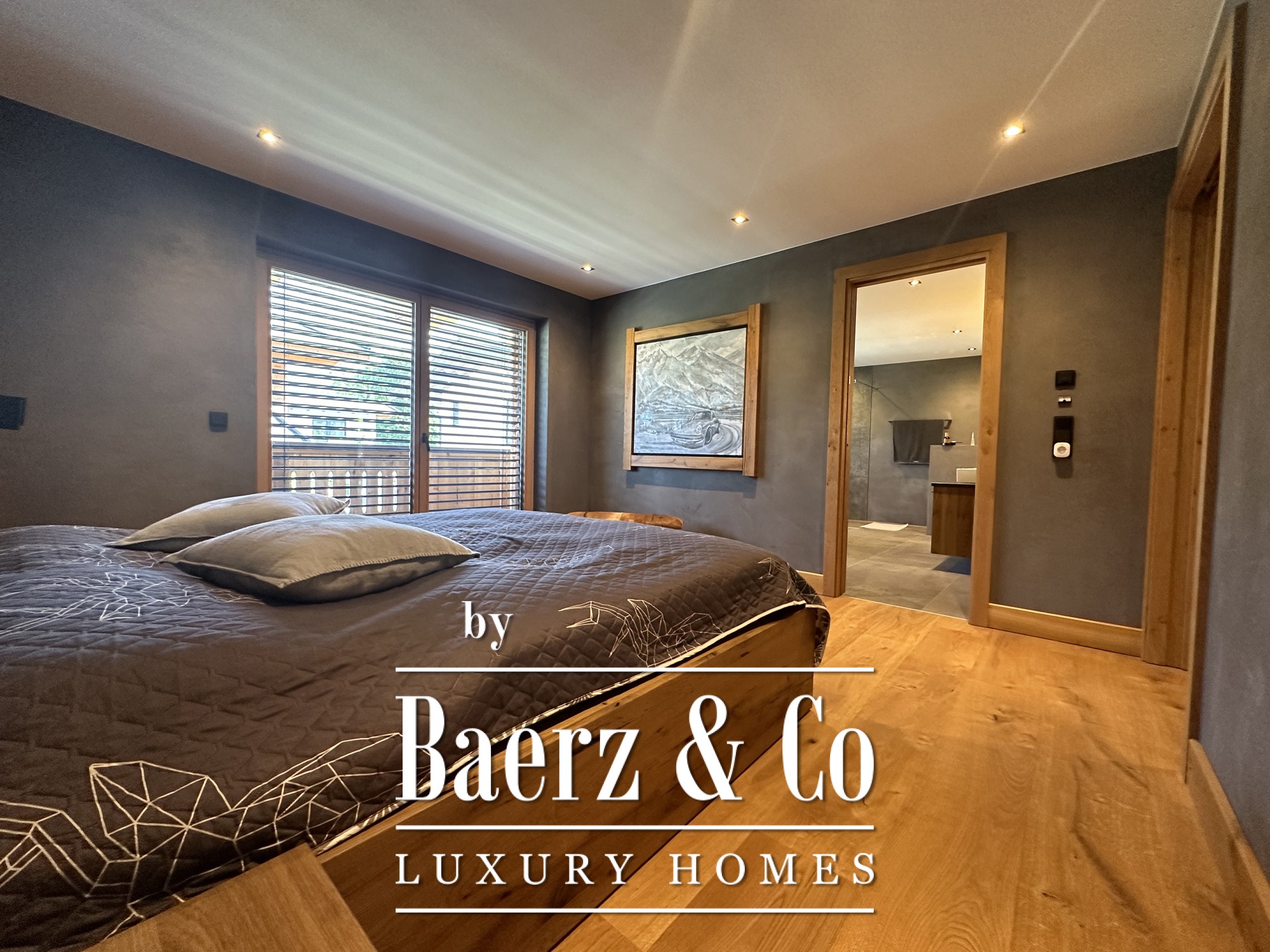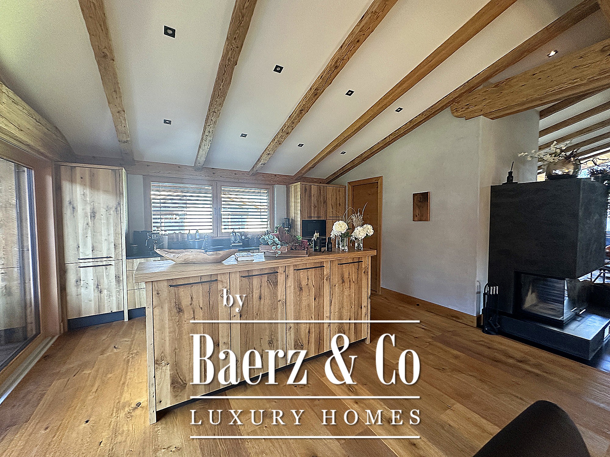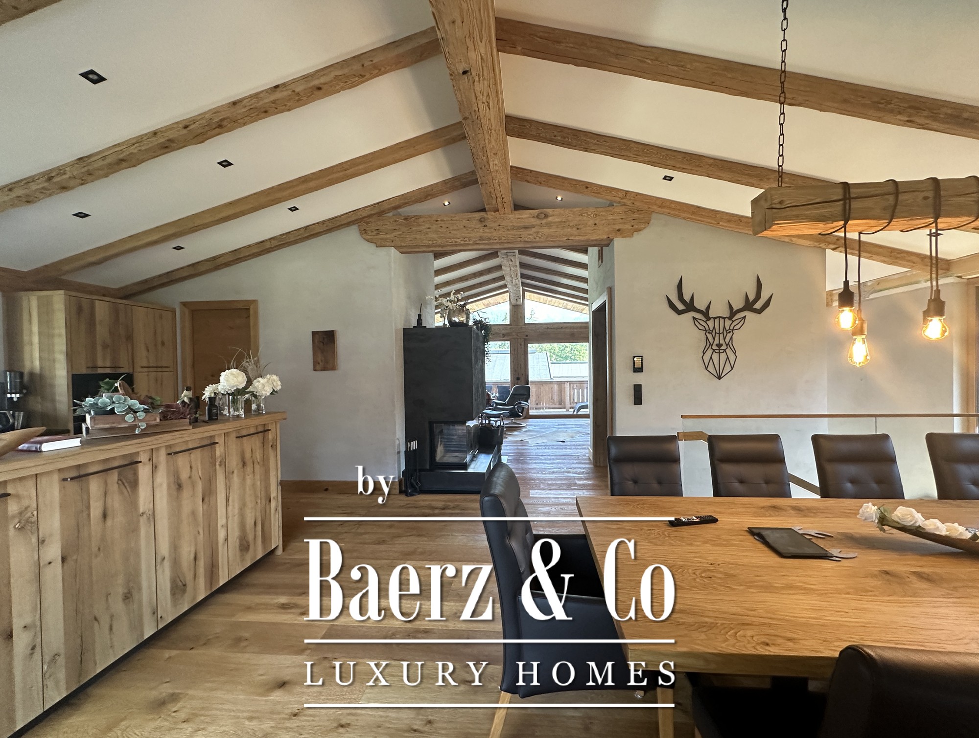 De bovenste verdieping omvat de woon-, eet- en keukenruimte onder zichtbare spanten, voorzien van een open haard en omgeven door balkonterrassen die het bergpanorama omlijsten. Hoogwaardige eiken vloeren, een op maat gemaakte keuken, Sonos-systeem, elektrische zonwering en vloerverwarming maken het geheel compleet.