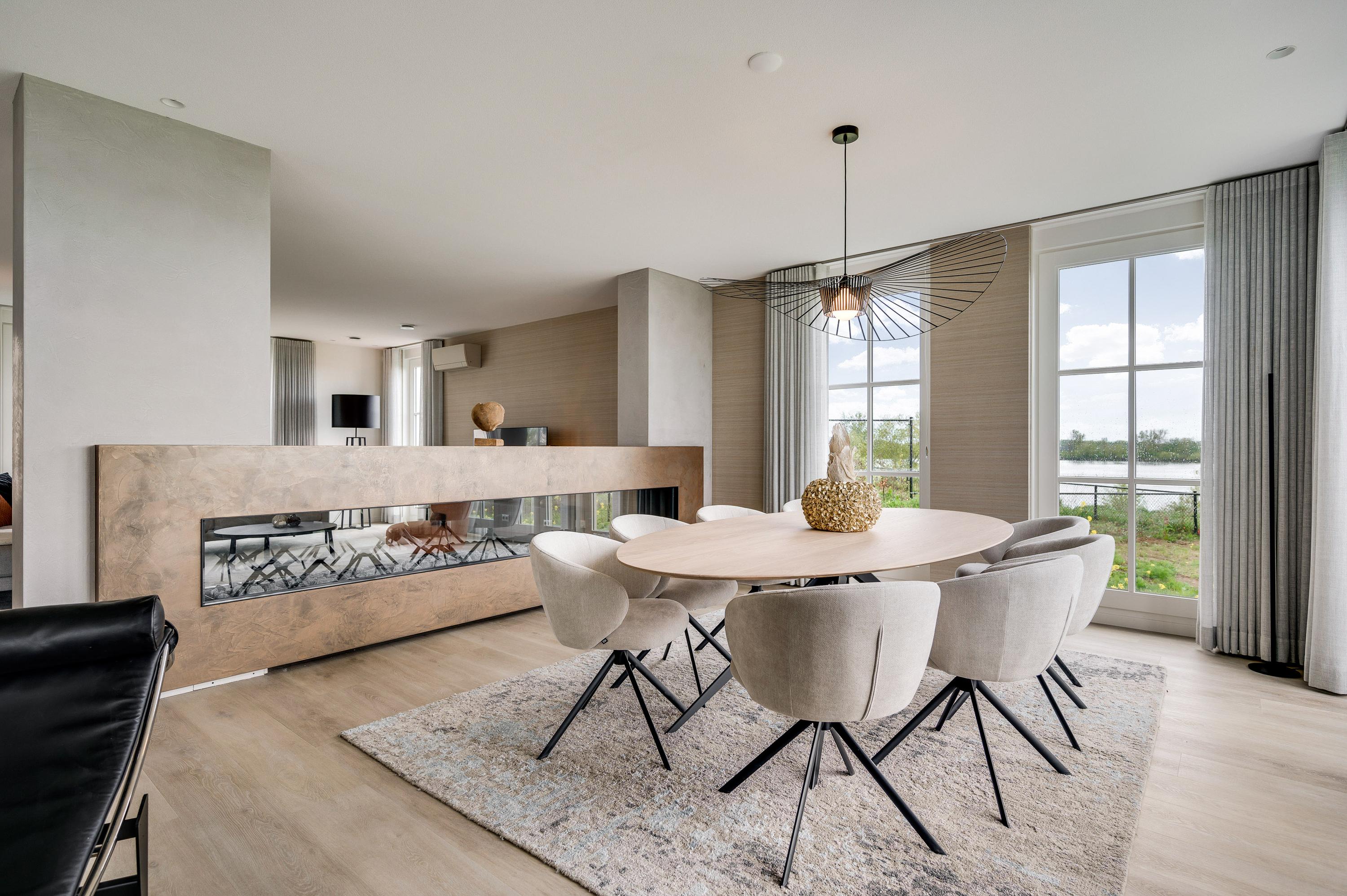 De eyecatcher in deze ruimte is de royale gashaard, welke op een luxe manier dient als roomdevider tussen de living en de eetkamer.