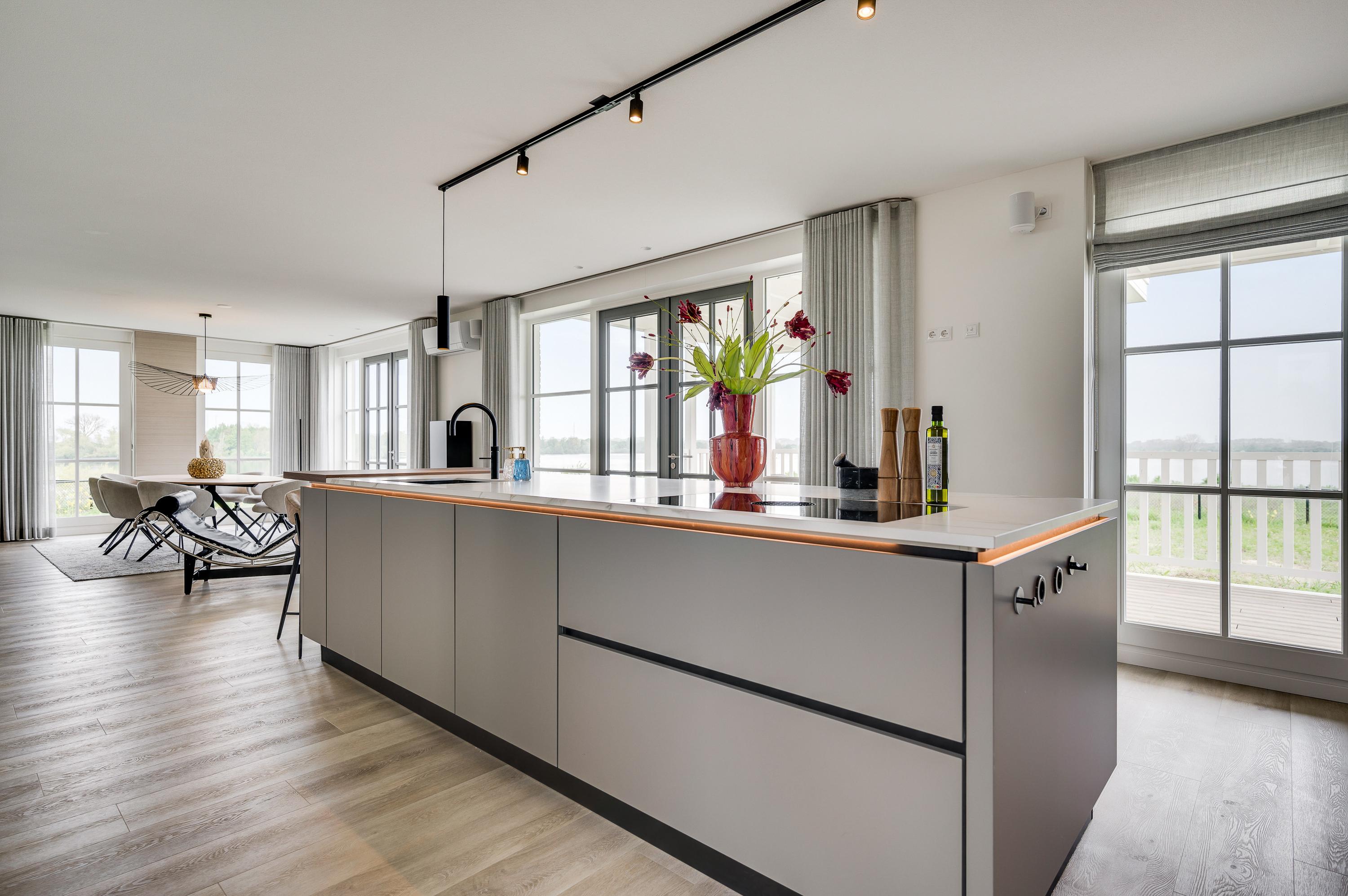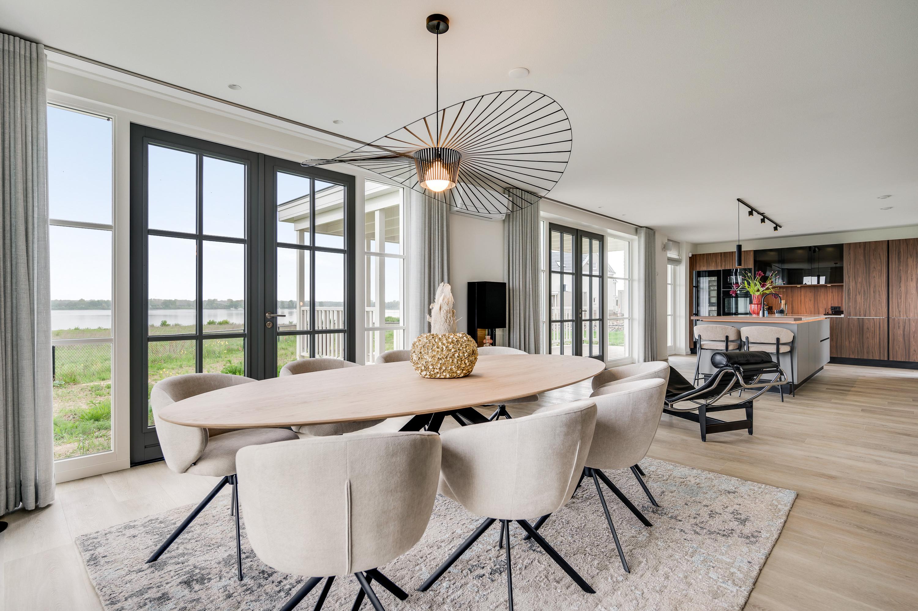Vanuit de eetkamer kijk je uit over het water en kun je genieten van een geweldig uitzicht.