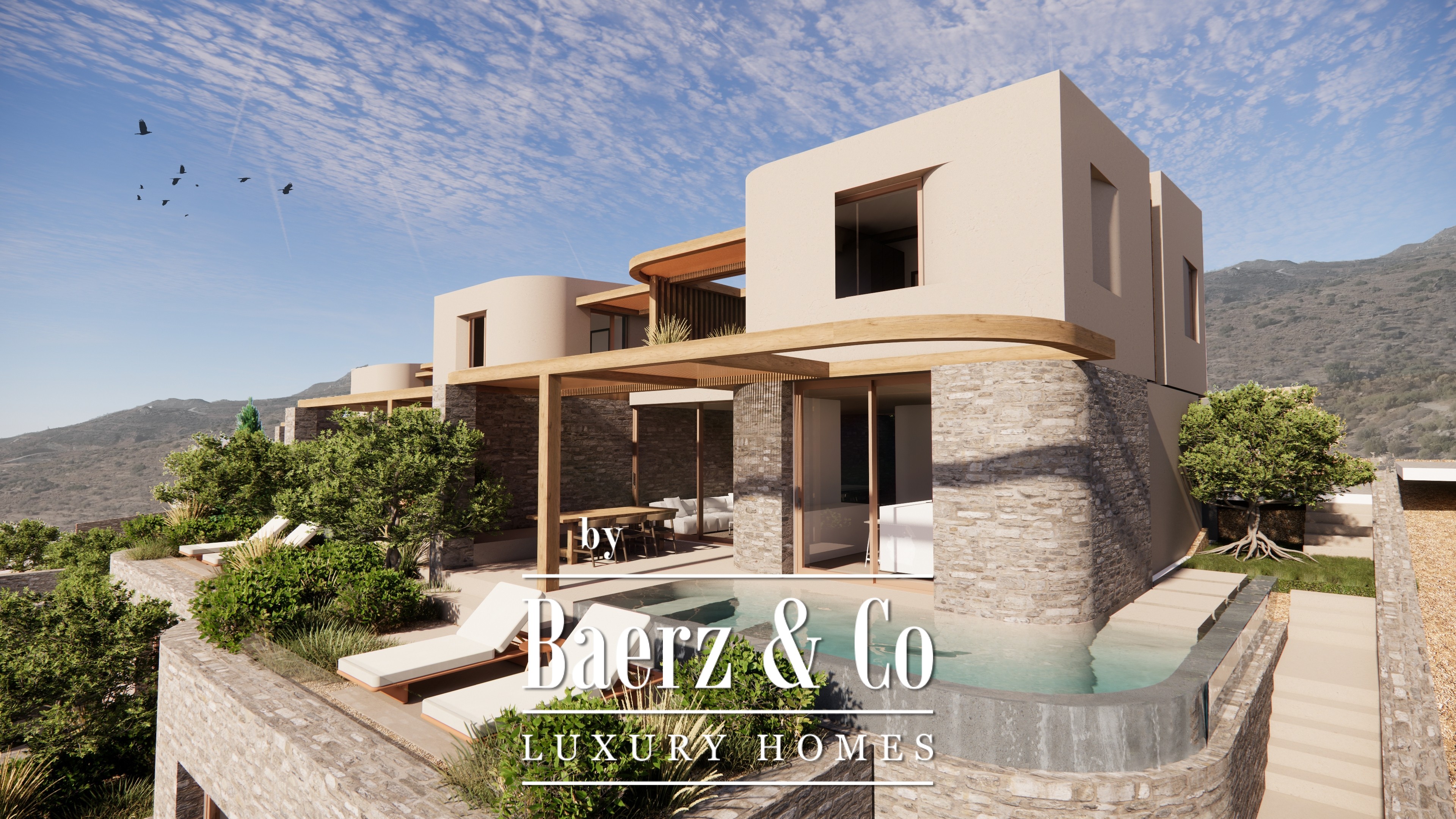Elke villa wordt bepaald door adembenemende vergezichten en beschikt over schaduwrijke buitenterrassen, aangelegde daktuinen, een zwembad en directe toegang tot zowel privé als gedeelde ruimtes. Natuurstenen muren, pergola’s en waterpartijen creëren een samenhangende leefomgeving, gebaseerd op de synergie tussen vorm en functie. De volledige infrastructuur, inclusief een eigen bron en een uitgebreid nutsnetwerk, ondersteunt zorgeloos en eigentijds wonen.