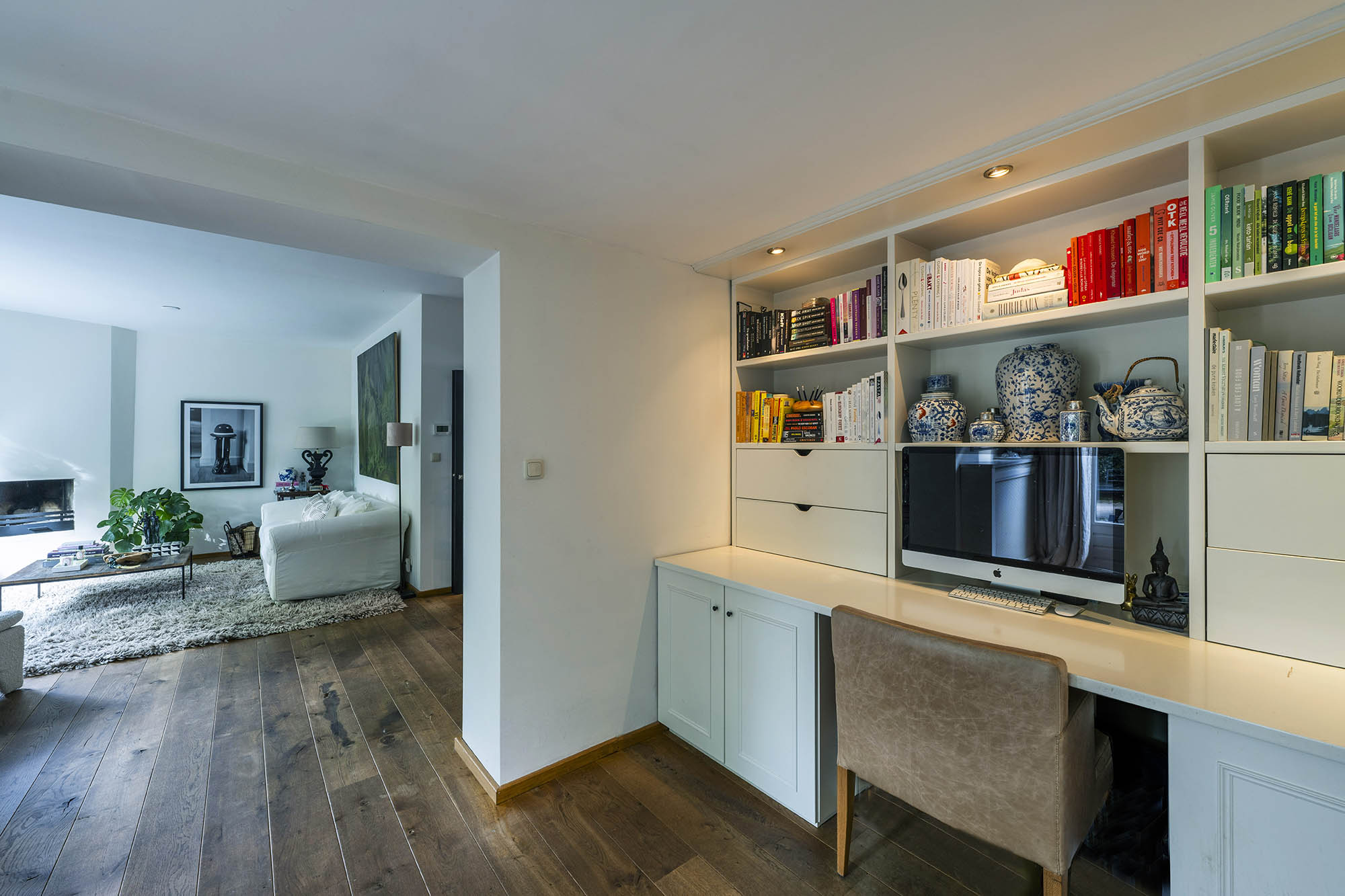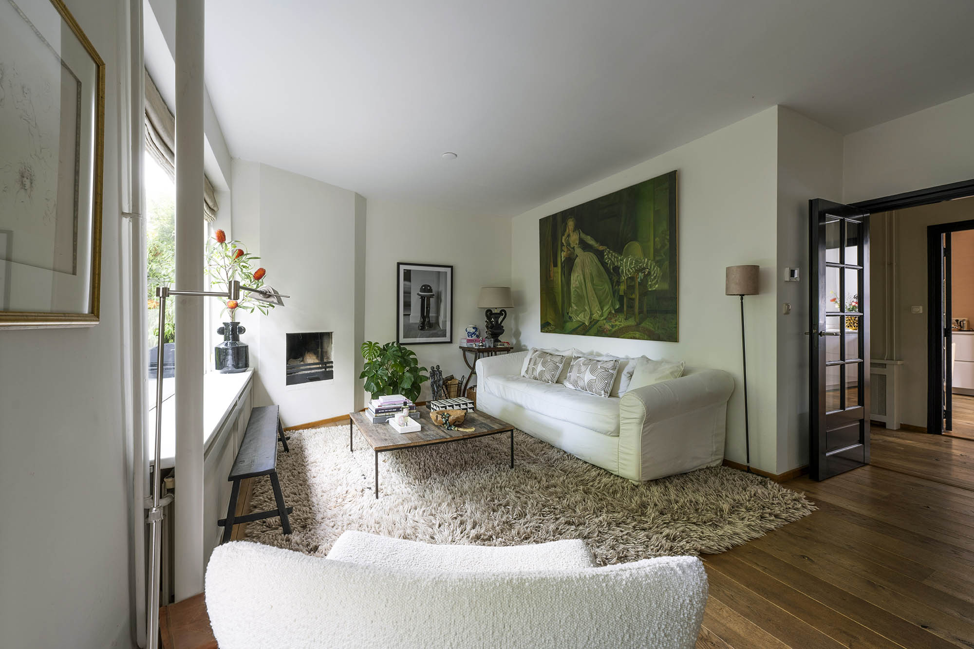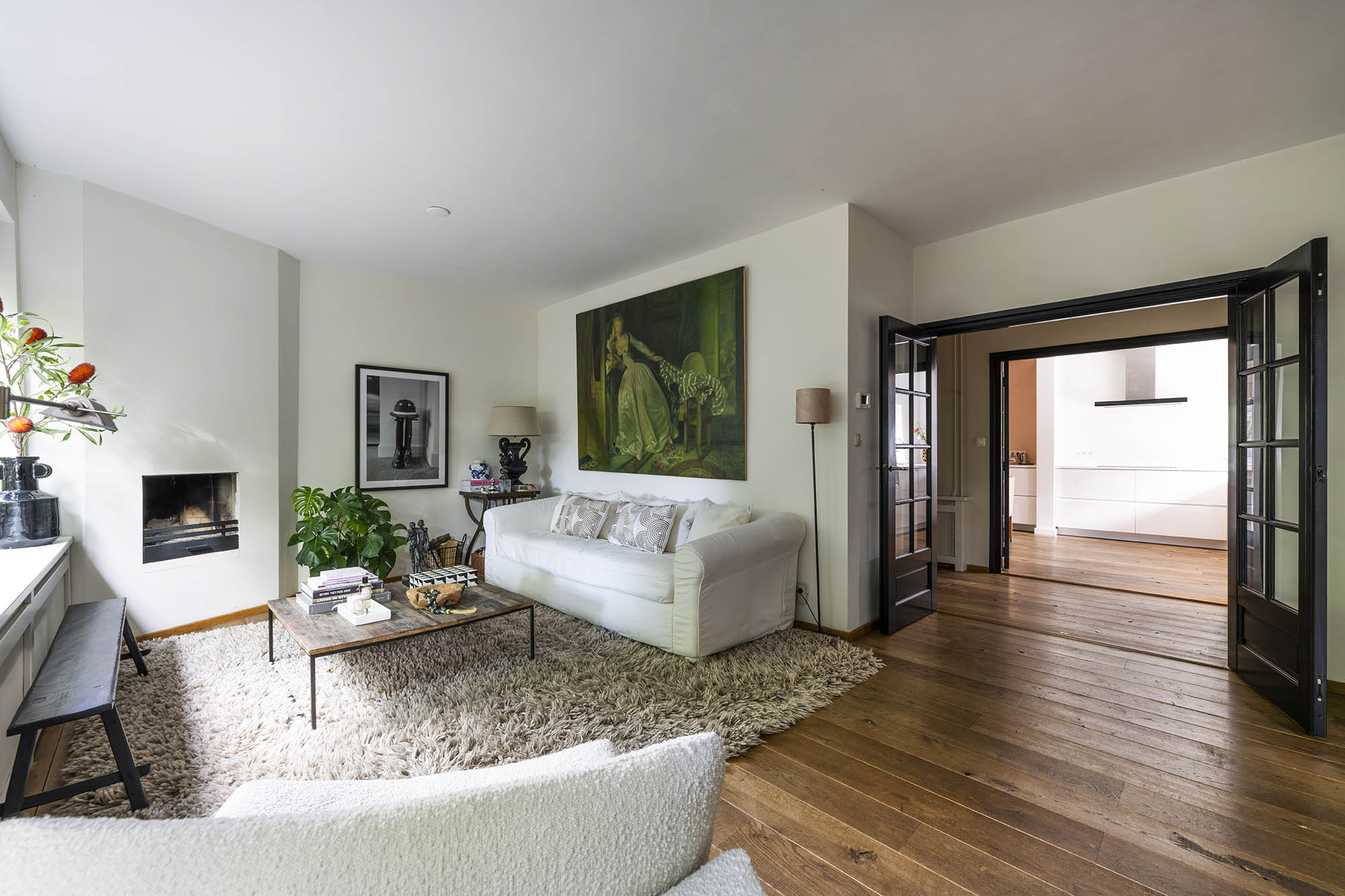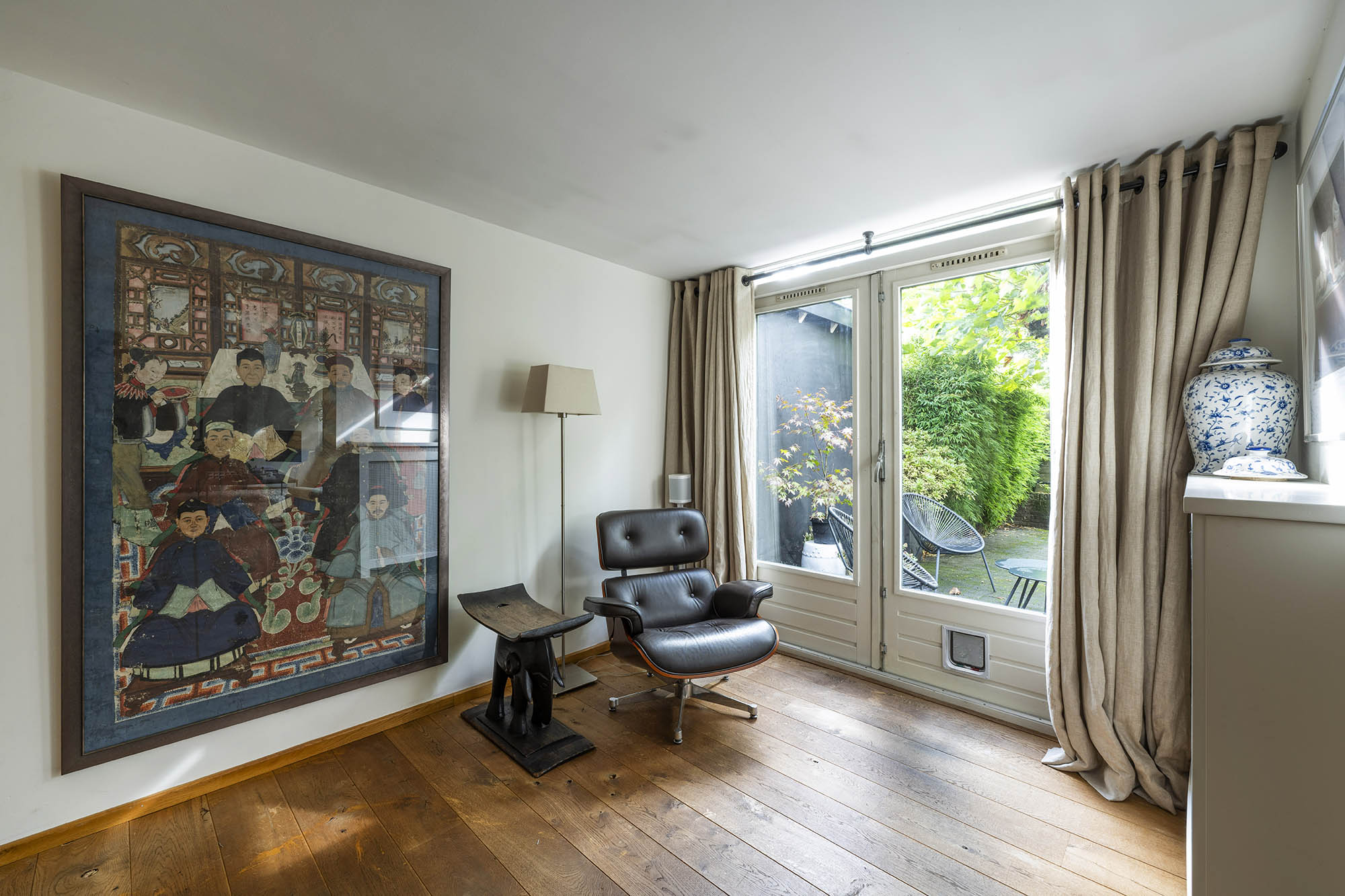 Binnen biedt de woning verrassend veel ruimte en een prettige indeling. De royale woonkamer met open haard strekt zich uit over de gehele breedte en beschikt over een gezellige werkhoek en openslaande deur naar de zonnige tuin met dakplatanen – een plek die direct een vakantiegevoel oproept. De moderne, volledig uitgeruste woonkeuken en de aparte tv-kamer maken de begane grond compleet.