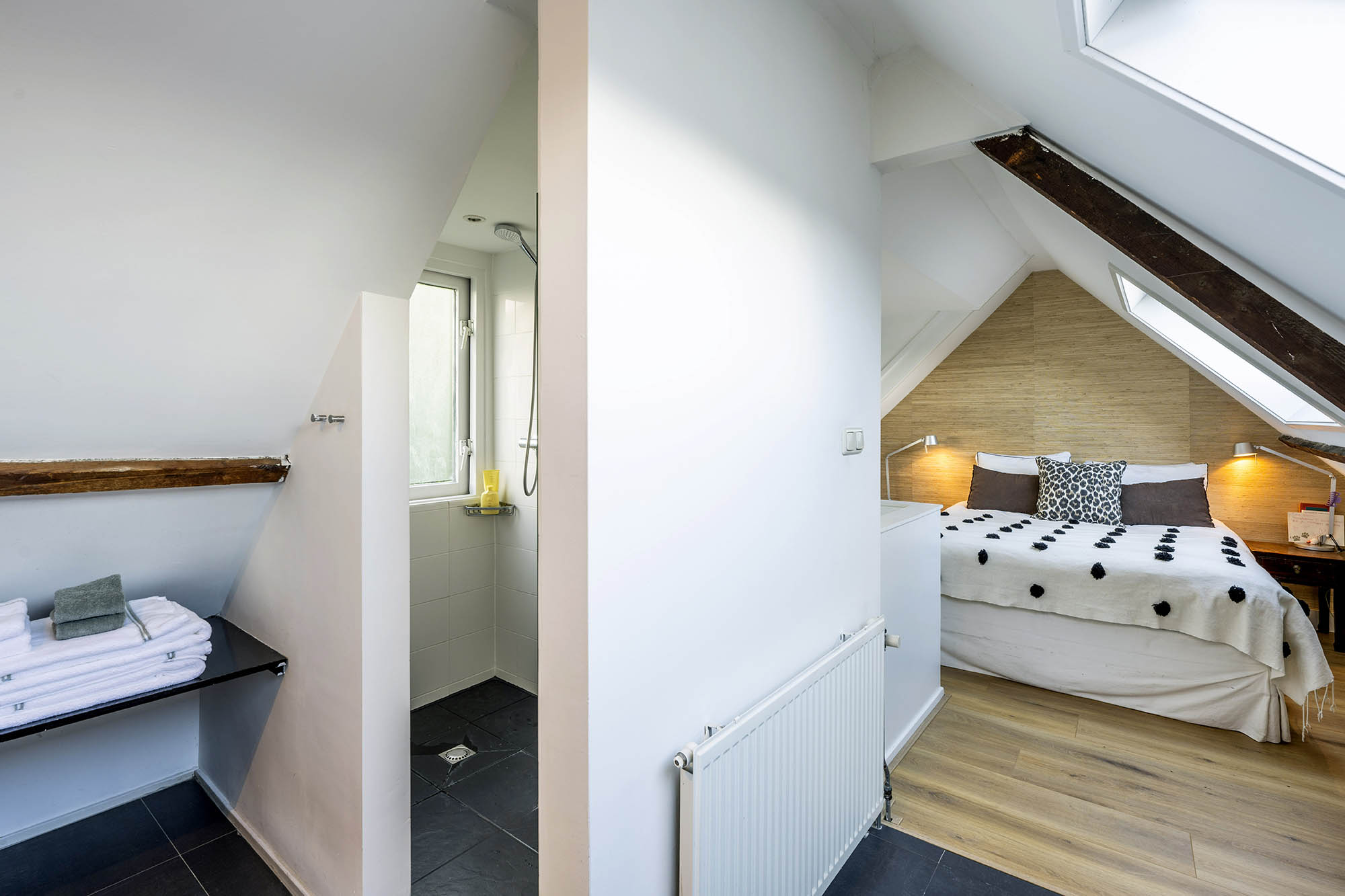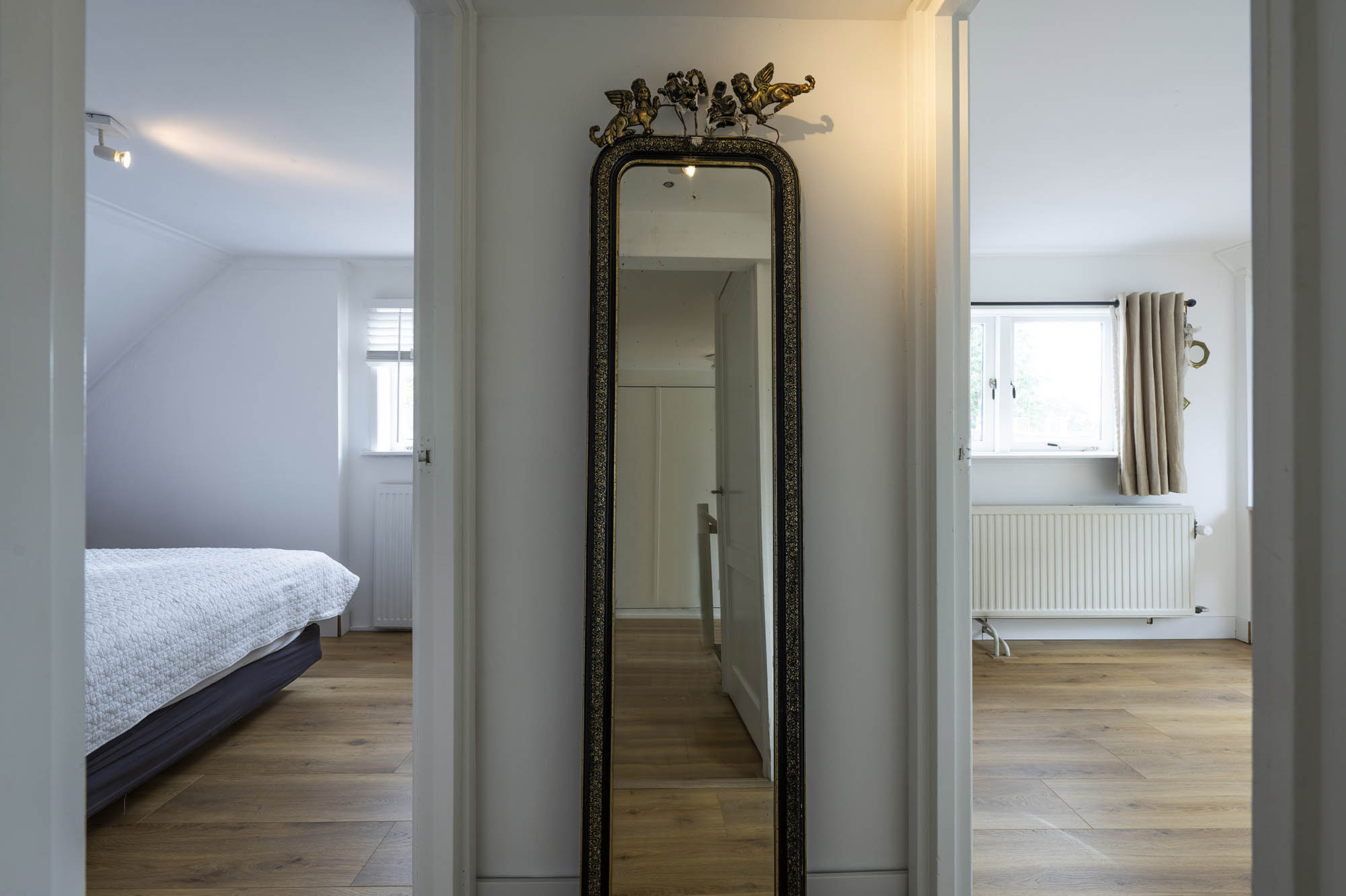 Op de eerste verdieping bevinden zich drie ruime slaapkamers waarvan één wordt gebruikt als waskamer, een moderne badkamer met bad, wastafelmeubel en toilet. Via een vaste trap bereik je de tweede verdieping, waar de ouderslaapkamer met vaste kasten en eigen badkamer een heerlijke privéverdieping vormt.