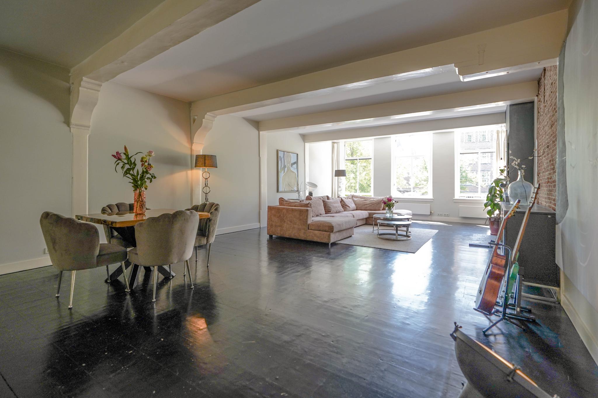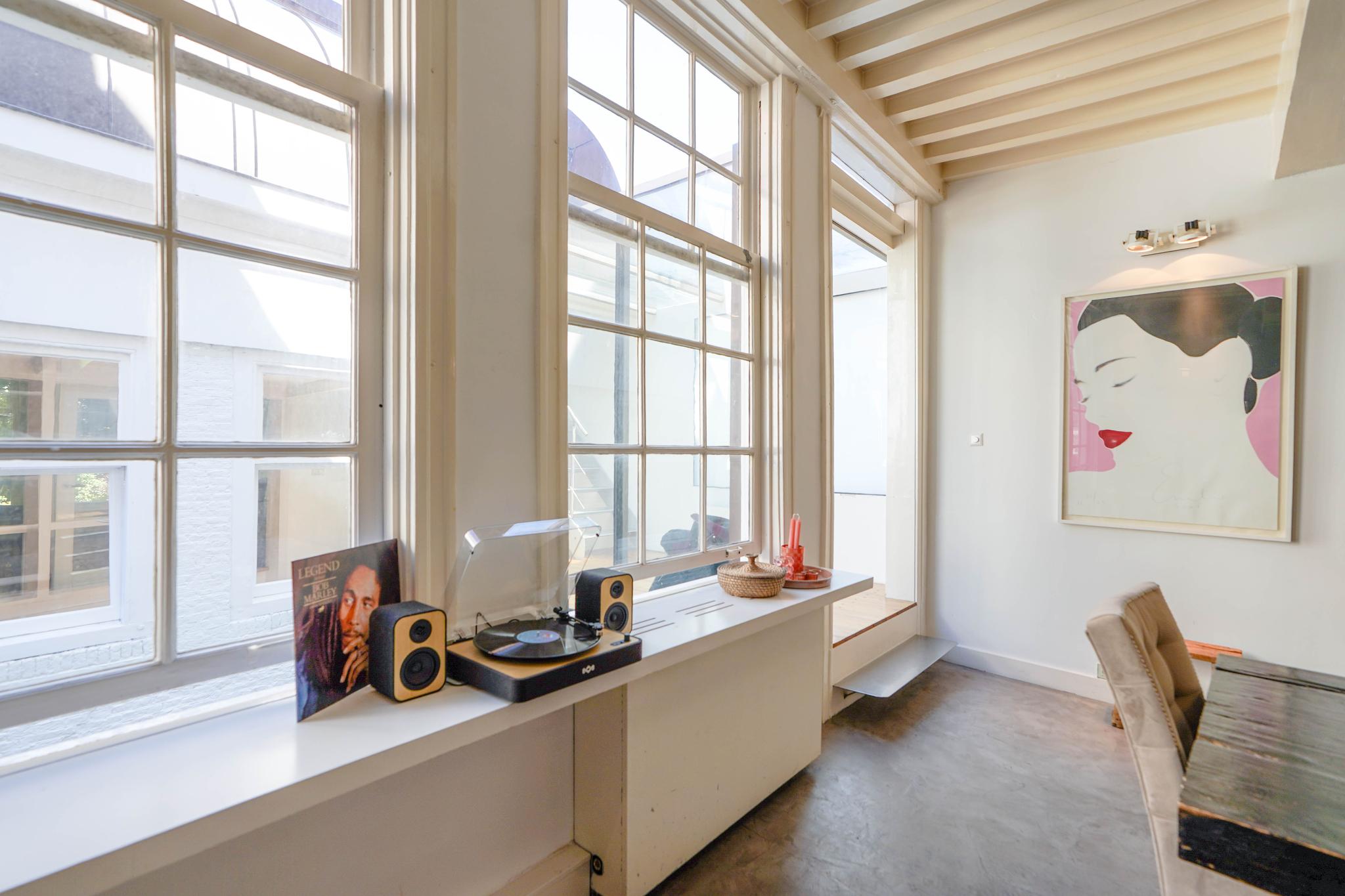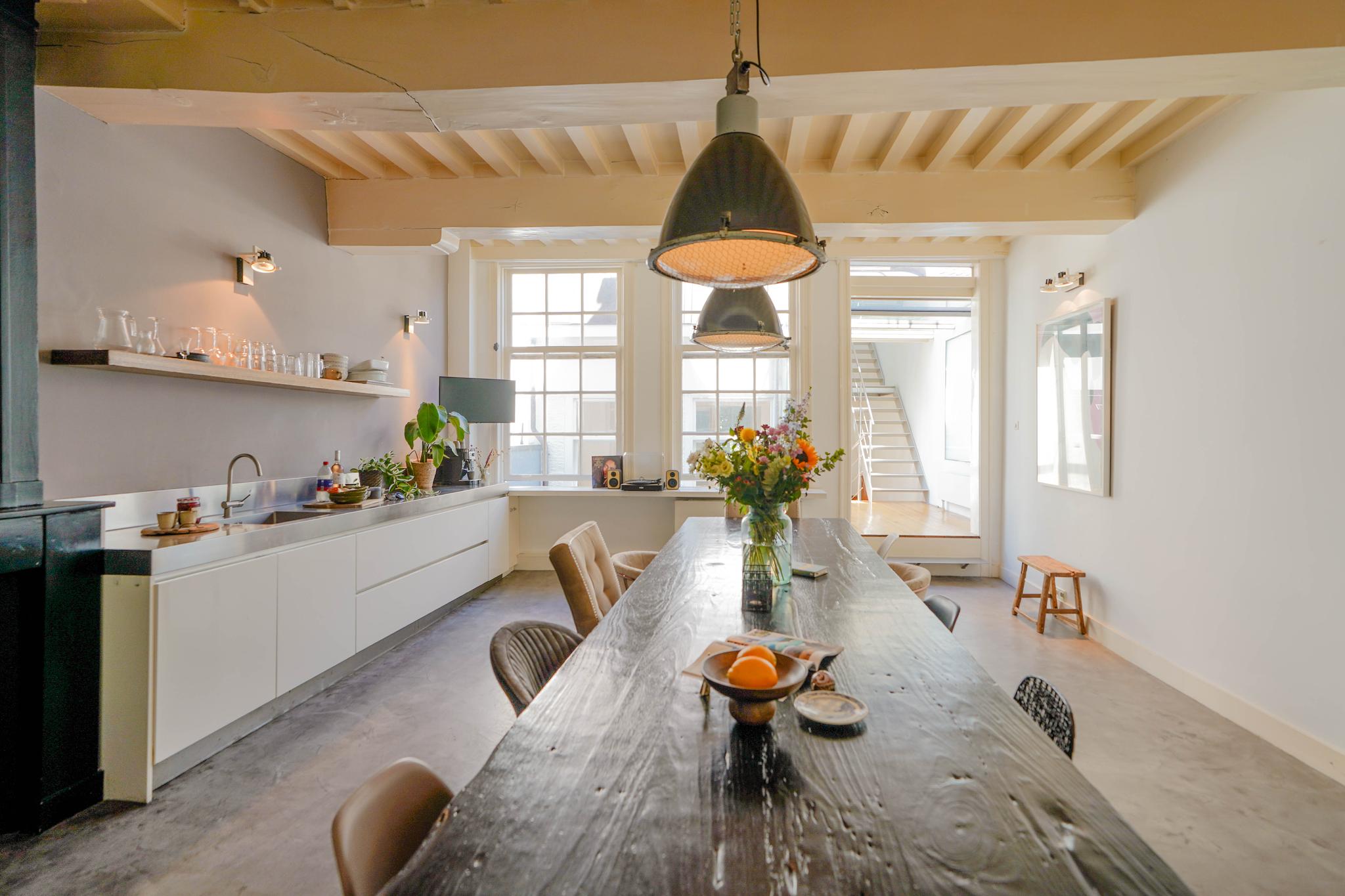 Het voorhuis is het oorspronkelijke hoofdhuis. Naast de thans verhuurde begane grond met winkel vindt je hier nu op de 1e etage de woonkamer van maar liefst 70 m² van waar je uitkijkt over de Rijn en het Stadhuisplein. Aan de achterzijde ligt de woonkeuken met ruimte. Veel ruimte. Met 50 m², lange werkbladen en een eettafel met plek voor 12 is dit nu het hart van het huis. Vanuit hier is ook een van de doorgangen naar het achterhuis langs de binnenplaats wat voor veel lichtinval zorgt. Een etage hoger zijn de slaapverdiepingen. Hier is de woning afgepeld tot de structuur met de prachtige houten sporenkap vol in het zicht. Tussen de sporen zijn hoge Velux ramen aangebracht die zorgen voor een fraaie lichtinval op elk moment van de dag. Aan voorzijde vindt je verdeeld over twee verdiepingen drie slaapkamers, een badkamer en vooral veel bergruimte met inbouwkasten en een linnenkamer. Aan achterzijde beslaat de master bedroom met badkamer ensuite de gehele kap met een nok van maar liefst 8 meter hoog.