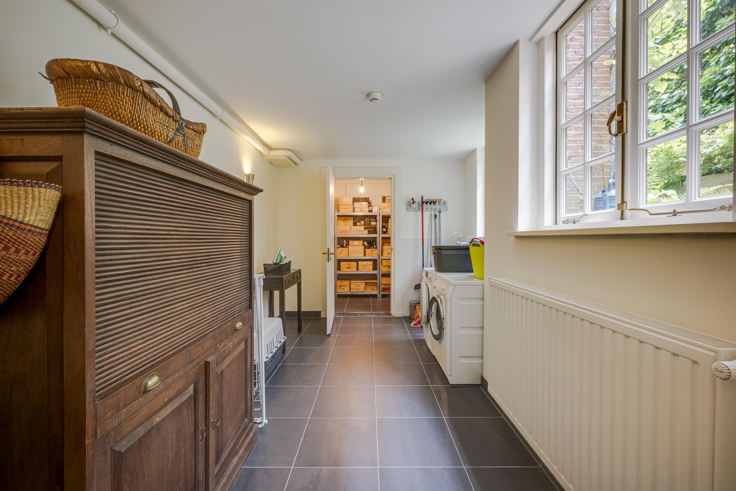 Ruime en lichte entree. Deur naar de woonkeuken. Dit is een prachtige en zeer sfeervolle ruimte met 2 hoge ramen aan de grachtzijde en openslaande deuren naar de achtertuin. De luxe Bulthaup keuken is uiteraard voorzien van alle gebruikelijke apparatuur. De brede gashaard aan de tuinzijde voegt extra sfeer toe aan het eet- en zitgedeelte van deze ruimte. De lange gang met Delfts Blauwe tegeltjes aan weerszijden leidt naar een kleine hal met toegang tot de tuin en een trap naar het souterrain. Deze is thans in gebruik als wasruimte. Aan de straatzijde bevindt zich op dit niveau een gewelfde kelder voor opslag. Terug naar de gang, Hier treft u nog een gastentoilet en aan het einde van de gang een multifunctionele kamer.