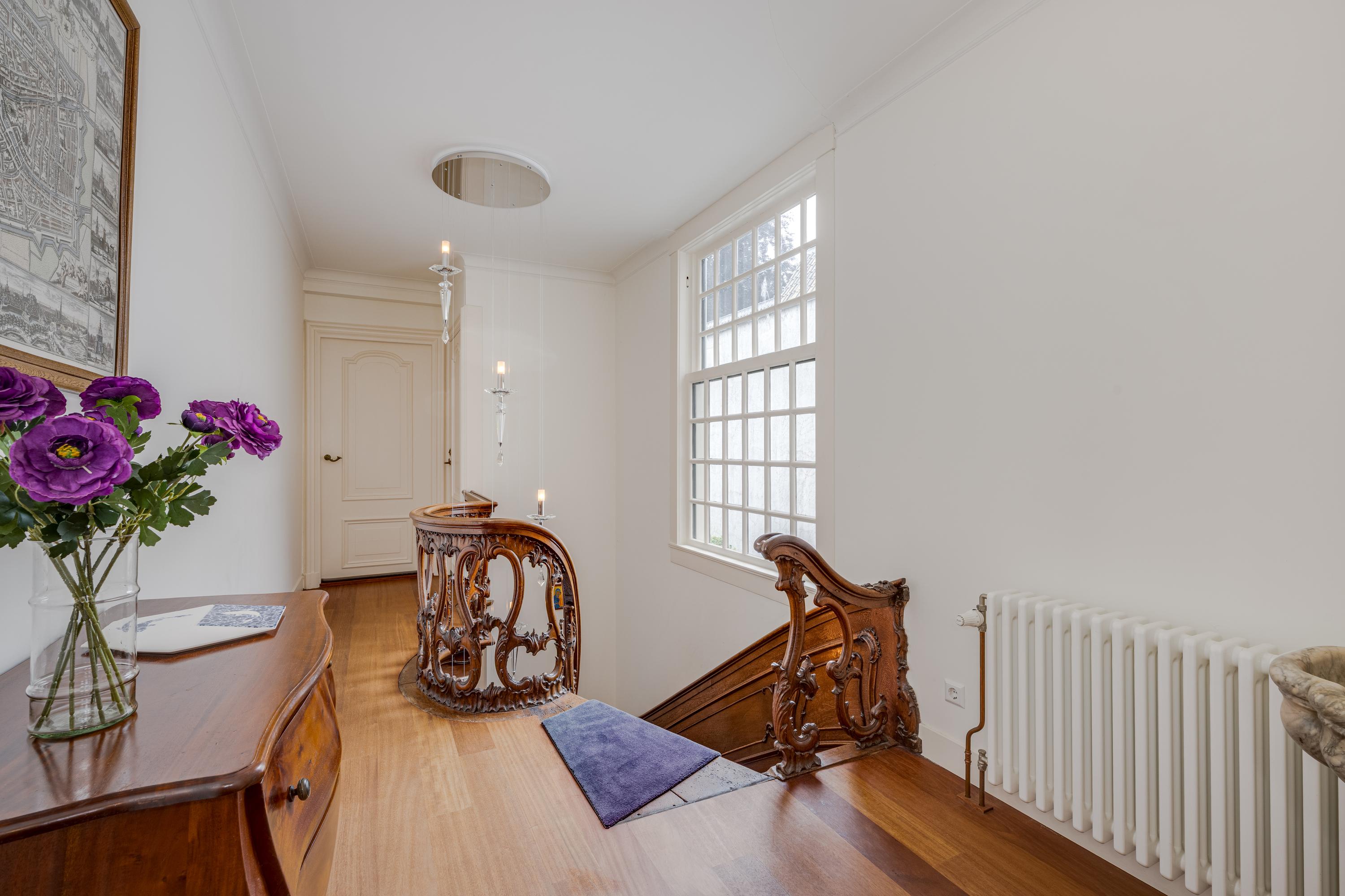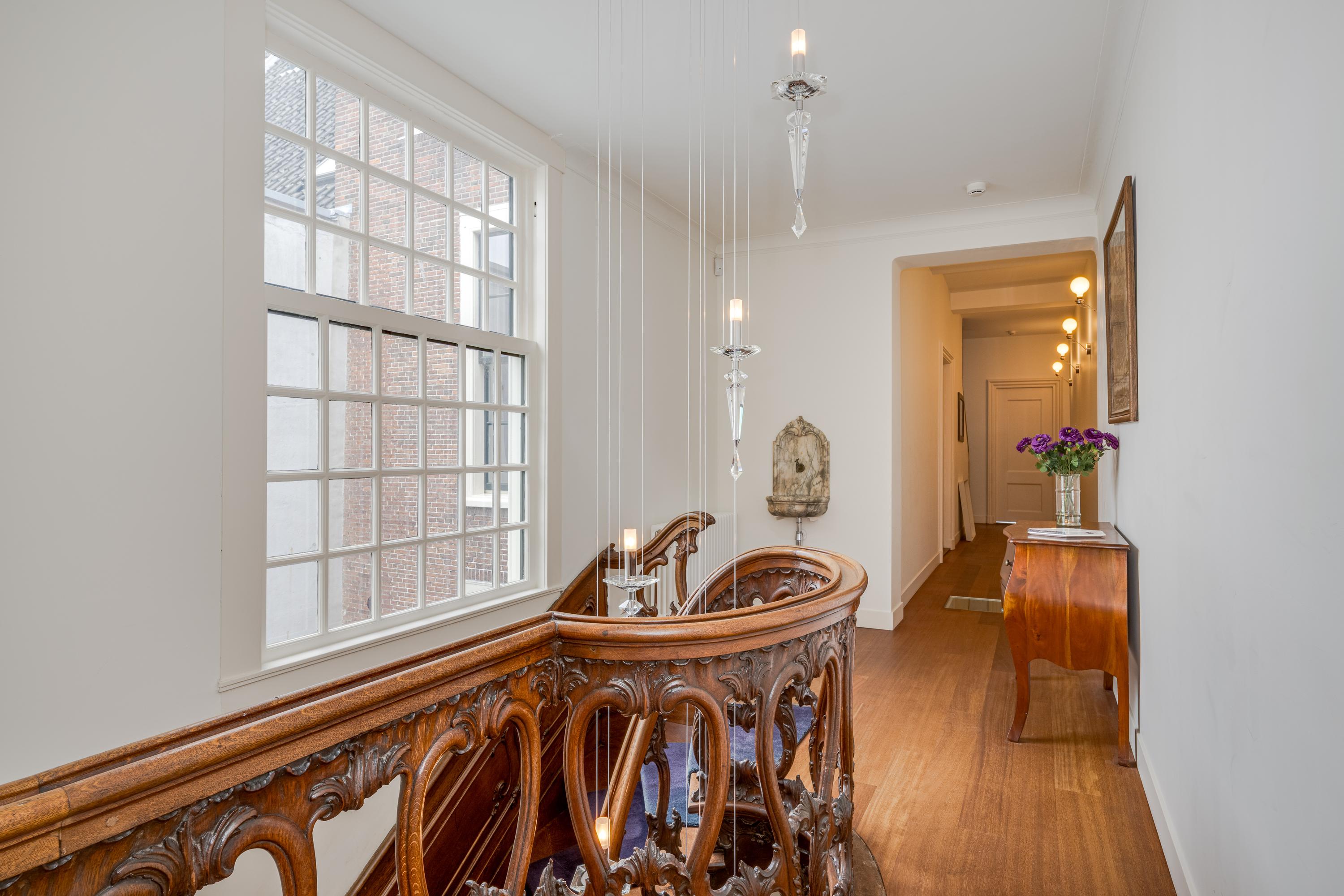 Een monumentale trap leidt naar de eerste verdieping. In het achterhuis bevindt zich een separaat toilet en een slaapkamer met moderne badkamer en suite. In het voorhuis treft u de zeer ruime en lichte woonkamer met aan de tuinzijde een zitkamer rondom de haardpartij en aan de voorzijde (3 ramen breed) een fijne lichte woonkamer met prachtig uitzicht op de gracht en de stad.