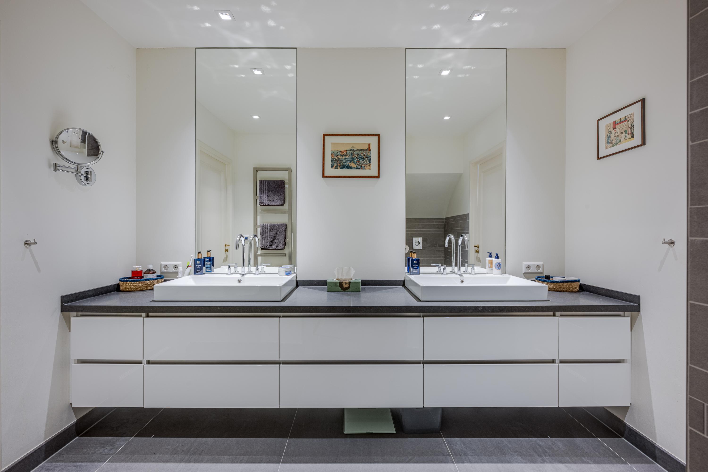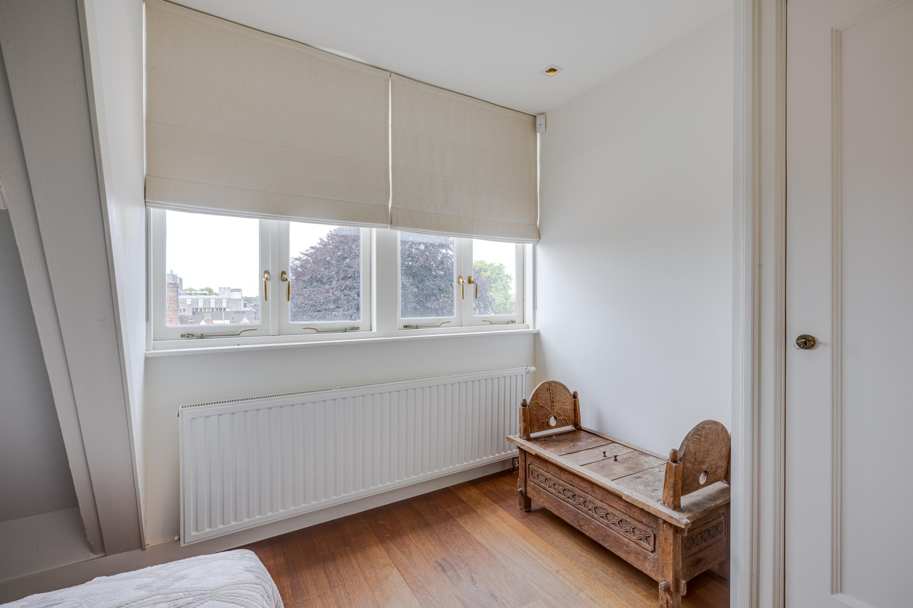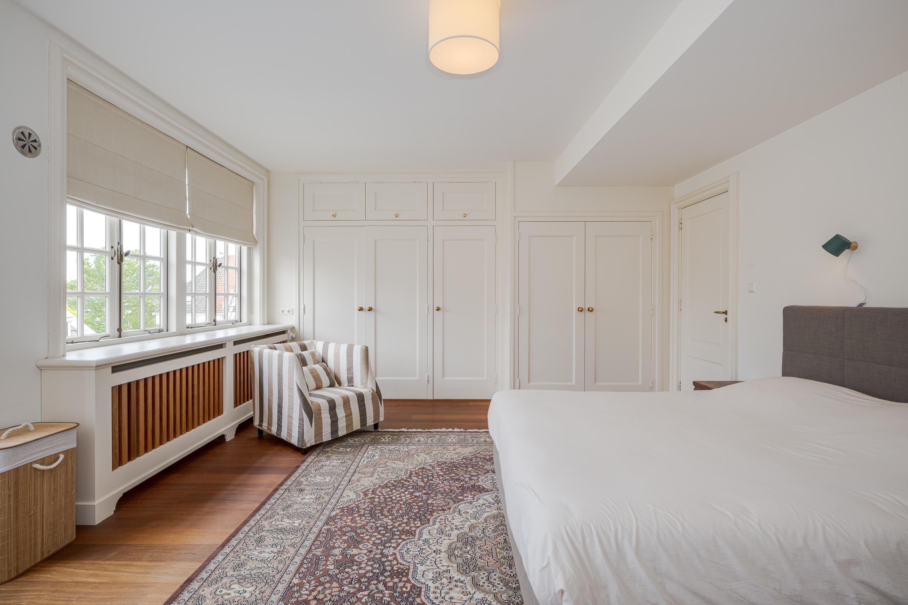 Overloop met kastenwand. Aan de achterzijde de zeer ruime ouderslaapkamer met eigen dakterras, kastenwand en badkamer en suite. Deze badkamer staat ook in verbinding met de ruime kamer aan de voorzijde. Deze is thans in gebruik als werkkamer maar, is ook uitermate geschikt als slaapkamer.
