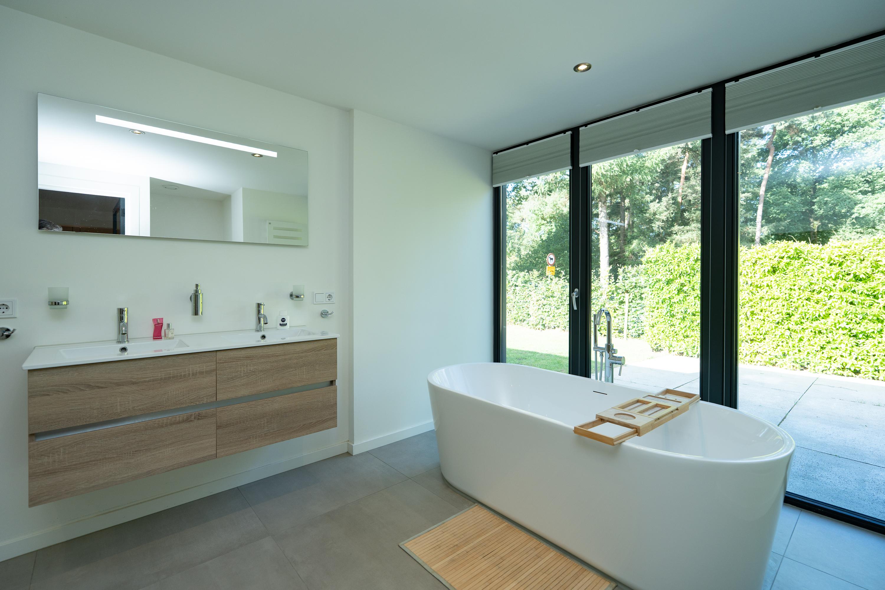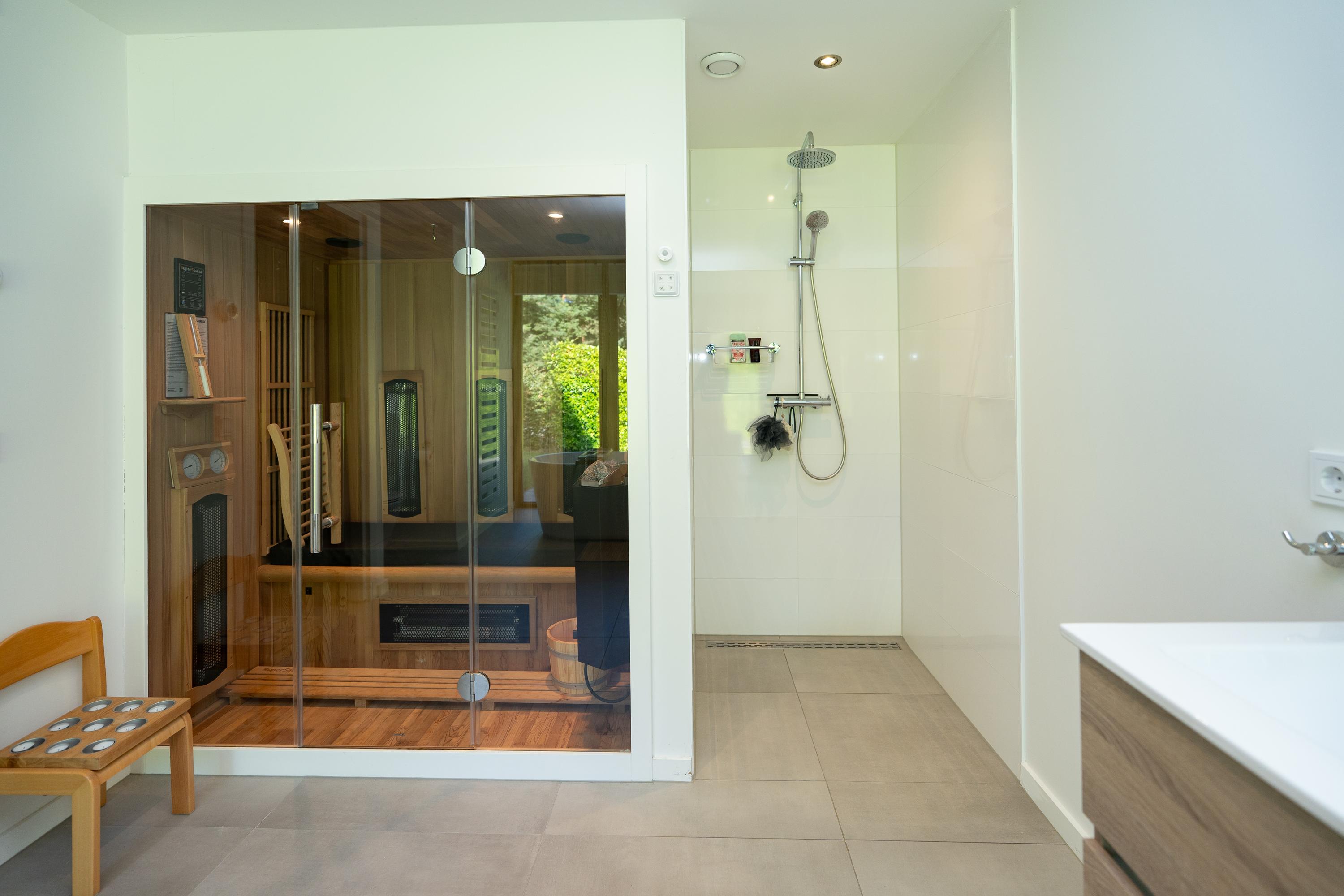 Er zijn in totaal drie slaapkamers en een multifunctionele studeerkamer op de begane grond. De studeerkamer is nu in gebruik als galerie. De masterbedroom heeft een ruime walk-in-closet en aansluitend een zeer ruime badkamer met combi sauna, vrijstaand ligbad, douche, dubbele wastafel en toilet. Hier kun je heerlijk ontspannen en tijdens het badderen genieten van de groene omgeving. Bij de andere slaapkamers is de tweede badkamer gesitueerd, welke voorzien is van een douche, dubbele wastafel en een toilet.