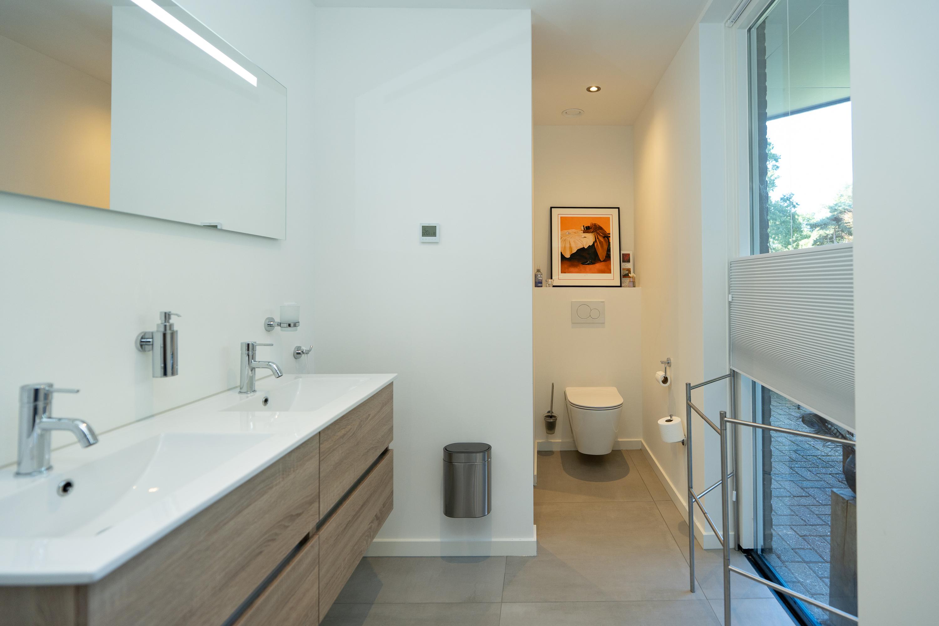 Entree, royale hal die gelijk het ruimtelijke karakter van de woning benadrukt. In de hal bevinden zich de meterkast, vliering en het eerste toilet met fonteintje. Een ruime woonkamer met hoge nok, waar de vele ramen aan alle zijden zorgen voor een prachtige lichtinval en een open sfeer. Zowel aan de voor- als achterzijde zijn er schuifpuien naar de voor- en achtertuin. Verder is er nog een ruime inpandige berging onder de trap en de trapopgang zelf is fraai weggewerkt. Moderne open keuken met een groot kookeiland. De hoge kasten zijn fraai weggewerkt in de muur en de keuken is voorzien van diverse luxe inbouwapparatuur. De bijkeuken is gesitueerd aan de voorzijde van de woning en heeft een keukenblok, opstelling van de warmtepomp en boiler en een extra buitendeur.