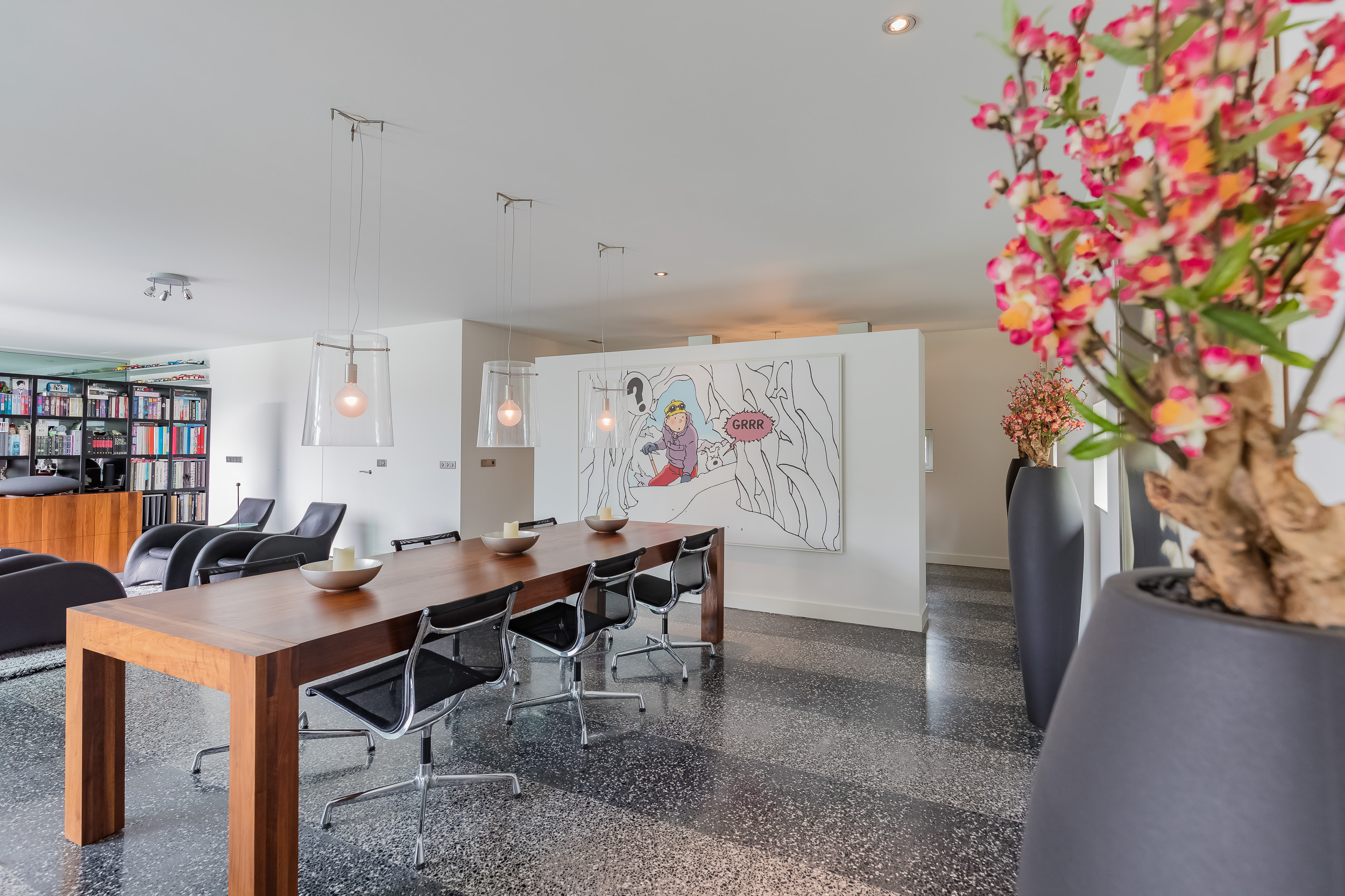 De inpandige garage van 76 m² is volledig geïsoleerd en ook hier is de terrazzo vloer voorzien van vloerverwarming. De glazen binnenwand is eenvoudig te verwijderen zodat de gehele begane grond één ruimte wordt. Het woonoppervlak komt hiermee op 356m² (€ 7.008,43 m²)