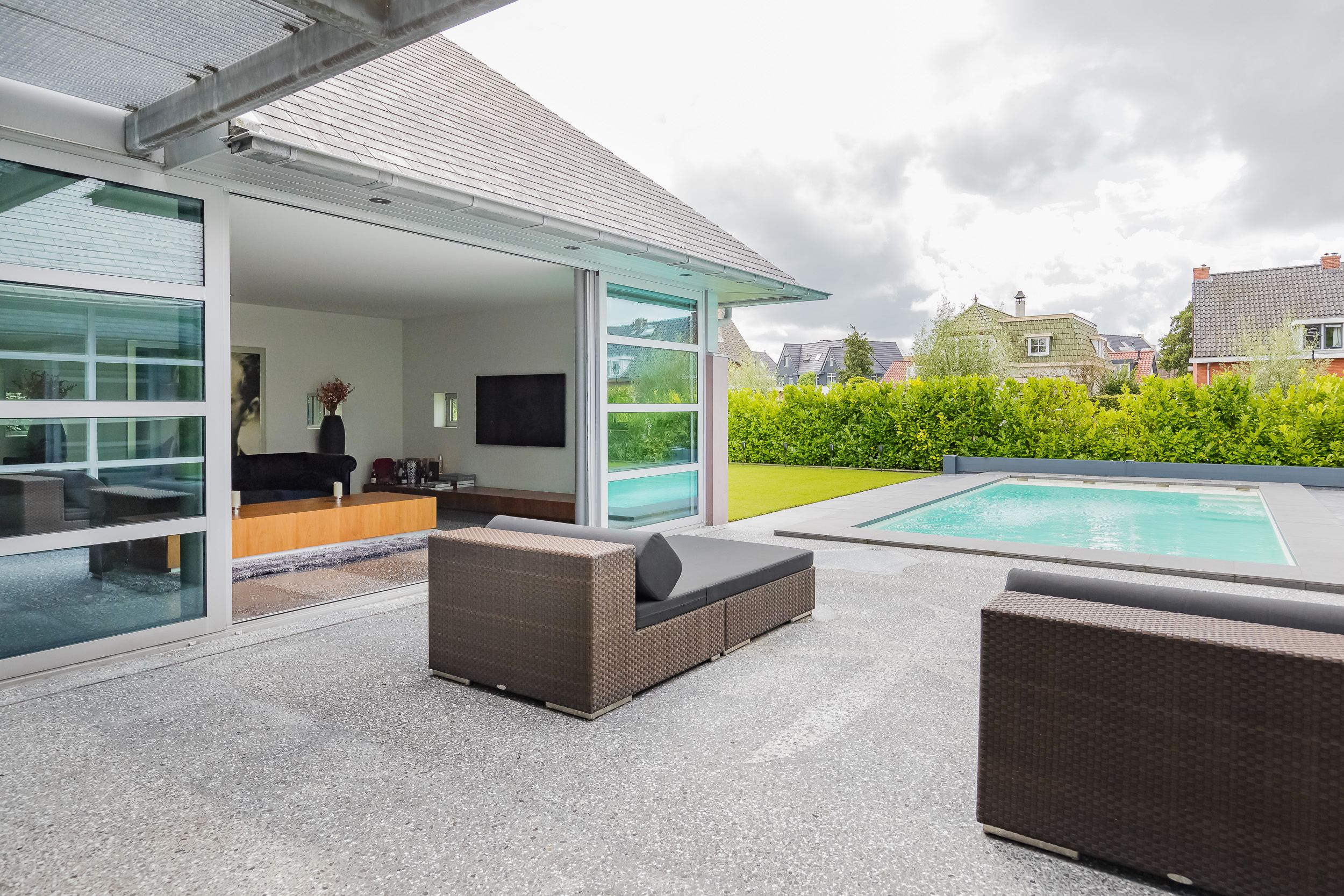 De gehele begane grond is voorzien van een terrazzovloer met vloerverwarming. Om de binnen/buiten beleving te versterken geven grote schuifpuien toegang tot de tuin en is de Terrazzovloer naar buiten doorgetrokken.