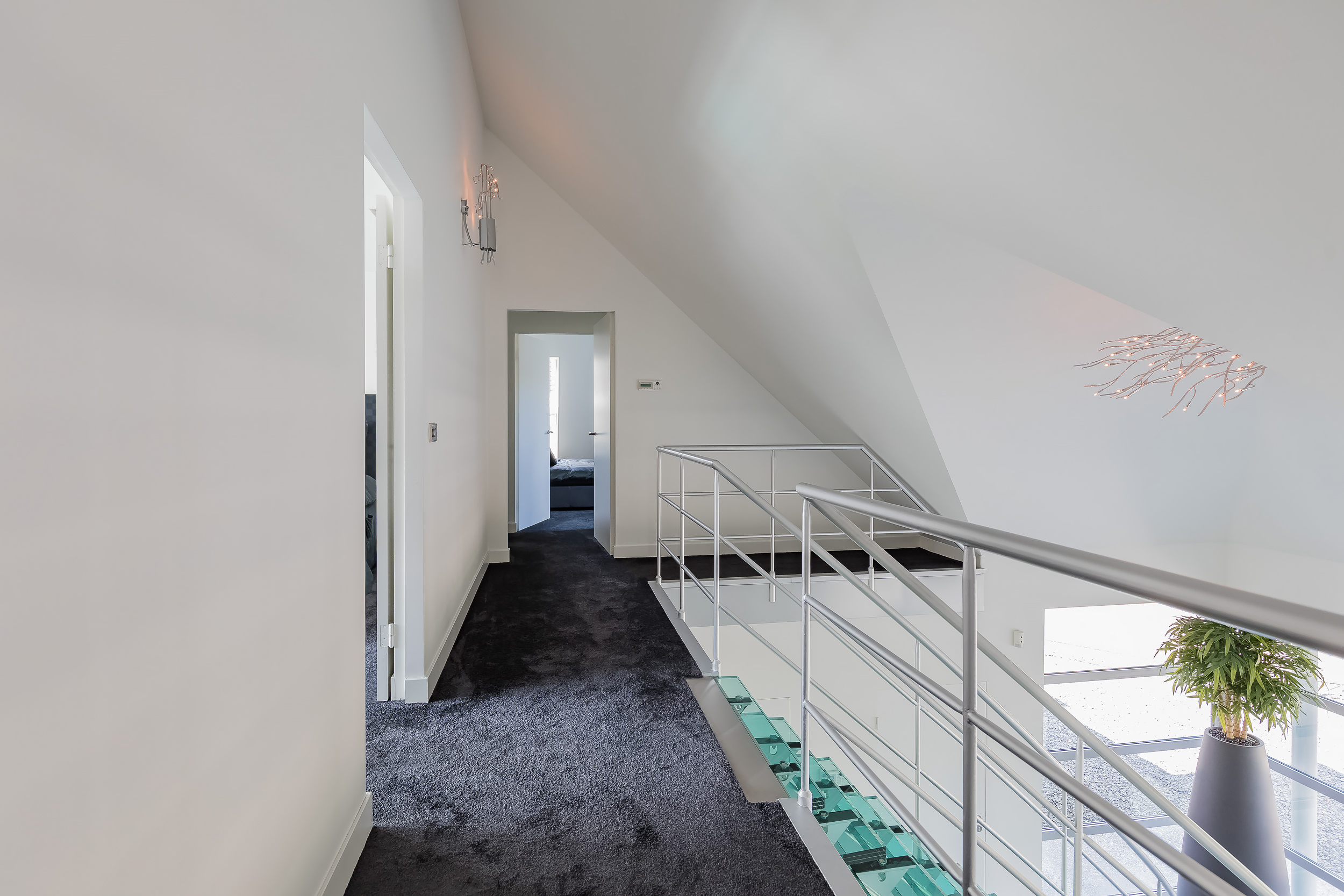 Op deze etage zijn 3 slaapkamers, 2 badkamers en een grote bergruimte. De zeer royale hoofdslaapkamer heeft een eigen luxe badkamer en een ruime kleedkamer. Het balkon is alleen vanuit deze kamer toegankelijk. 20 Dakramen zorgen voor extra lichtinval en ook hierin is de symmetrie doorgetrokken.