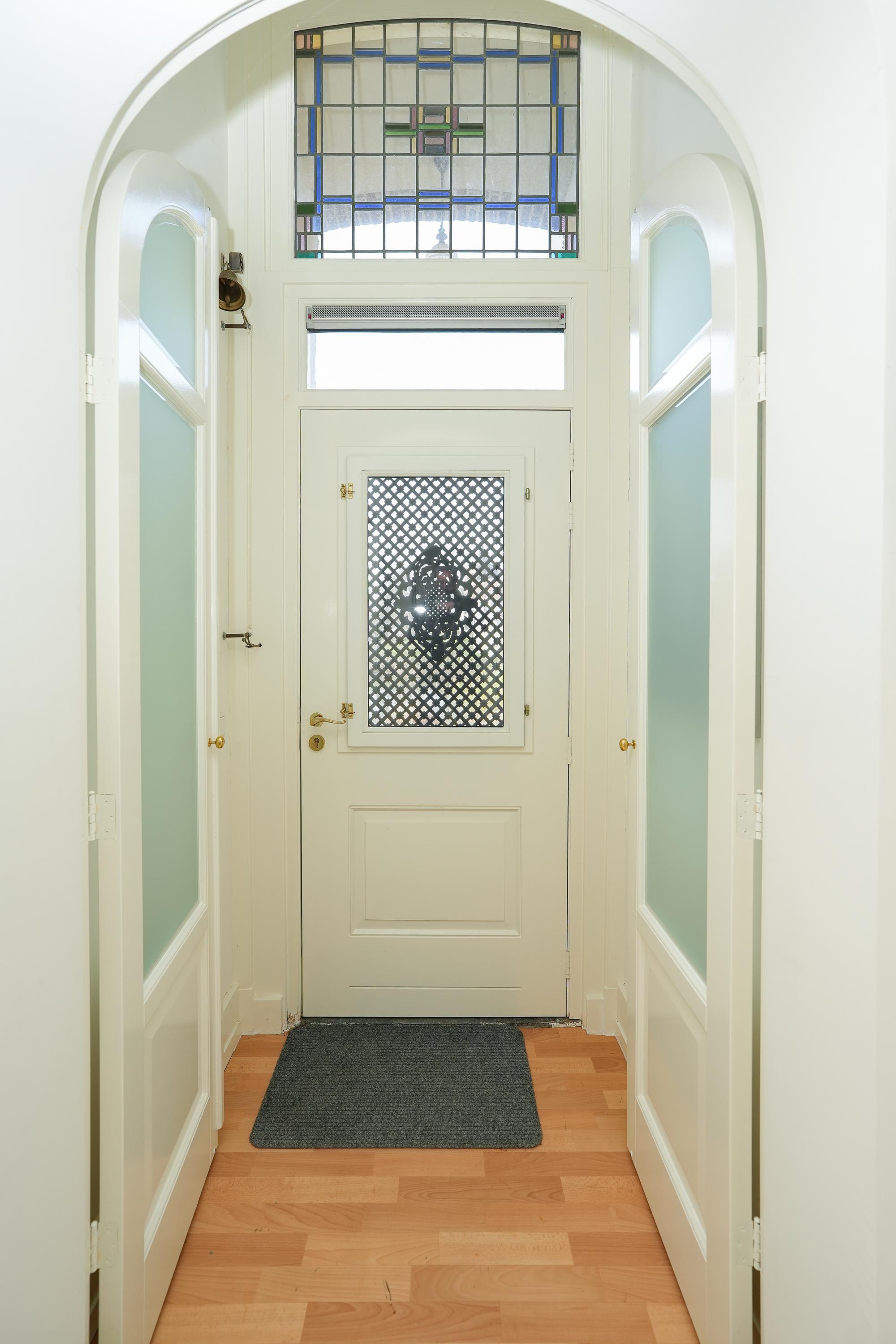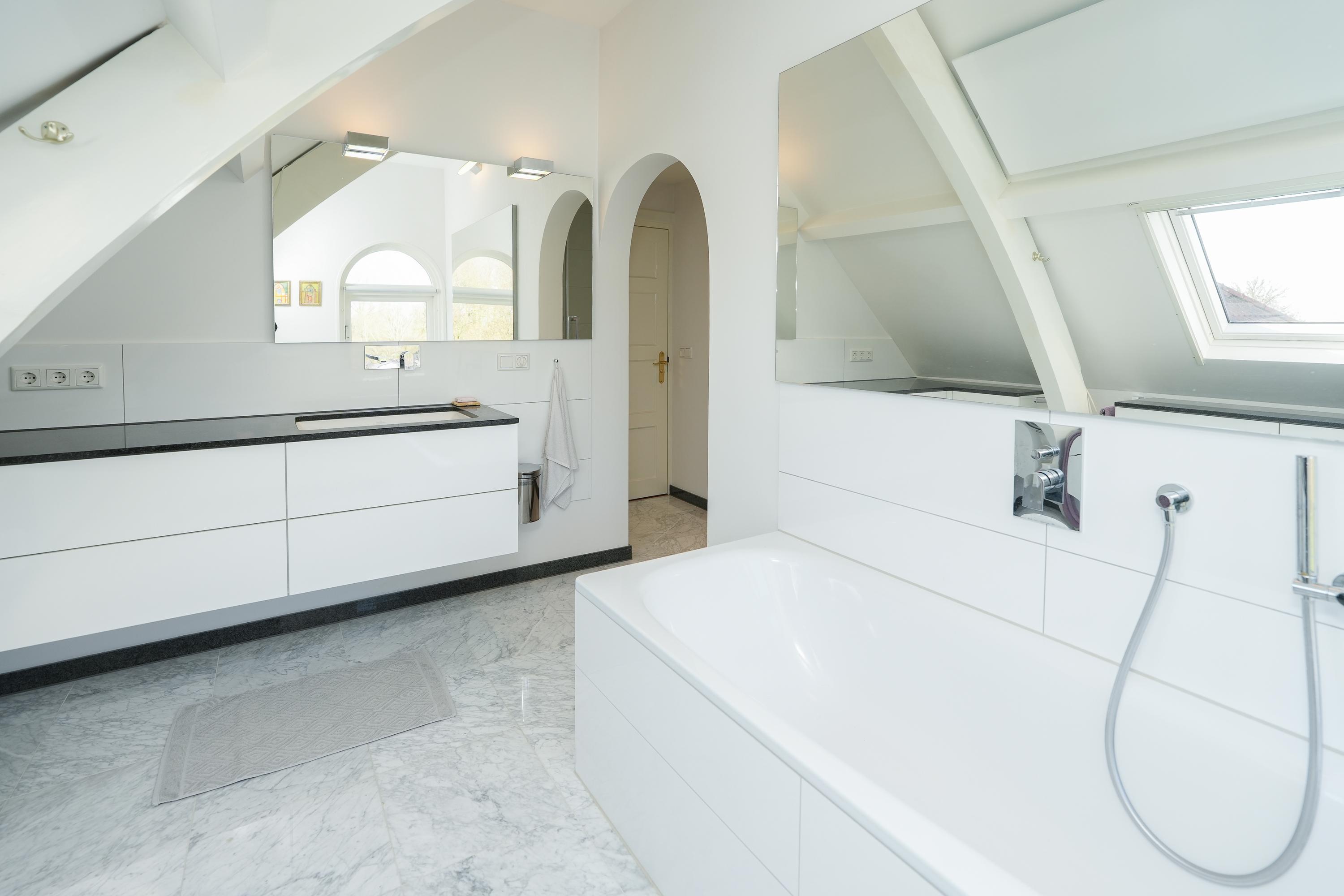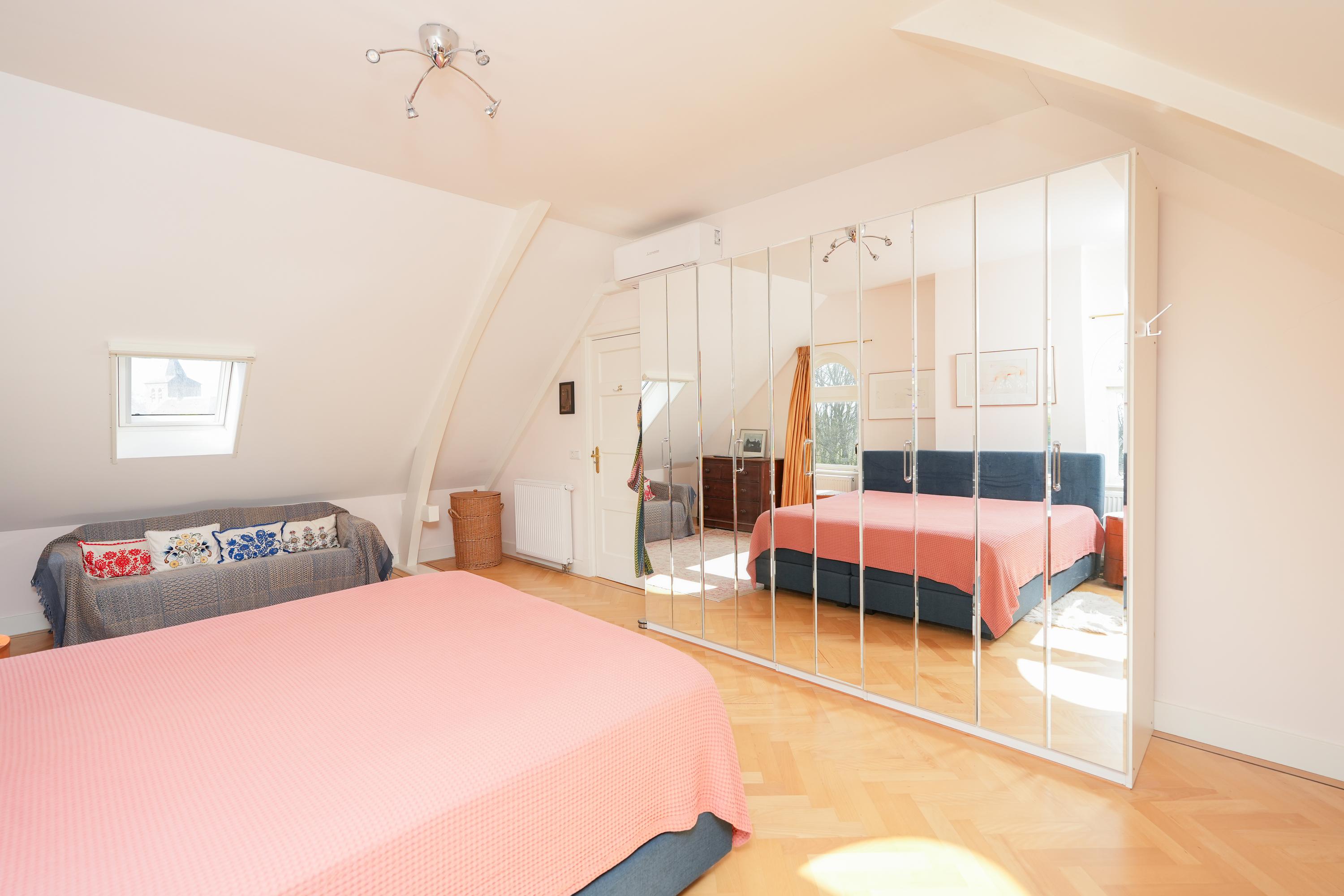 Via de ruime traphal bereikt u de eerste verdieping. De royale overloop en brede gang geven toegang tot een comfortabele badkamer, een separaat derde toilet en twee slaapkamers. De hoofdslaapkamer – oorspronkelijk twee kamers – biedt een uitzonderlijk ruimtelijk gevoel. Daarnaast is er een tweede, kleinere slaapkamer en toegang tot de praktische opbergzolder.