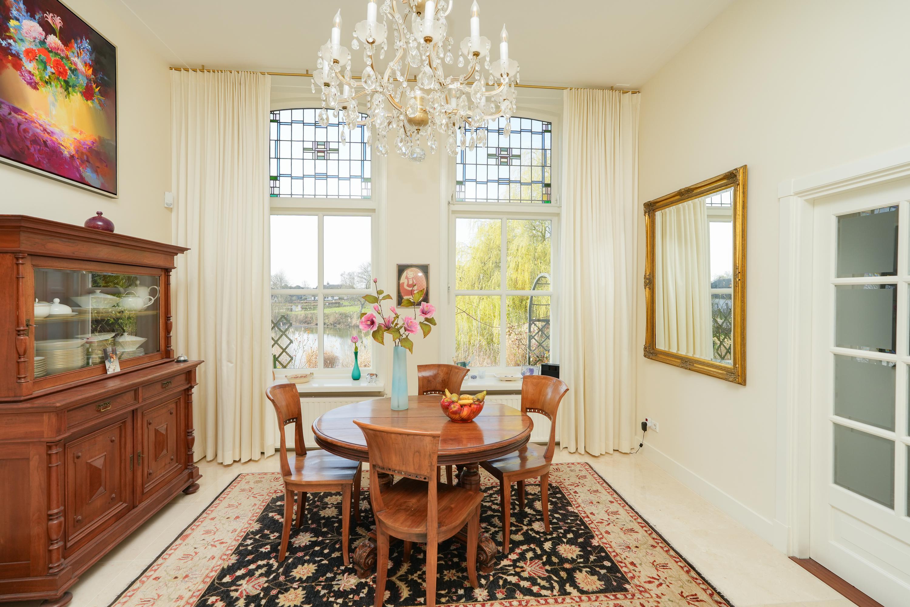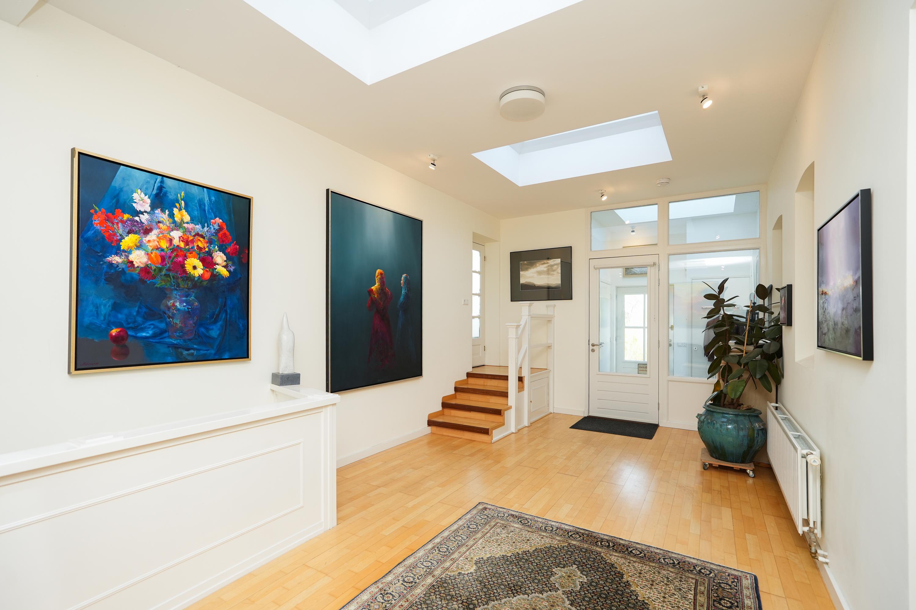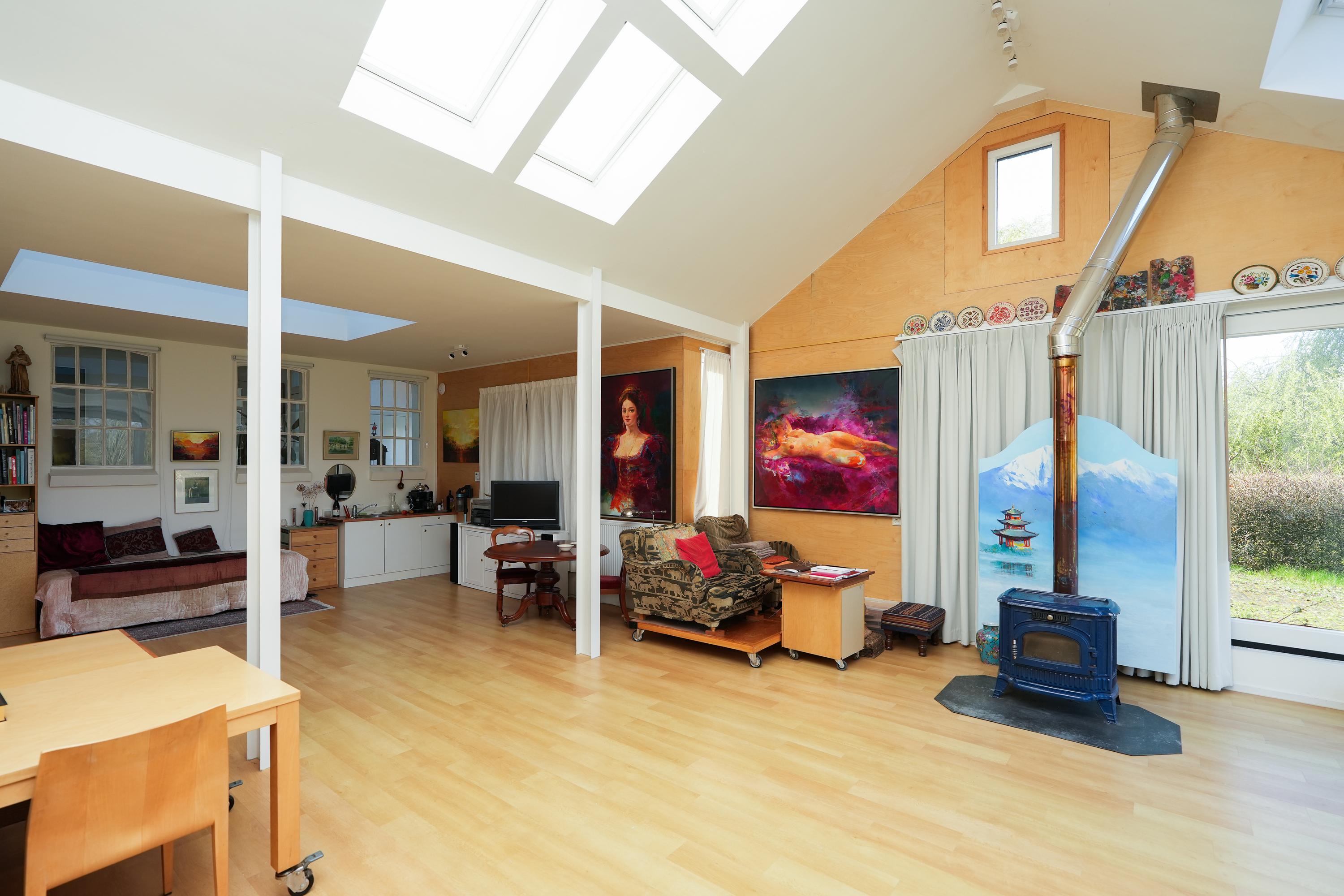 Grenzend aan de keuken ligt de galerie, bereikbaar via zowel de keuken als een eigen buitendeur. Het is een prachtige overgang tussen binnen en buiten. Vanuit de galerie betreedt u het indrukwekkende atelier. Dankzij de royale raampartijen geniet u hier van een weids uitzicht over de tuin, de kolk en de omliggende weilanden. Een inspirerende plek voor werk, kunst of bezinning.