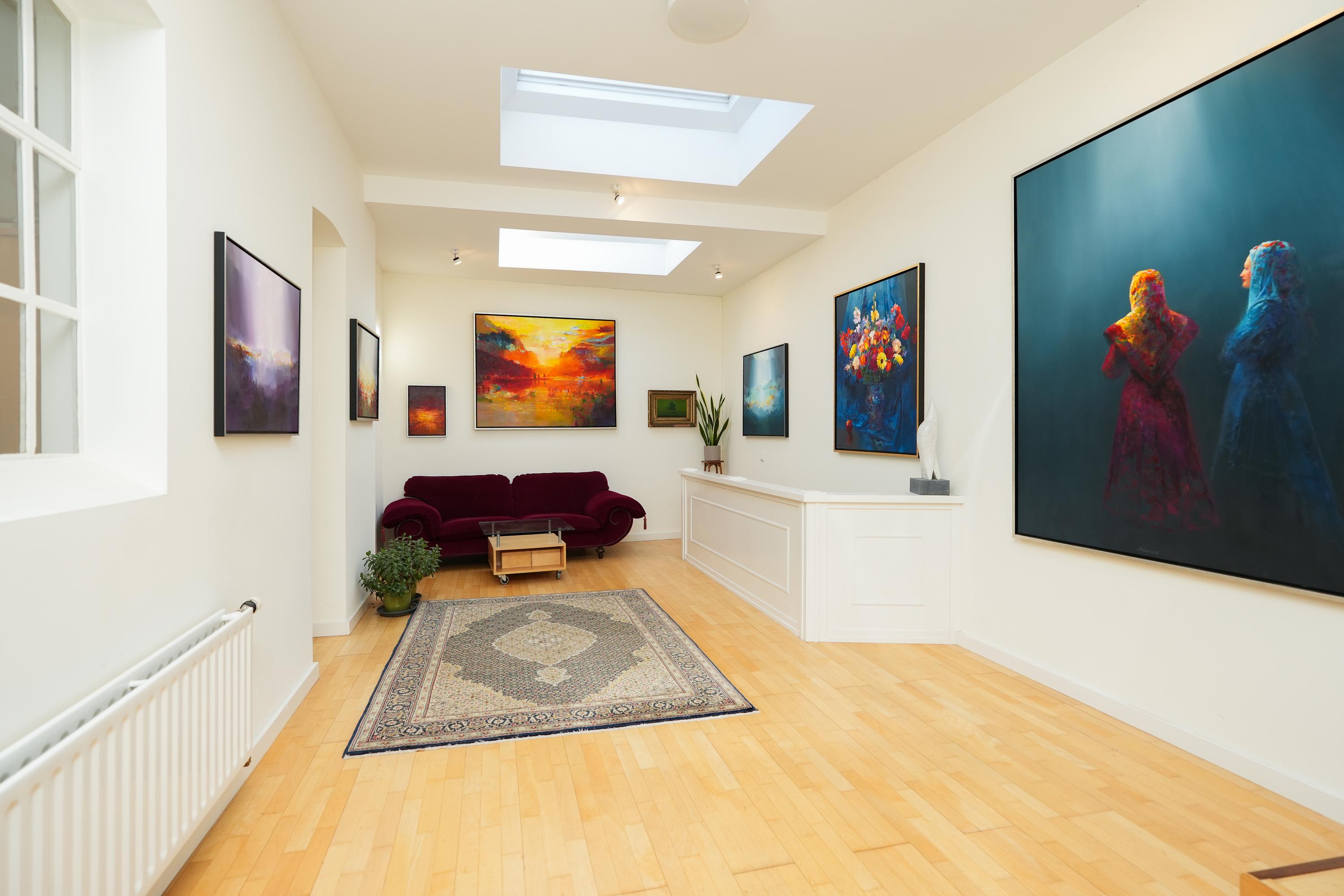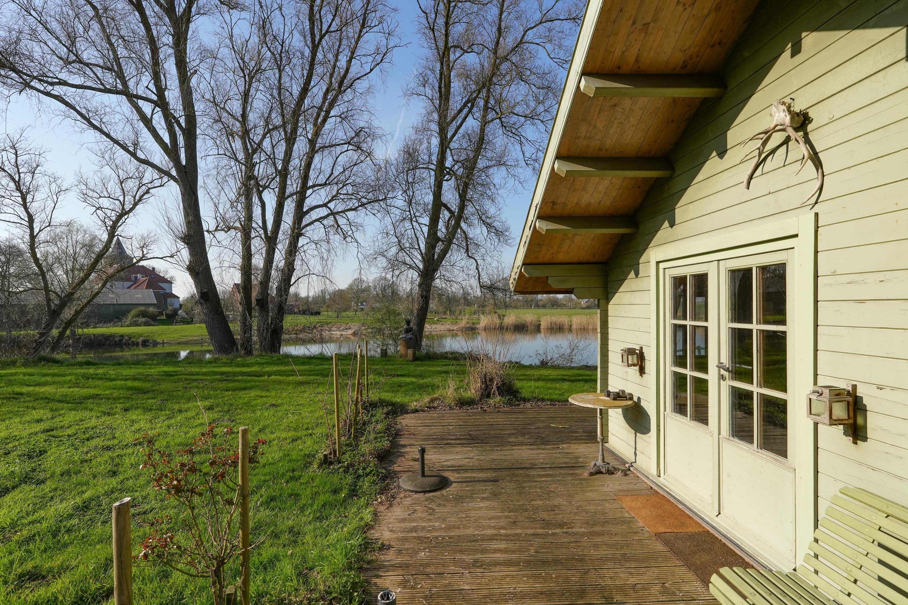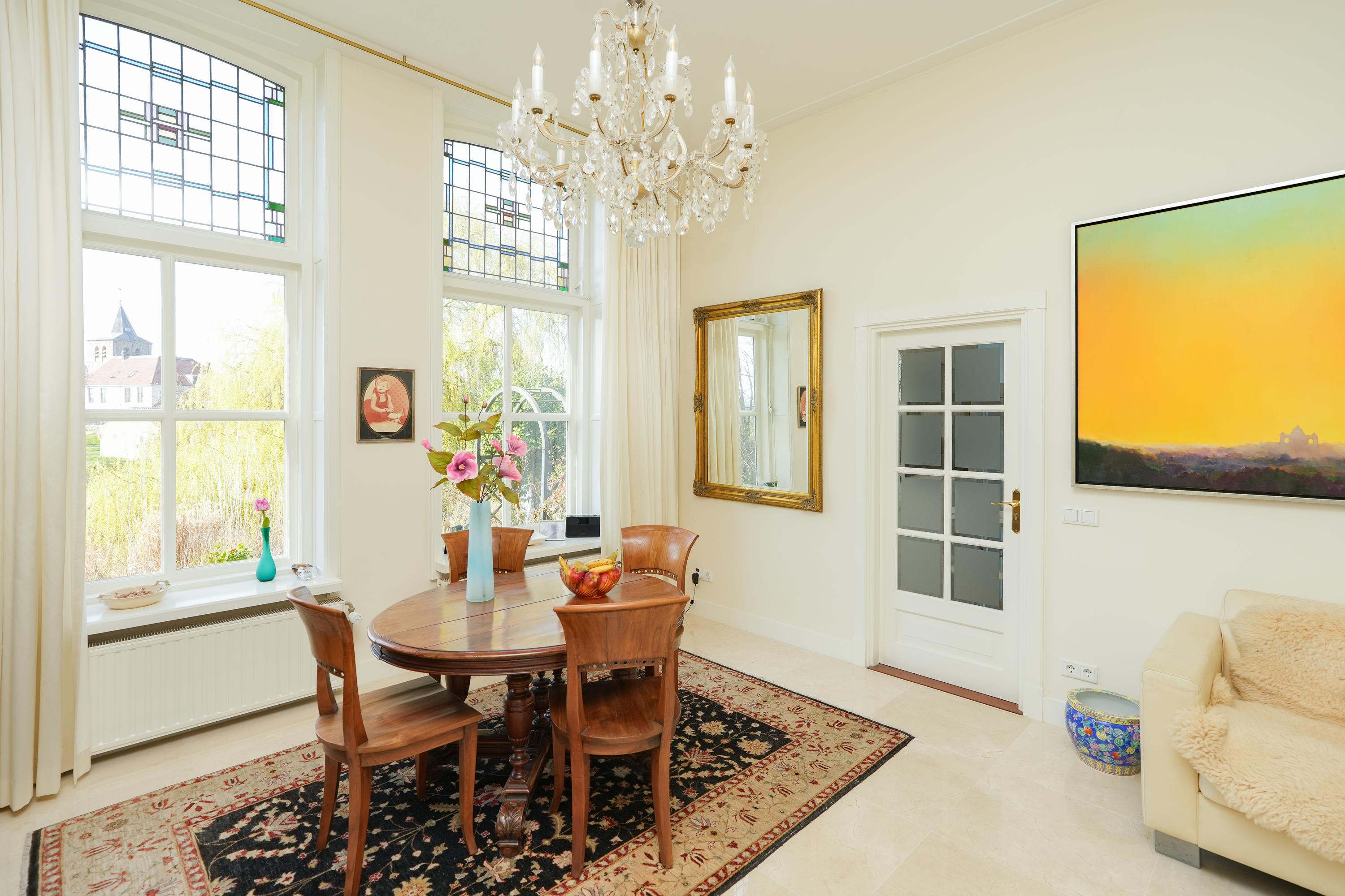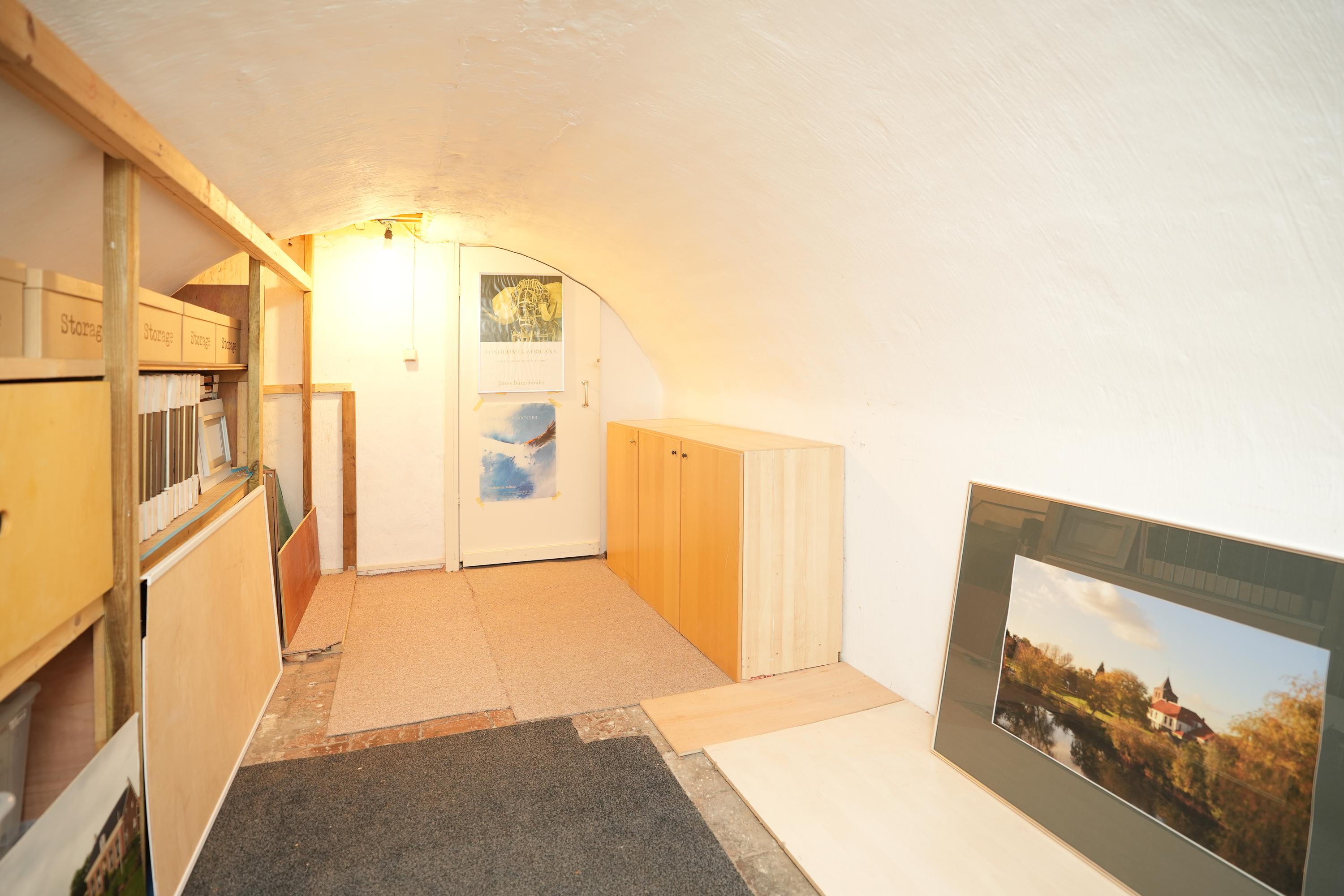Grenzend aan de keuken ligt de galerie, bereikbaar via zowel de keuken als een eigen buitendeur. Het is een prachtige overgang tussen binnen en buiten. Vanuit de galerie betreedt u het indrukwekkende atelier. Dankzij de royale raampartijen geniet u hier van een weids uitzicht over de tuin, de kolk en de omliggende weilanden. Een inspirerende plek voor werk, kunst of bezinning.