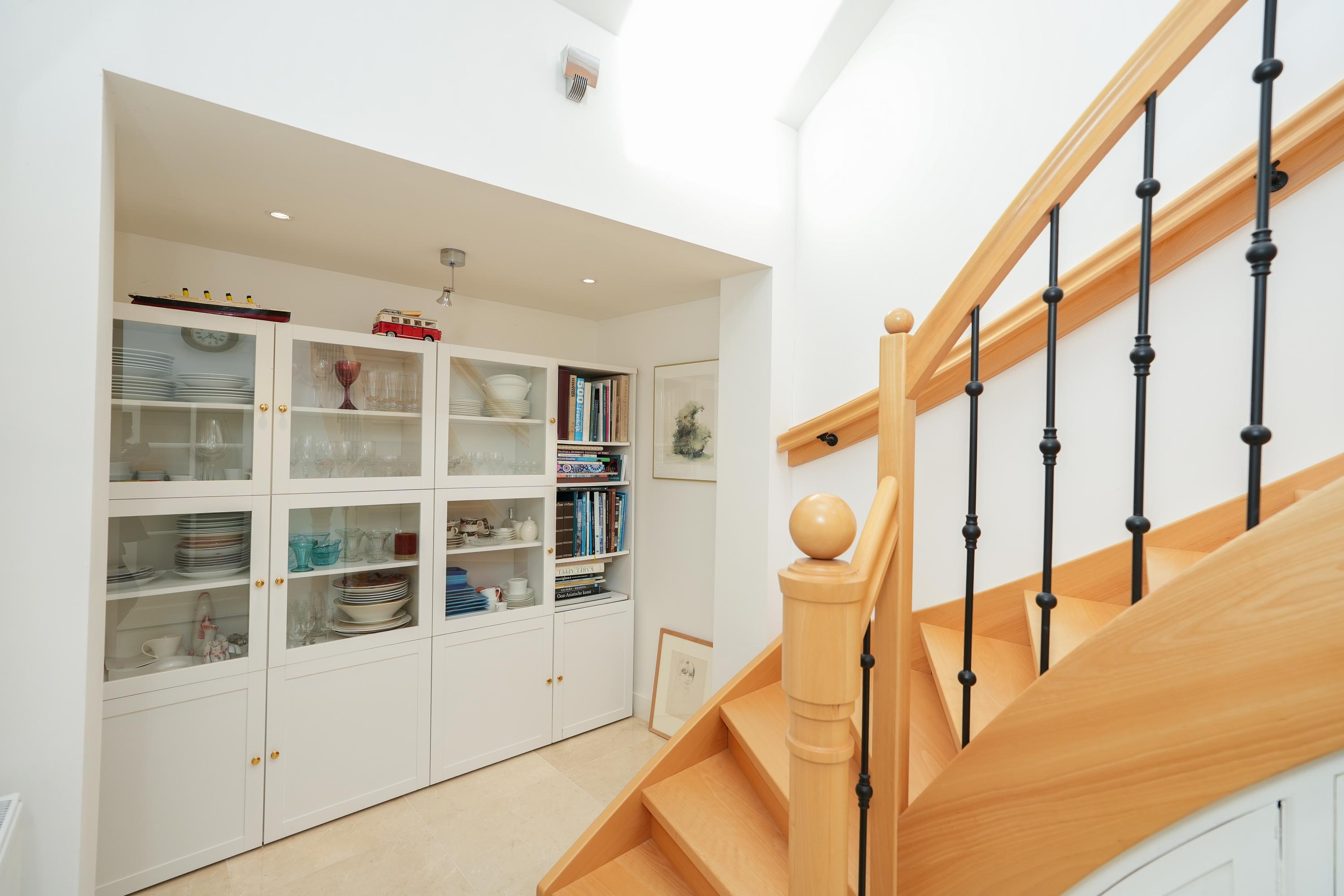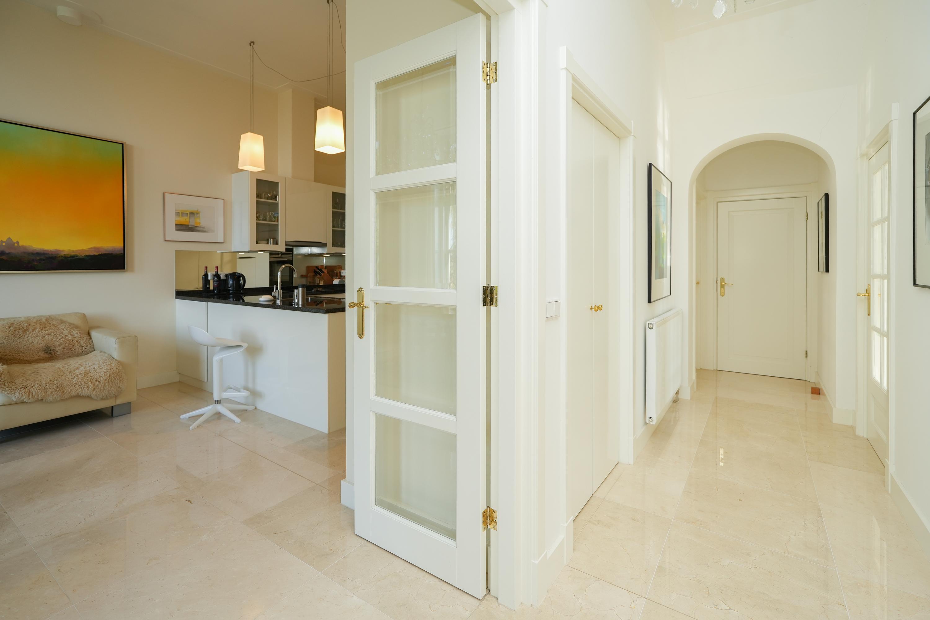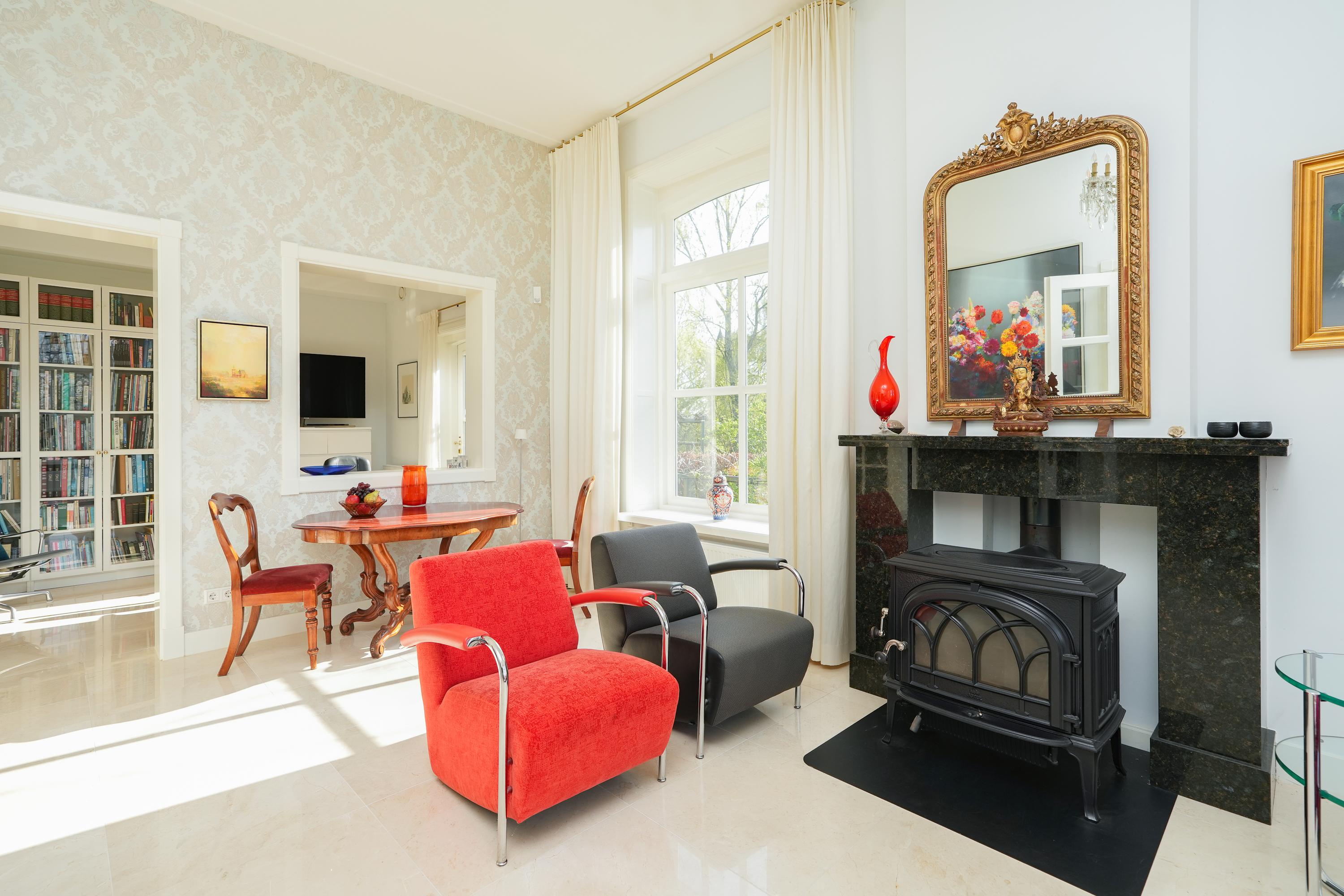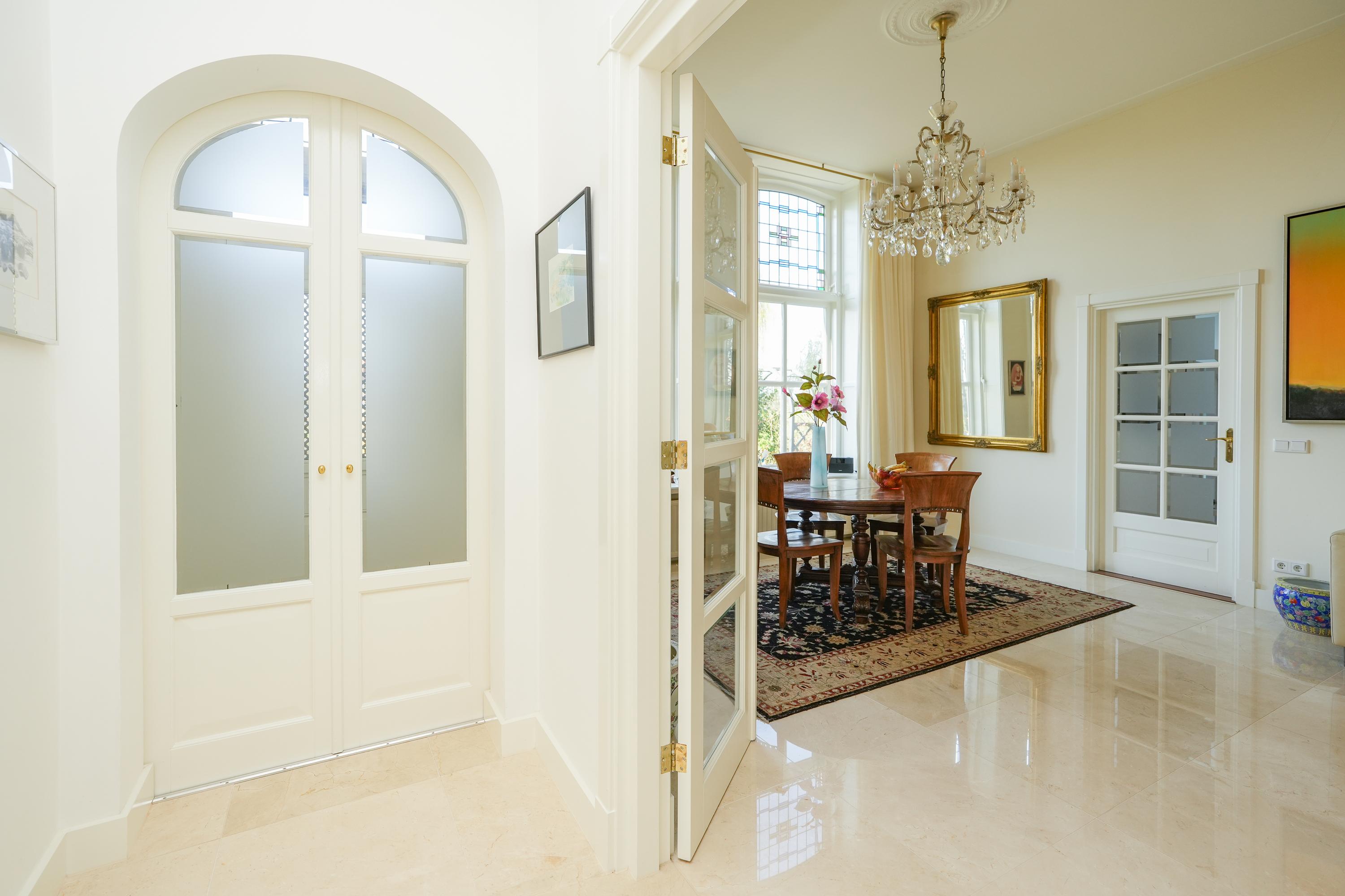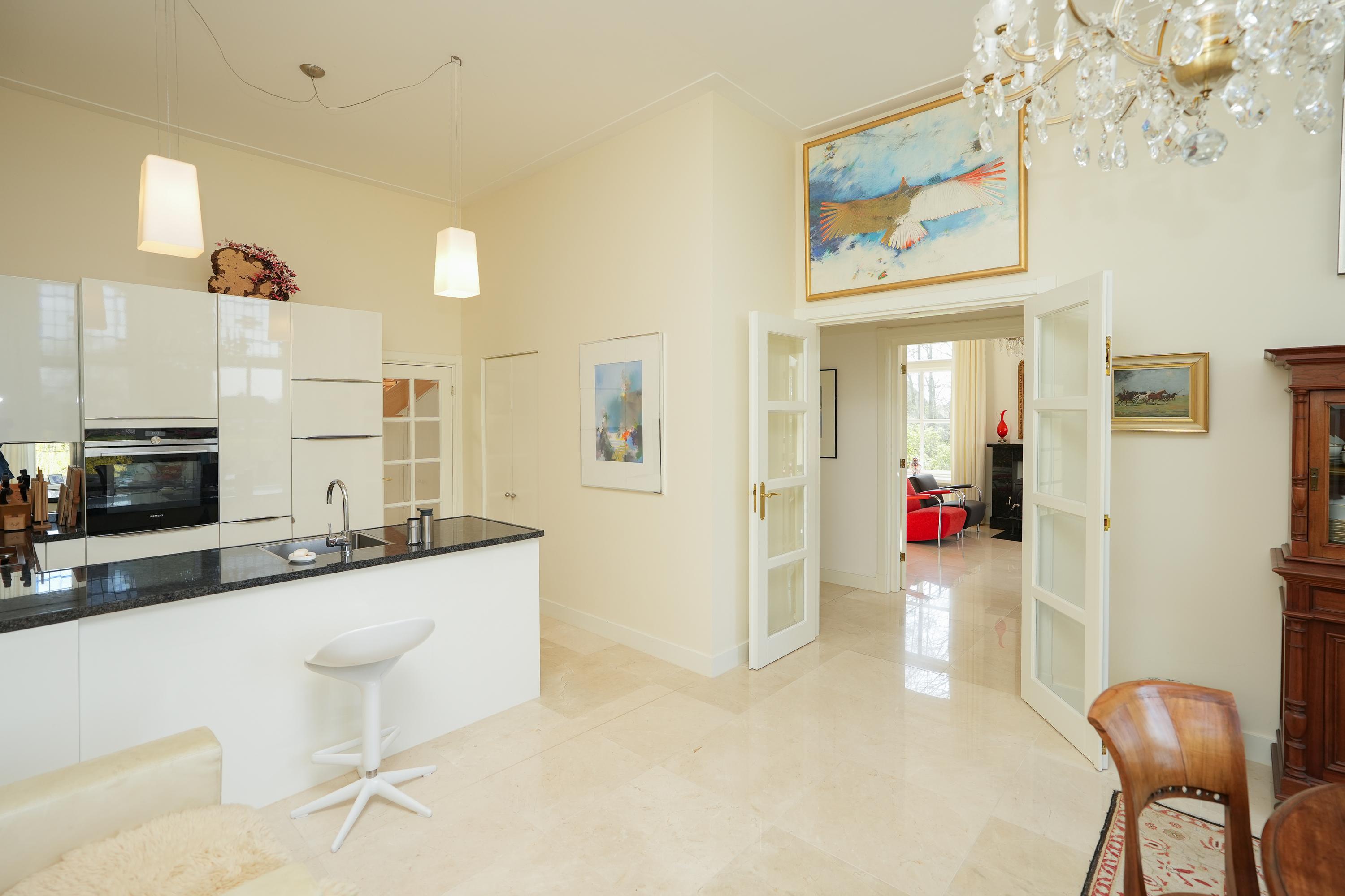 Een brede gang vormt de elegante verbinding tussen de leefruimtes. Aan de ene zijde bevindt zich de sfeervolle keuken met eetkamer; aan de andere zijde de stijlvolle woonkamer en een intieme bibliotheek.