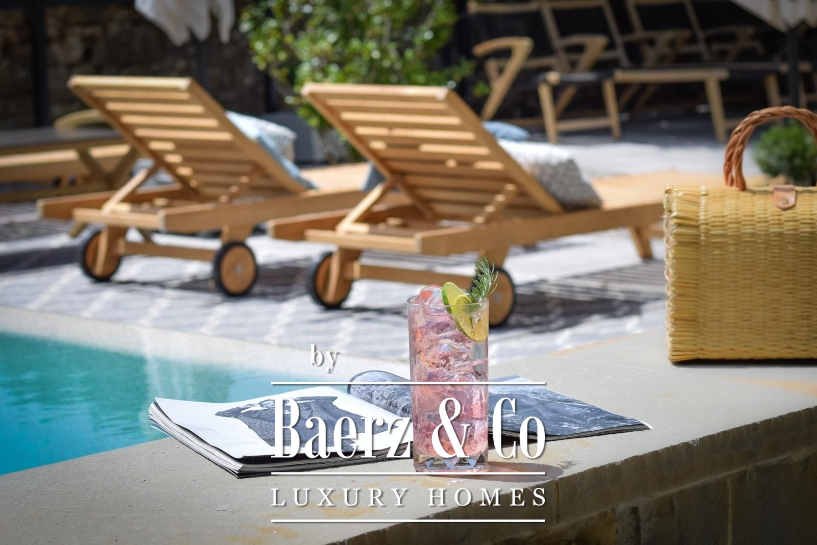 De begane grond draait om een riant gastronomisch vertrek: een professionele keuken en stijlvolle eetkamer grenzen direct aan de mediterrane tuinen en creëren een soepele overgang voor intieme bijeenkomsten of exclusieve evenementen. In het souterrain weerspiegelt de met steen uitgehouwen wijnkelder het verbonden karakter van het landgoed met de streek— ingericht voor de presentatie van lokale topwijnen.