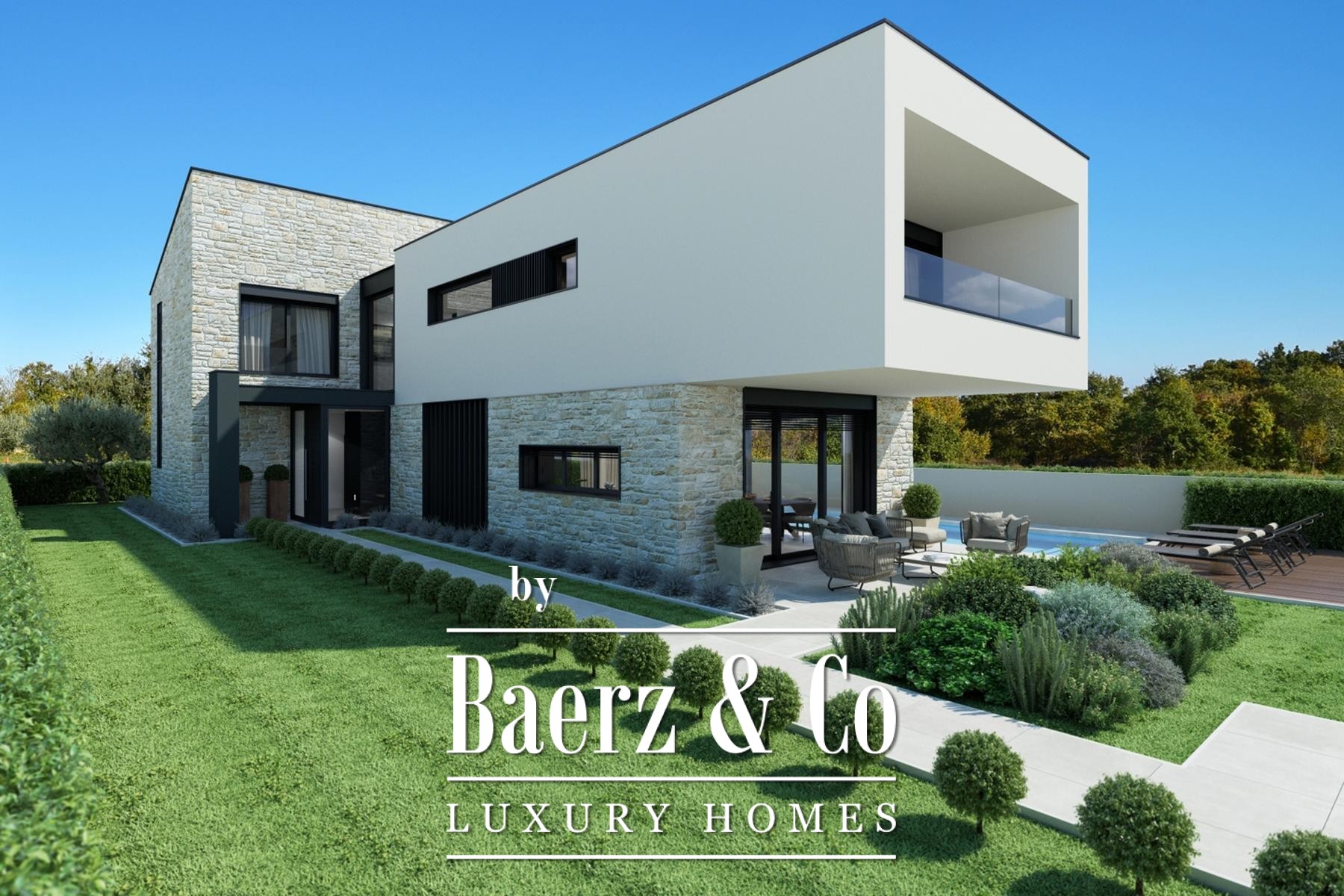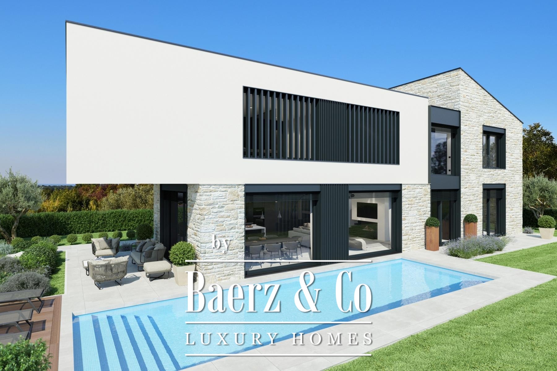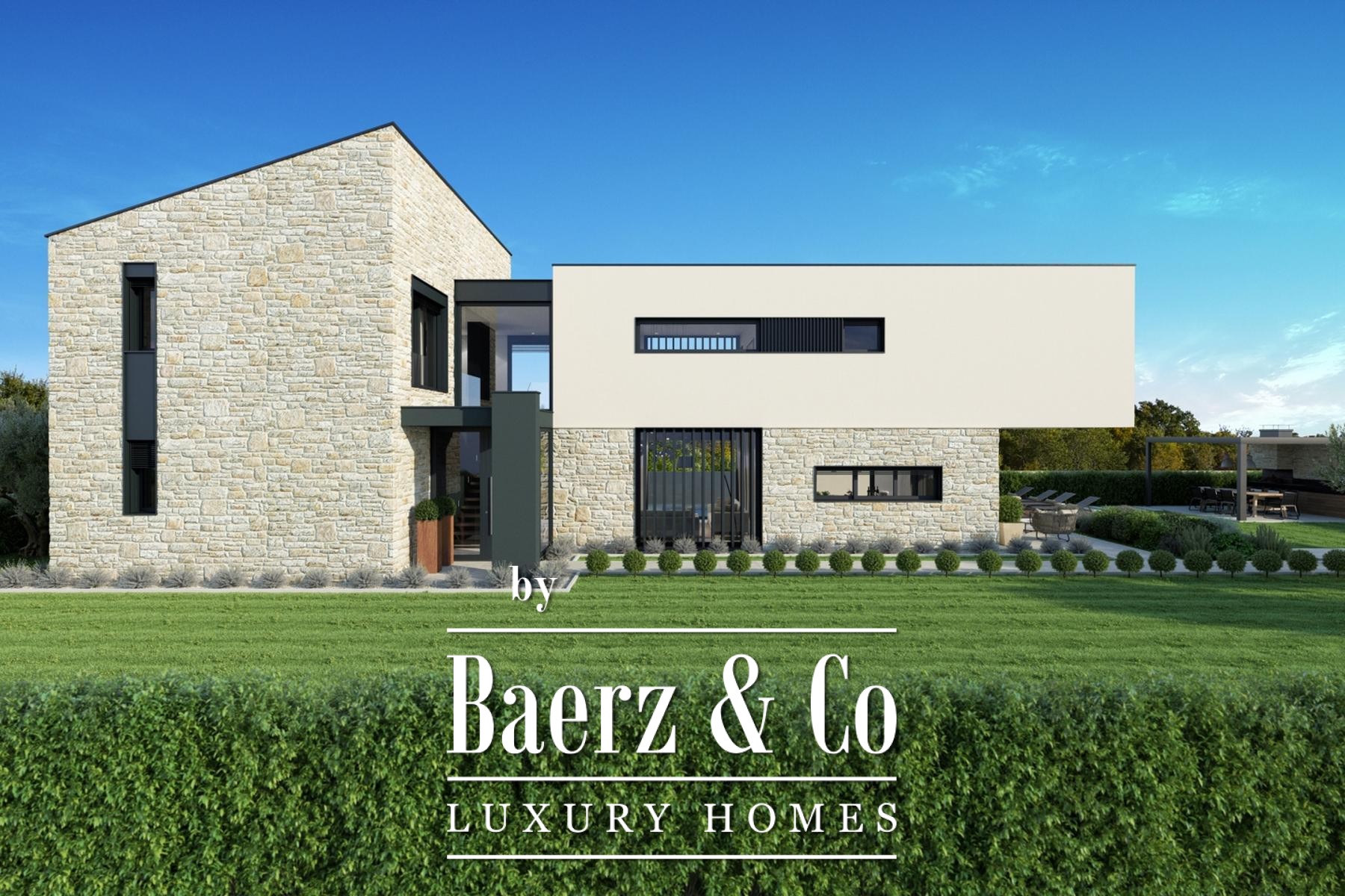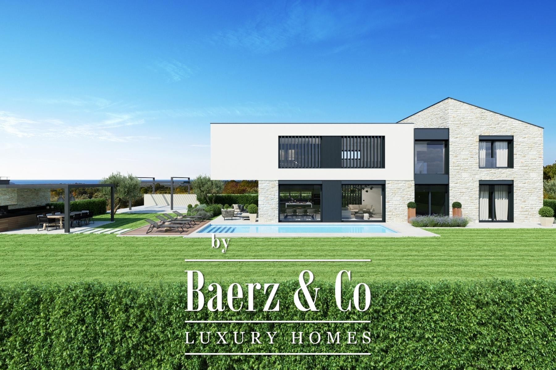 Op de bovenverdieping bieden drie luxe slaapkamers, elk met en suite badkamer, inloopkast en eigen terras, een prachtig uitzicht over het Istrische landschap en de zee. Buiten vindt u een verwarmd zoutwaterzwembad met zonneterras, omgeven door pittoreske wijnlandschappen.