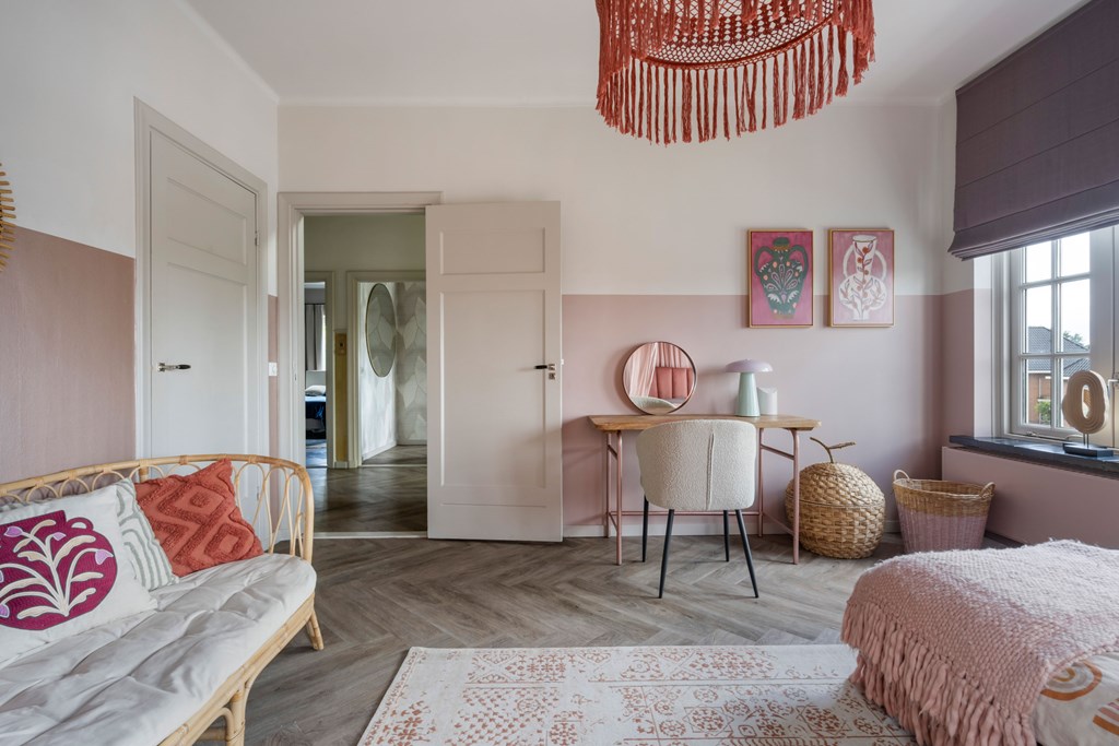 Wanneer u vanuit de hal naar de eerste verdieping gaat, komt u uit bij de indrukwekkende trap die als een rode draad door het huis loopt. Deze statige trap, een blikvanger in de woning, leidt u naar de bovenverdieping.
