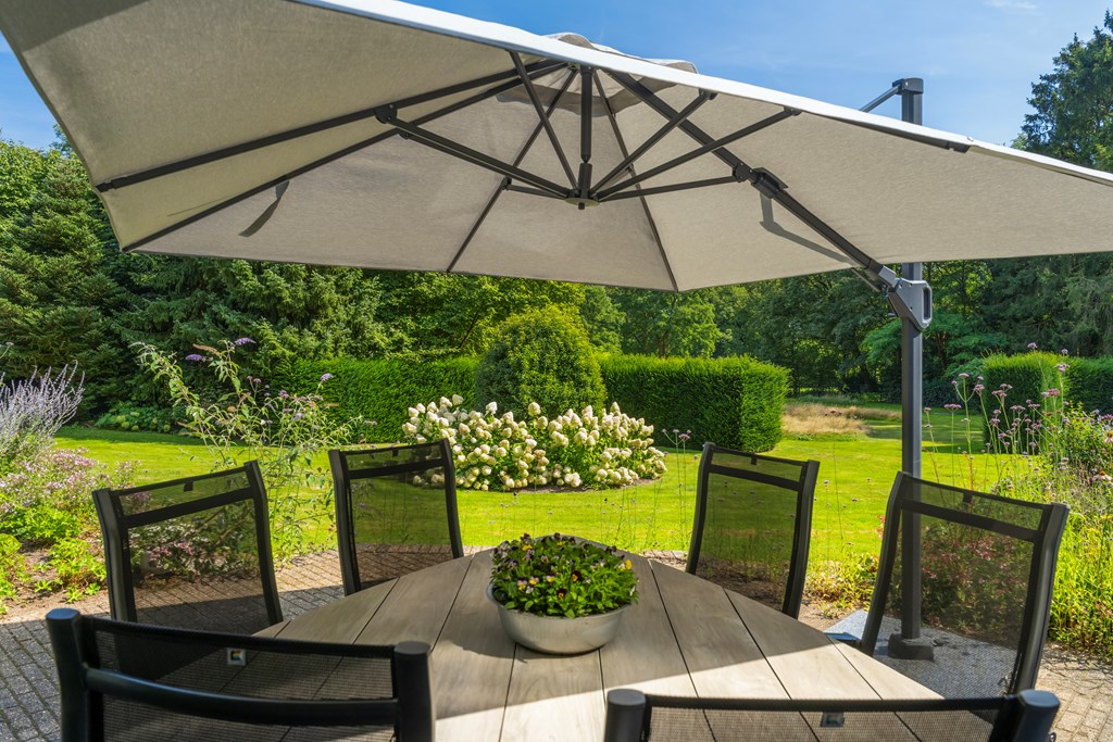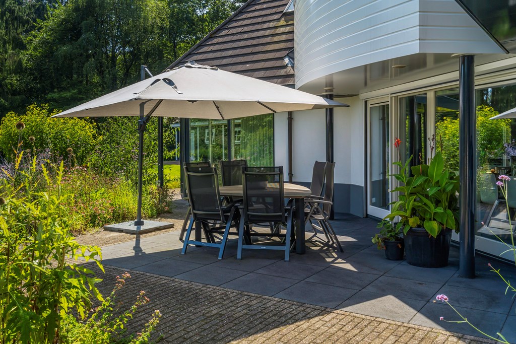 De oprit brengt u naar het prachtige perceel omzoomd door planten en bomen. De weelderige achtertuin op het zuidoosten biedt een groen en open landschap. Met een groot gazon hebben kinderen hier alle ruimte om te spelen of geniet u van de rust, zon en privacy. Een bestraat terras aan het huis biedt een schitterend uitzicht over de tuin. Daarnaast is er een tweede, overdekt terras, waar u op warme dagen in de schaduw kunt ontspannen. Dit terras is onderdeel van de in 2022 nieuw gebouwde kapschuur met bergruimte voor tuingereedschap, tuinstoelen e.d.. Een grote houten schuur (wanden en dak geïsoleerd) met carport en grote berging (2022) zorgen voor voldoende ruimte voor het stallen en/of opbergen van een auto, motor, fietsen, grasmaaier, gereedschap e.d.. Er is nog een derde schuur aanwezig welke o.a. wordt gebruikt voor het stallen van een aanhangwagen. In de tuin is een irrigatiesysteem voor besproeiing van de tuin aanwezig (middels een grondwaterpomp).