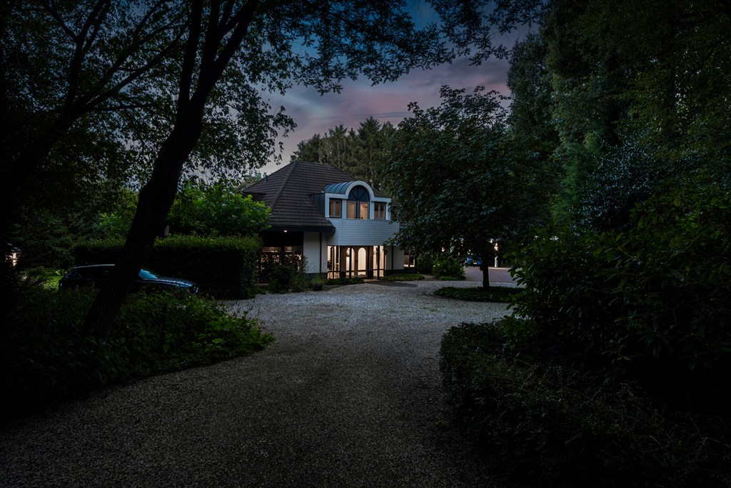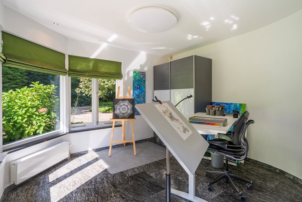 U komt binnen in een ruime, lichte hal die toegang geeft tot de woonkamer, een werkkamer, toiletruimte, meterkast (21 groepen + glasvezel) en de trapopgang. De werkkamer is ideaal en perfect bereikbaar om bijvoorbeeld klanten te ontvangen. De royale woonkamer heeft een bijzondere indeling, waardoor u gemakkelijk verschillende zithoeken kunt creëren. De grote ramen rondom bieden een prachtig uitzicht op de tuin en zorgen voor veel licht. Een sfeervolle gashaard voegt extra warmte toe. Via een dubbele schuifpui loopt u zo de zonnige achtertuin in. Aan de zonnige kant zorgen screens voor extra comfort. De ruime keuken met een eigen deur naar de tuin is ideaal voor het bereiden van maaltijden. Aangrenzend aan de keuken vindt u een bijkeuken met een aanrecht voorzien van spoelbak en aansluitingen voor de wasmachine en droger. De gehele benedenverdieping is voorzien van een natuurstenen vloer met vloerverwarming. In de woonkamer bevindt zich ook een airco.